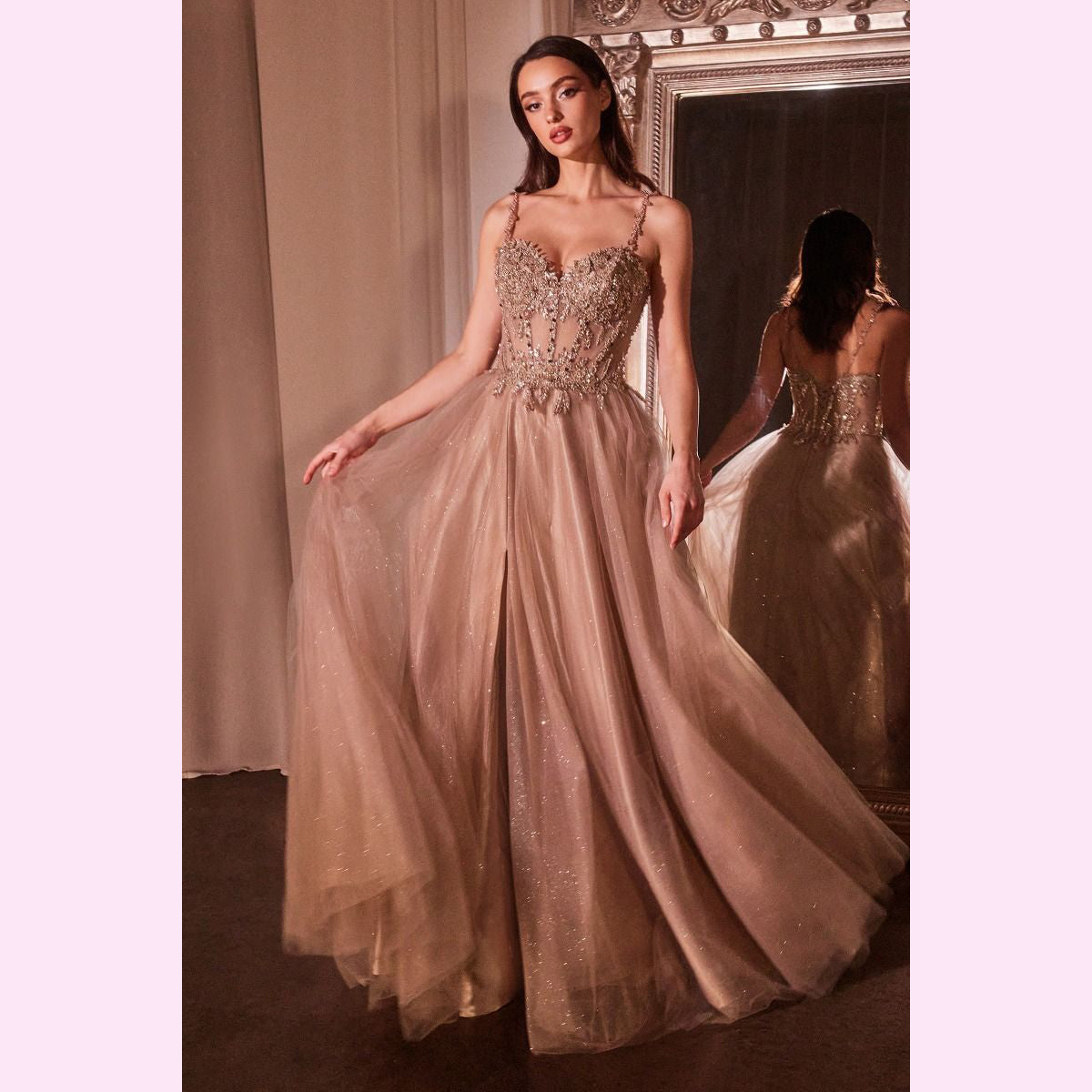 Vestido corte princesa con escote corazón, vista de corsé con transparencia en tul, es recomendado para cuerpos tipo Triangulo Invertido y Rectángulo.