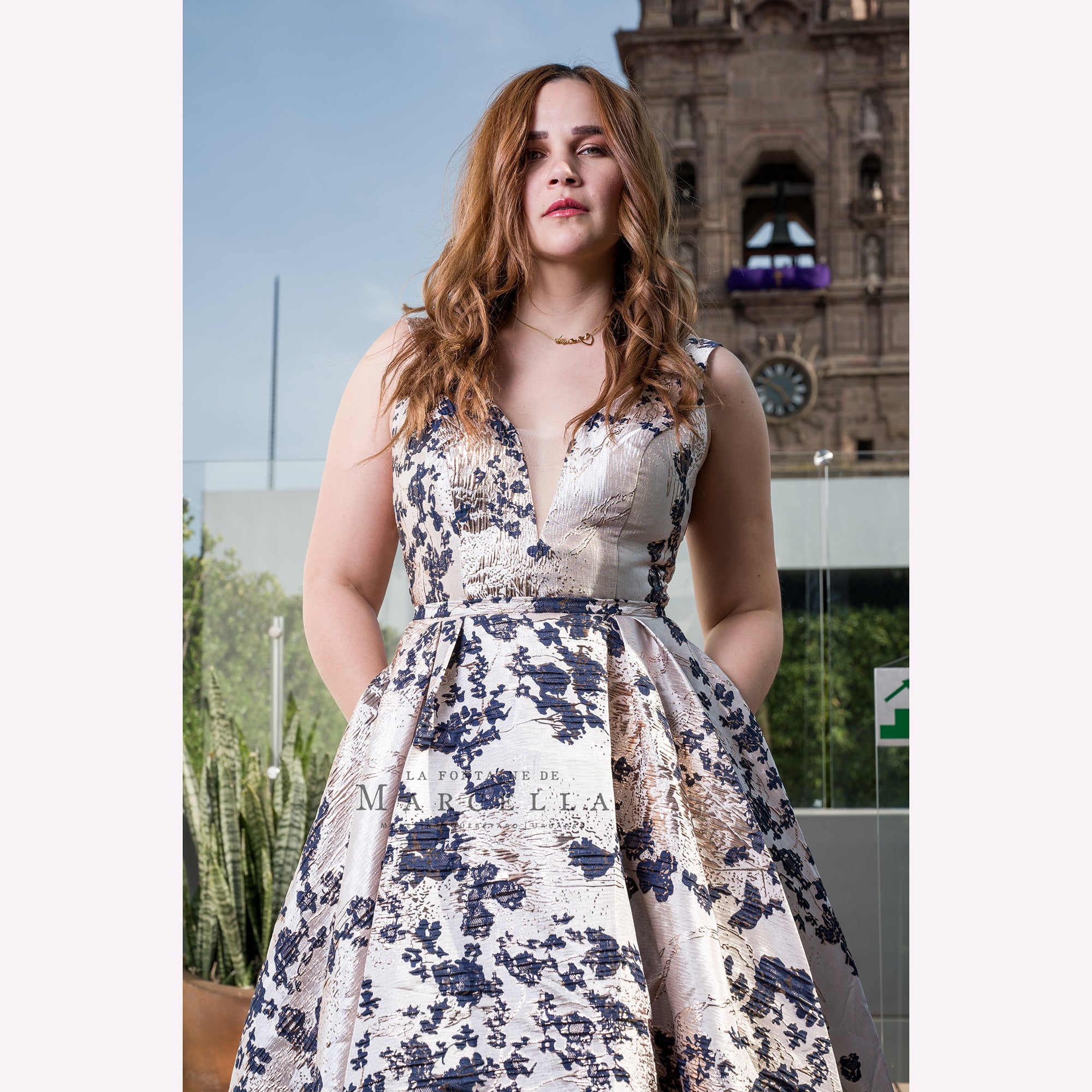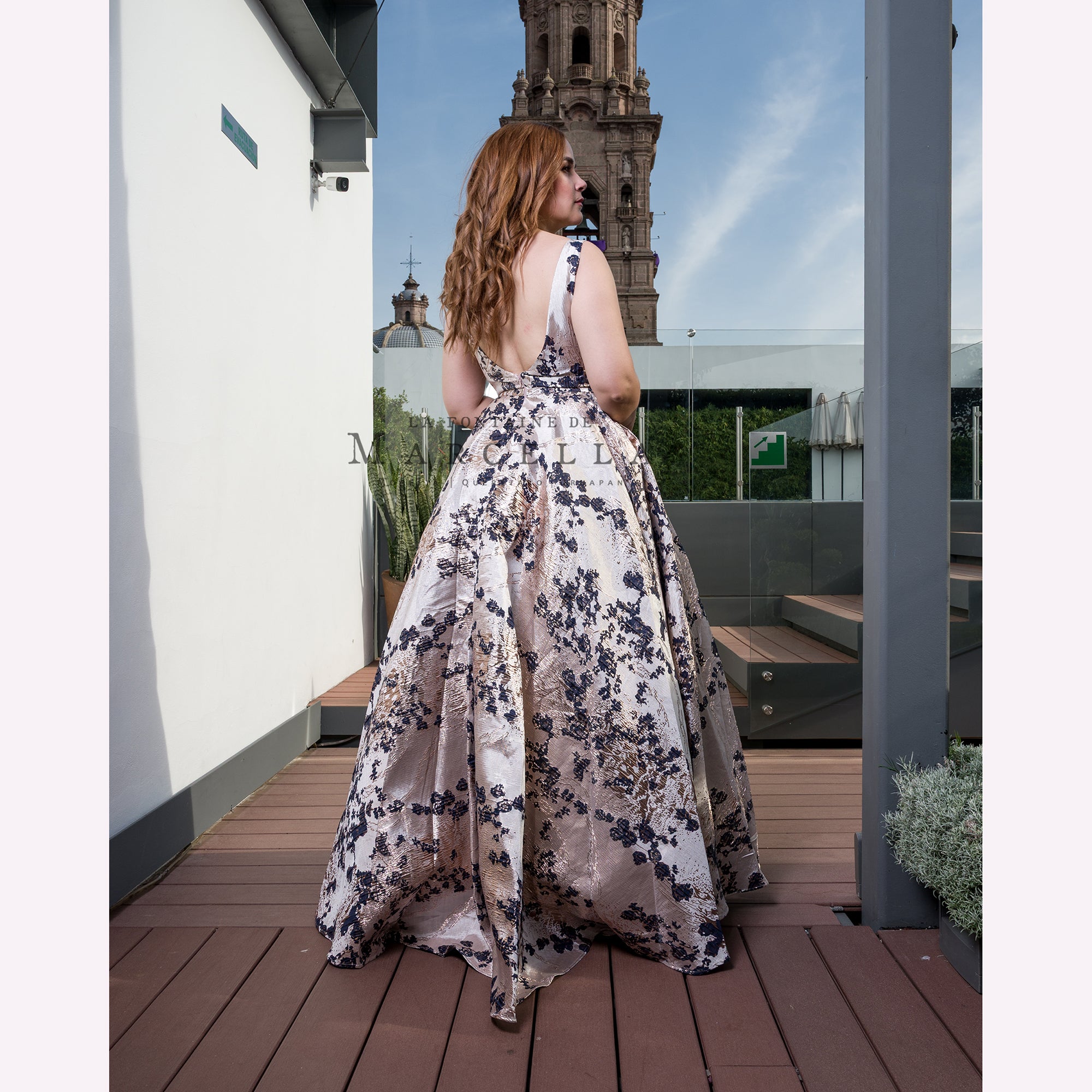 Vestido largo corte en A con escote en V, la tela tiene ligero relieve, es recomendado para cuerpos tipo Manzana y Triangulo Invertido.