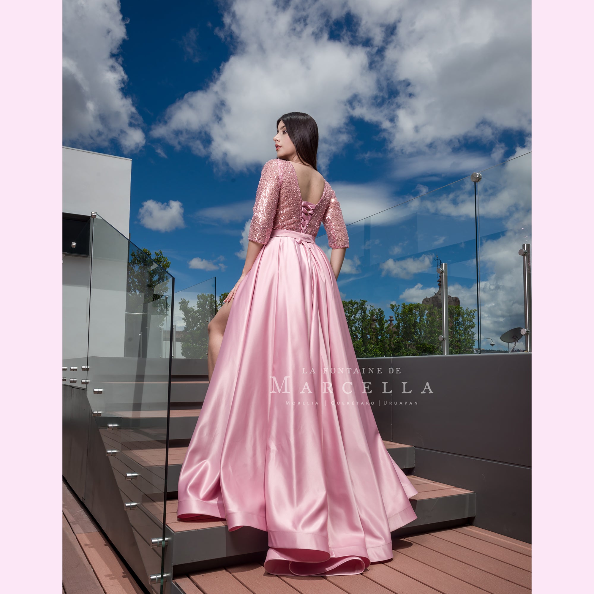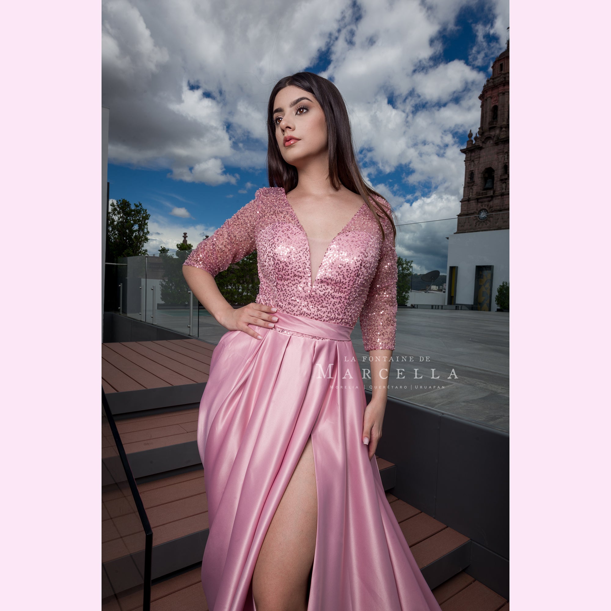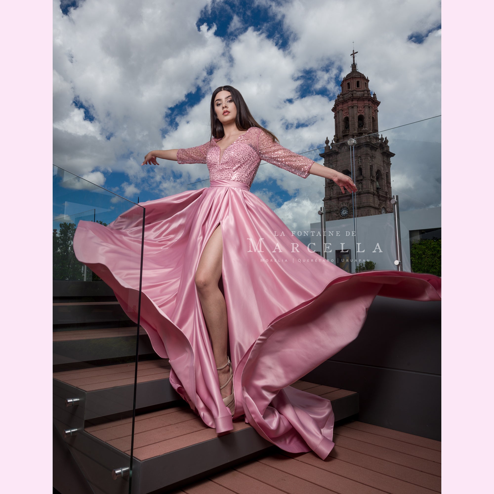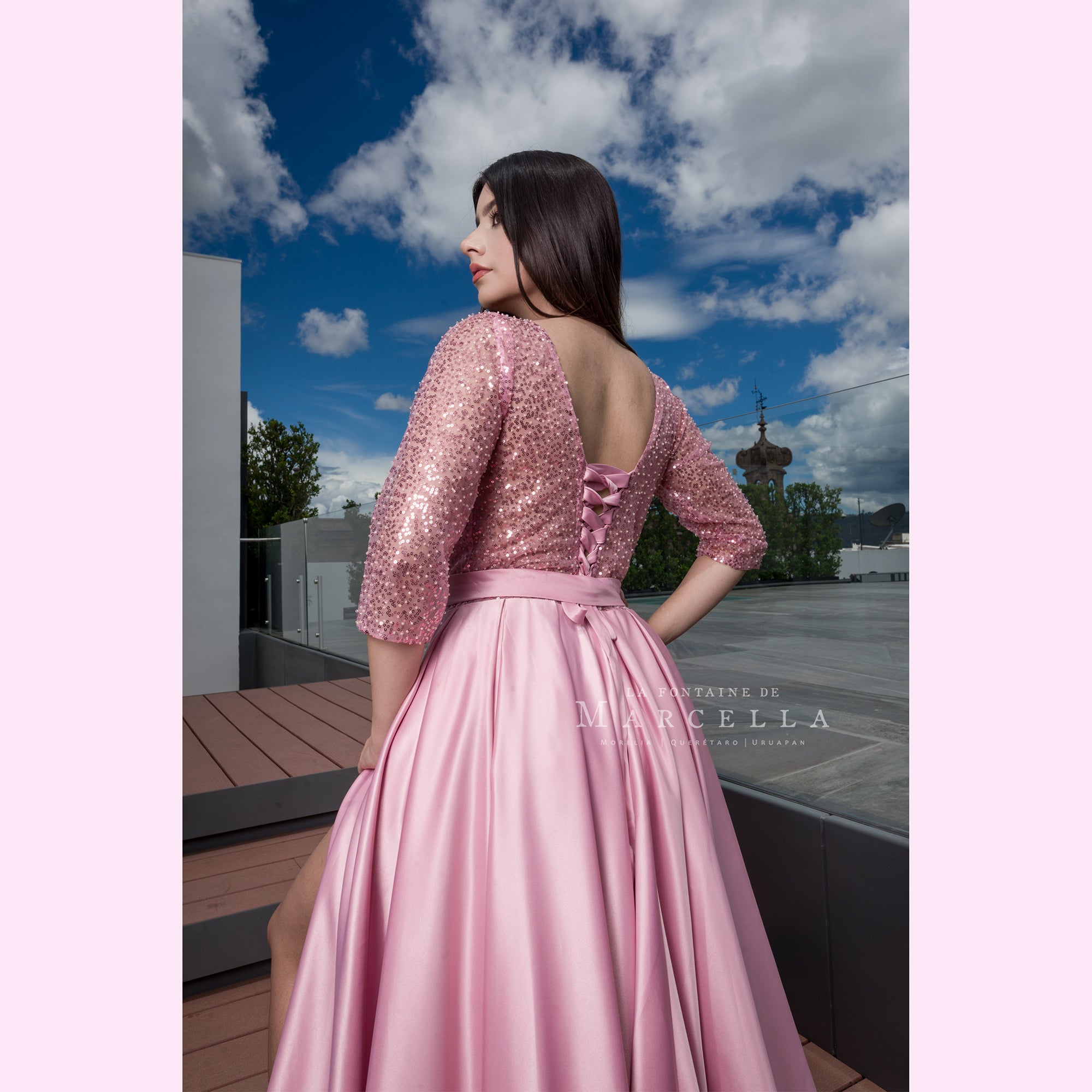 Vestido largo corte en A con transparencia en la parte superior y manga larga, es recomendado para cuerpos tipo Rectángulo y Manzana.