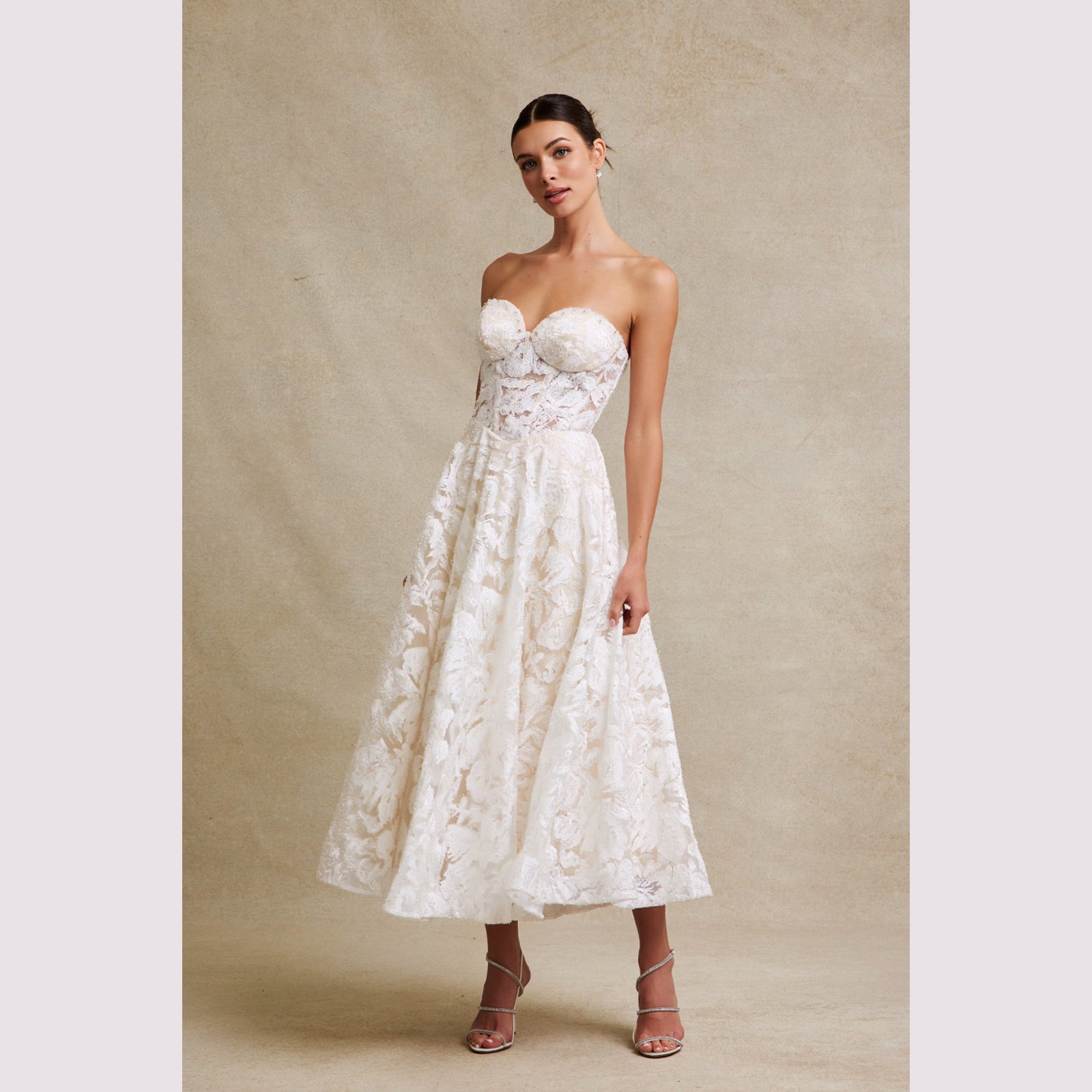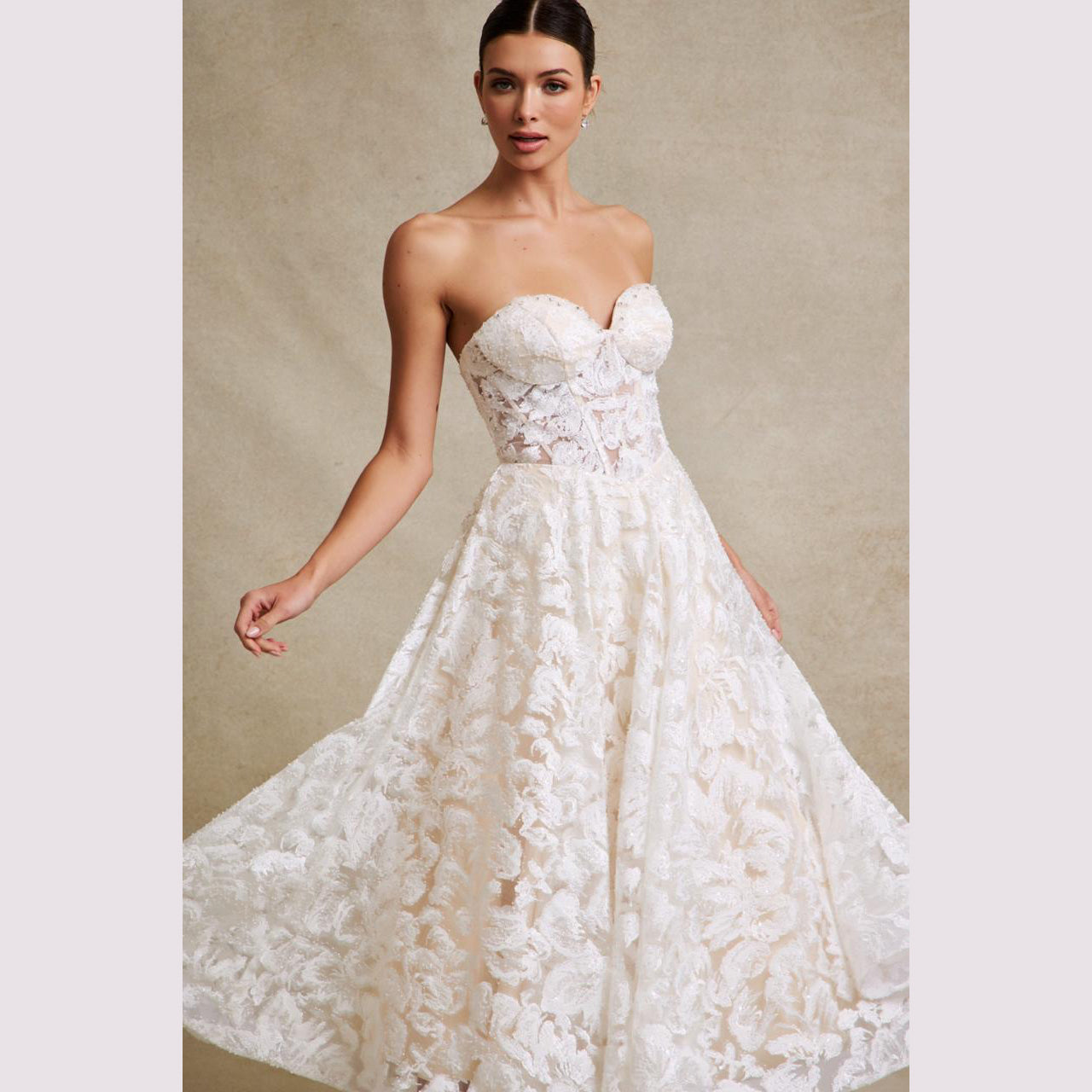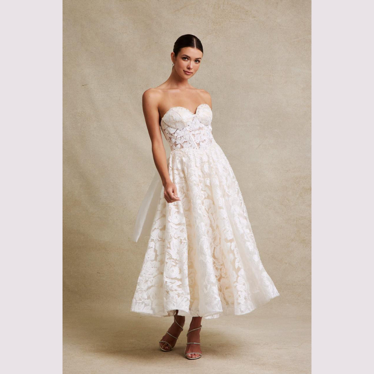 Vestido midi corte en a con escote corazón y en tela con vista de encaje y hermoso detalle en la parte trasera, es recomendado para cuerpos tipo Rectángulo y Pera.