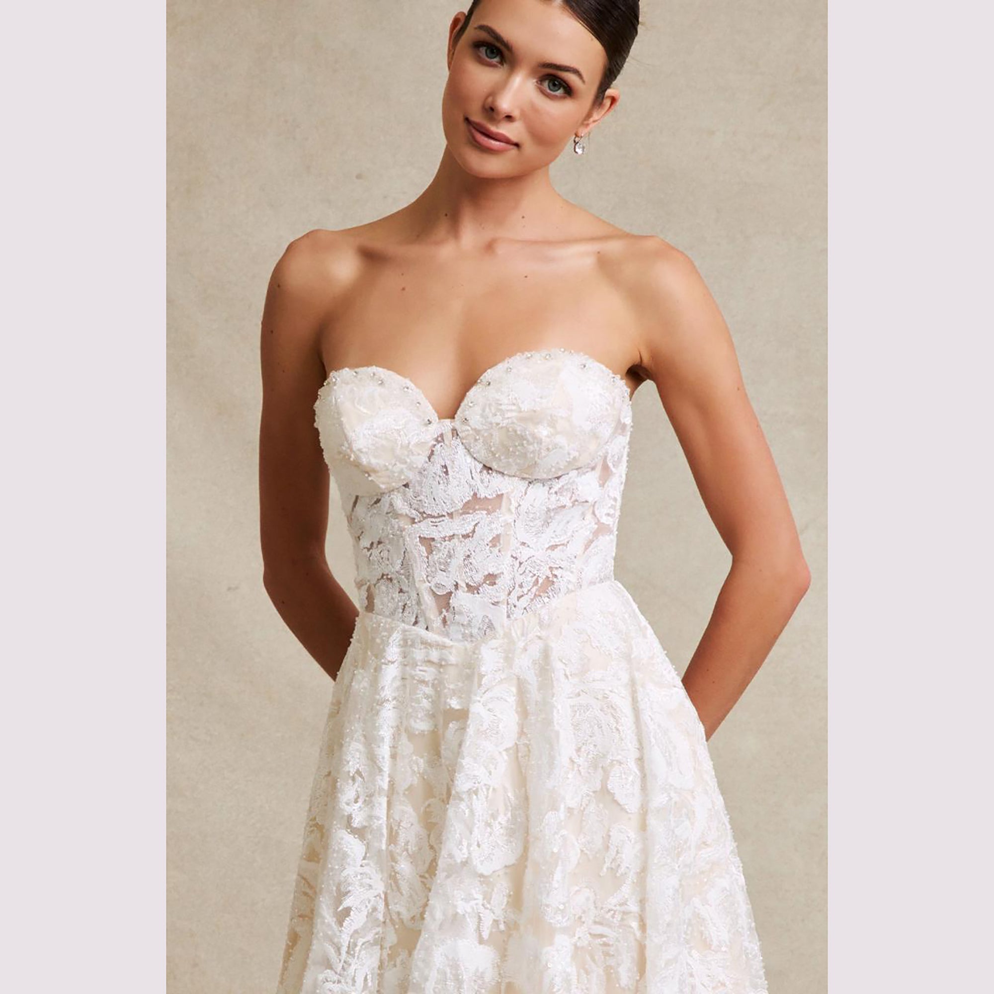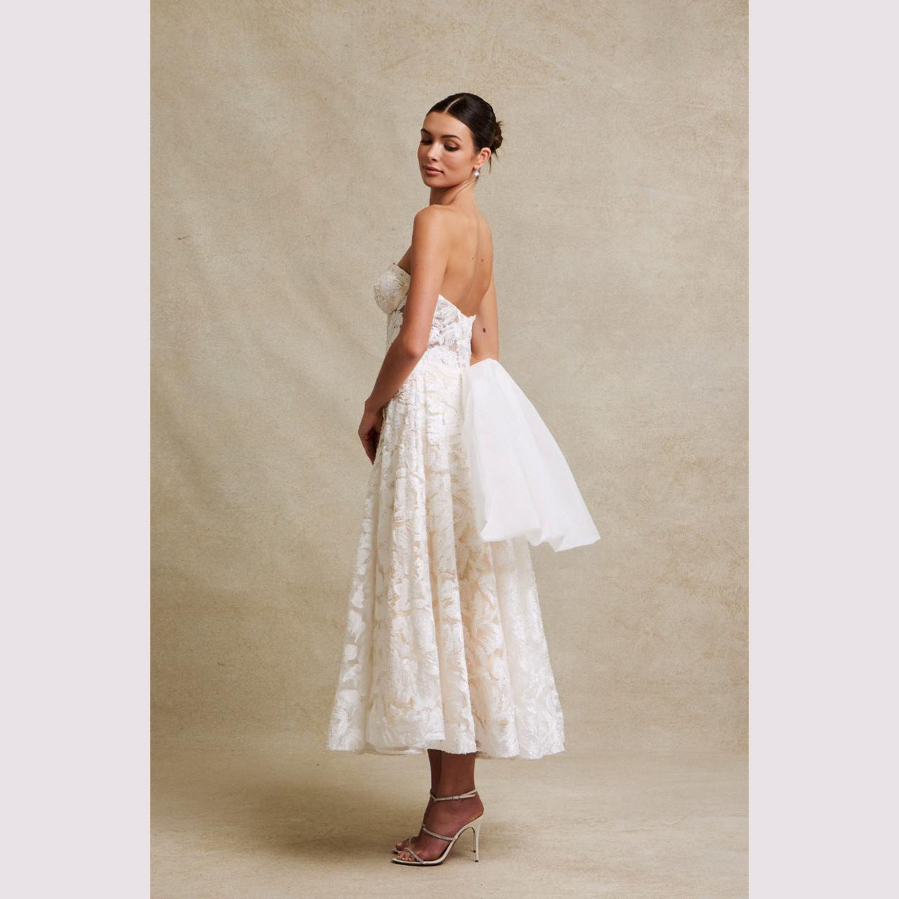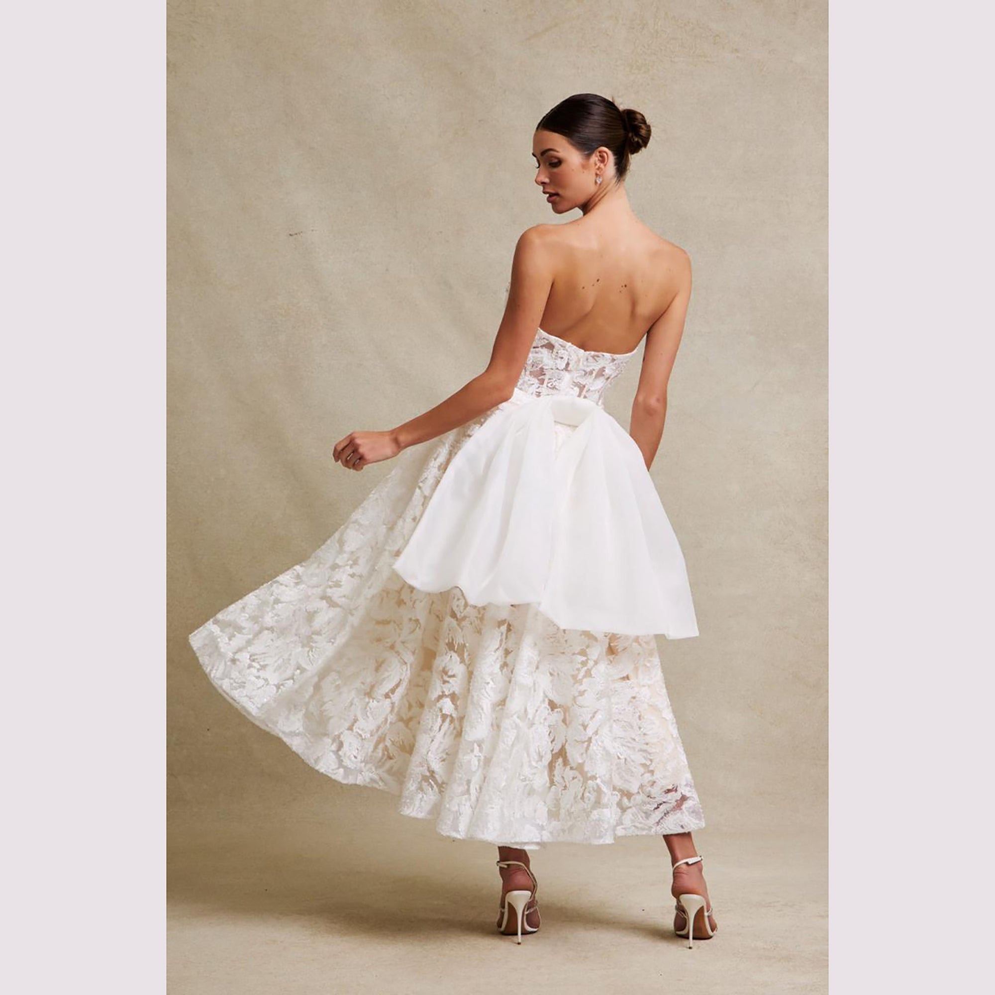 Vestido midi corte en a con escote corazón y en tela con vista de encaje y hermoso detalle en la parte trasera, es recomendado para cuerpos tipo Rectángulo y Pera.