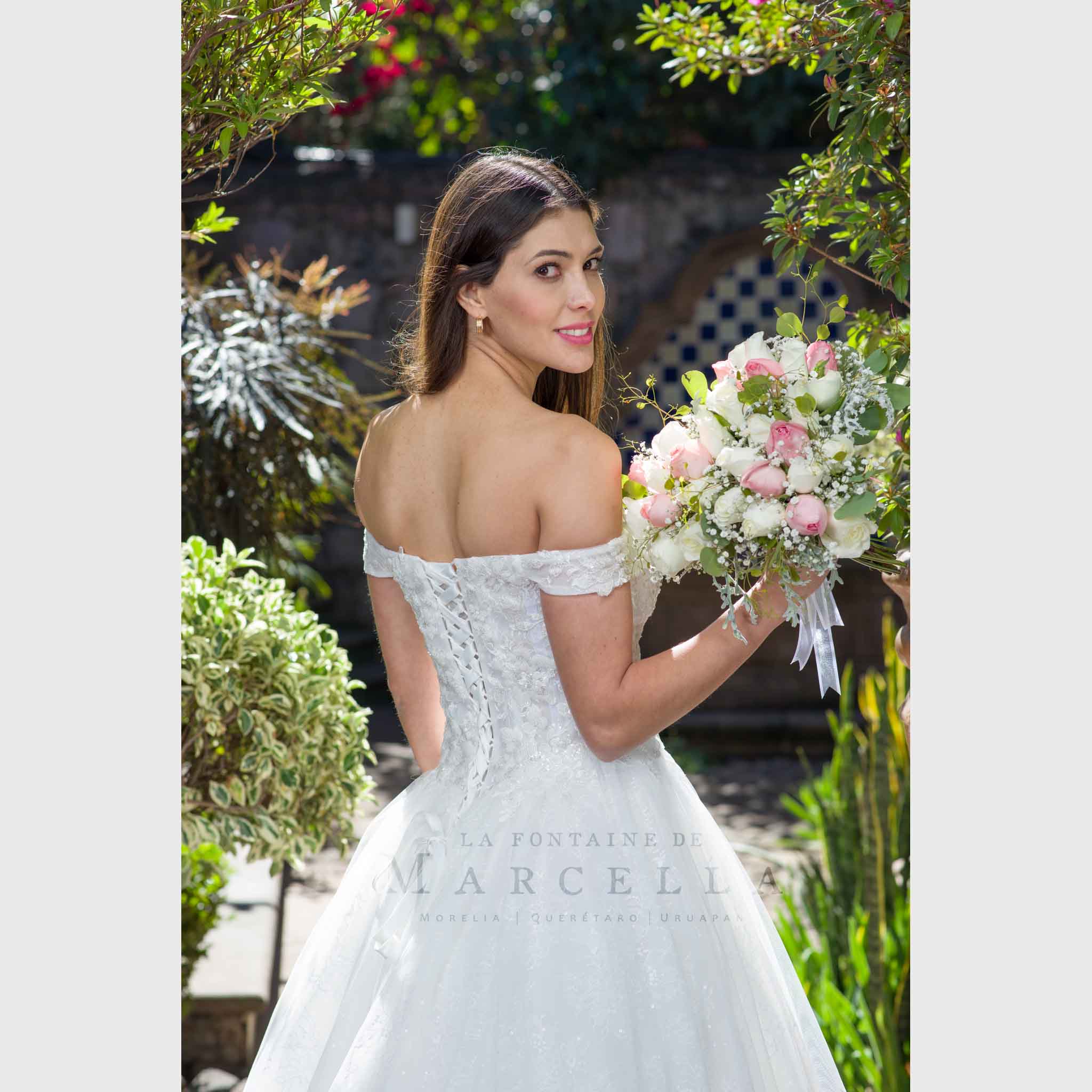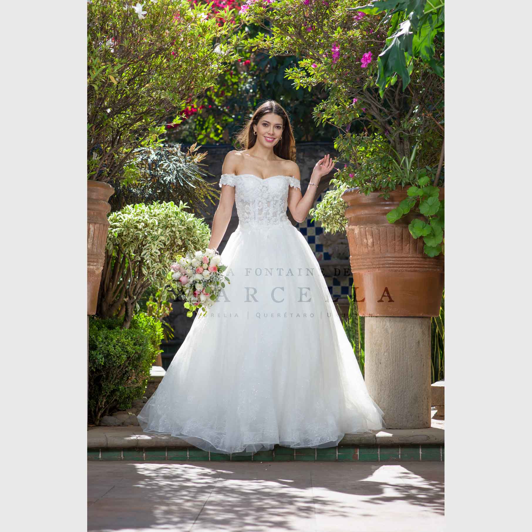 Vestido de Novia con cuello de ojal y corte princesa, recomendado para cuerpos tipo Triangulo Invertido y Pera.