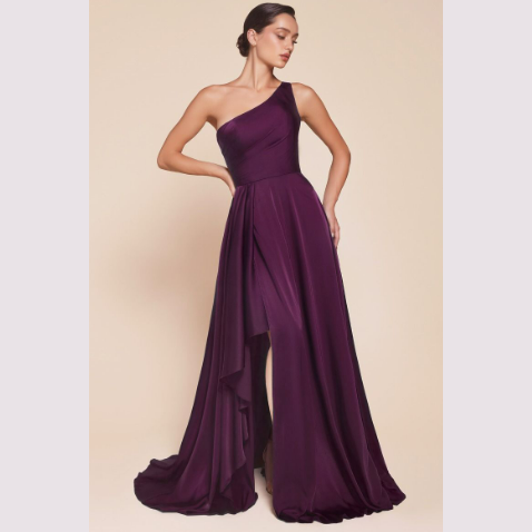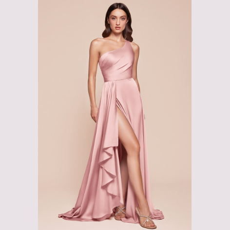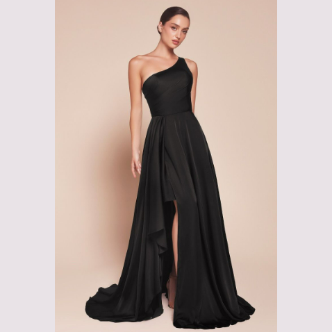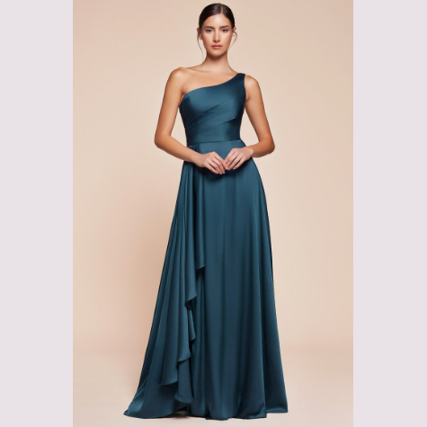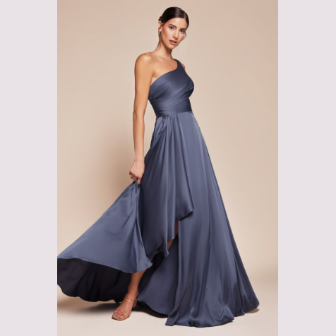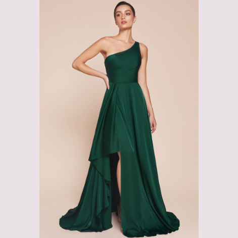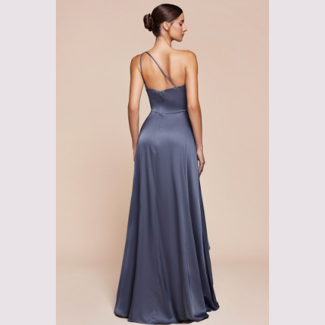Vestido corte en A con corte asimétrico de un solo tirante, es recomendado para cuerpos tipo Rectángulo y Triangulo Invertido.