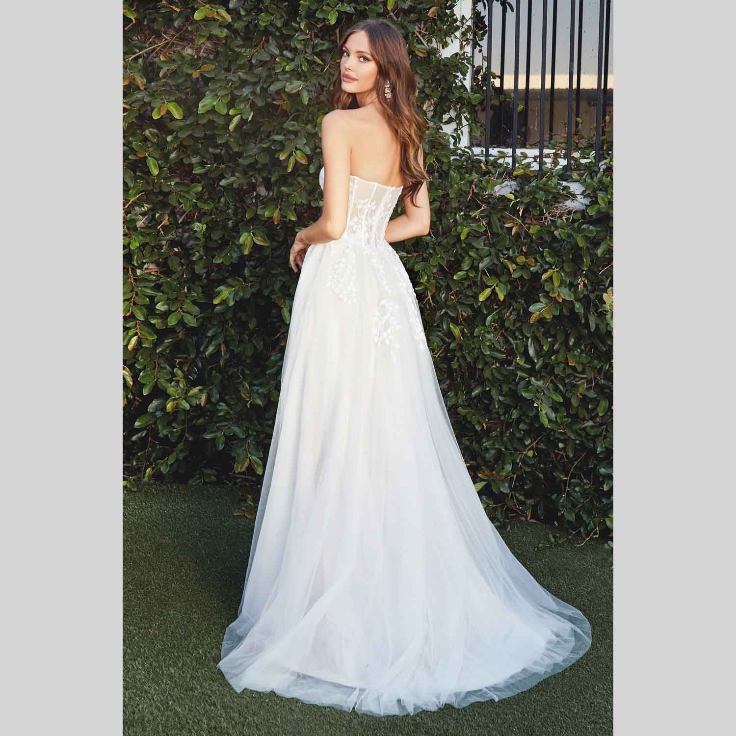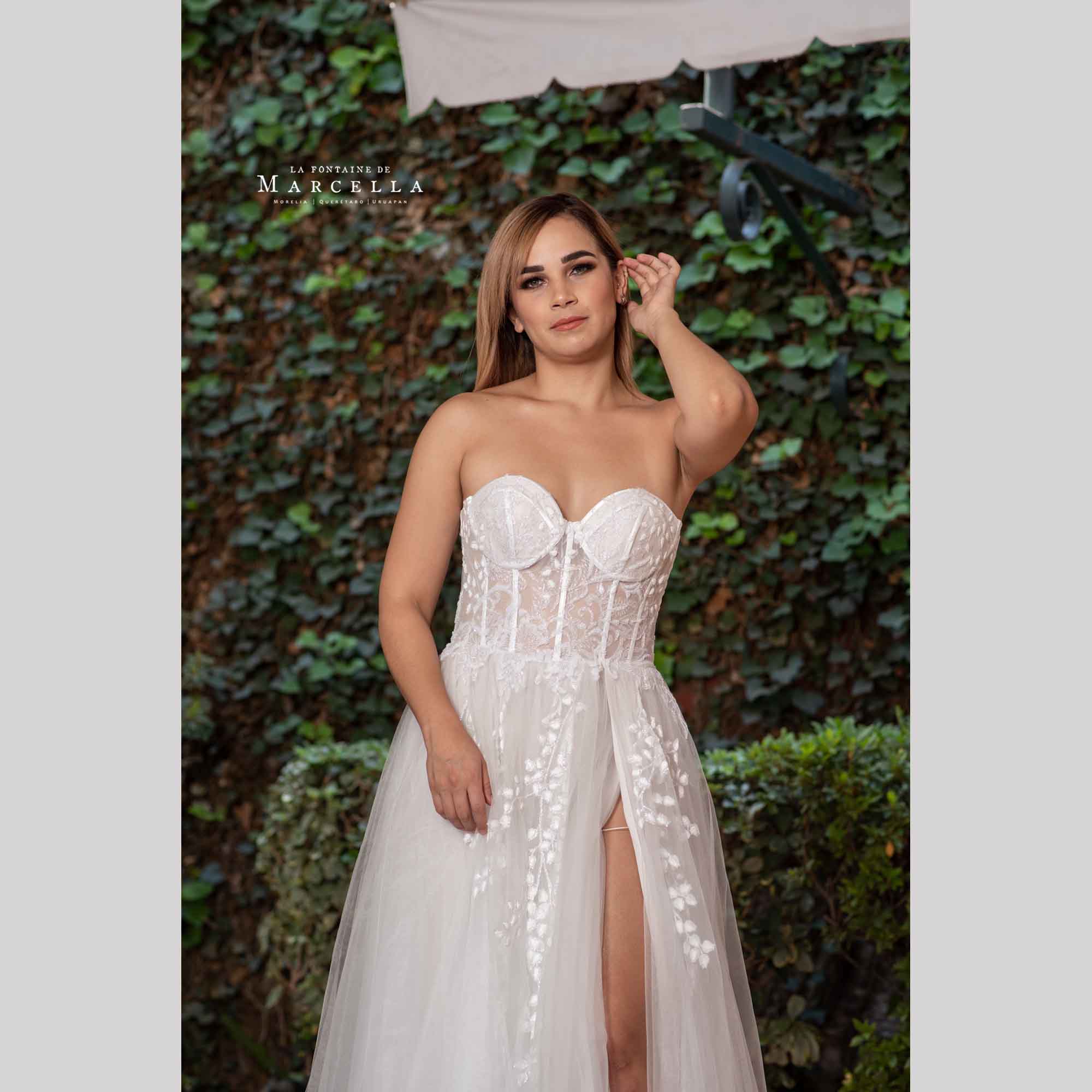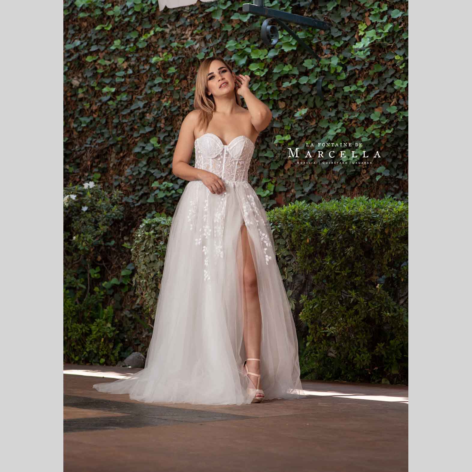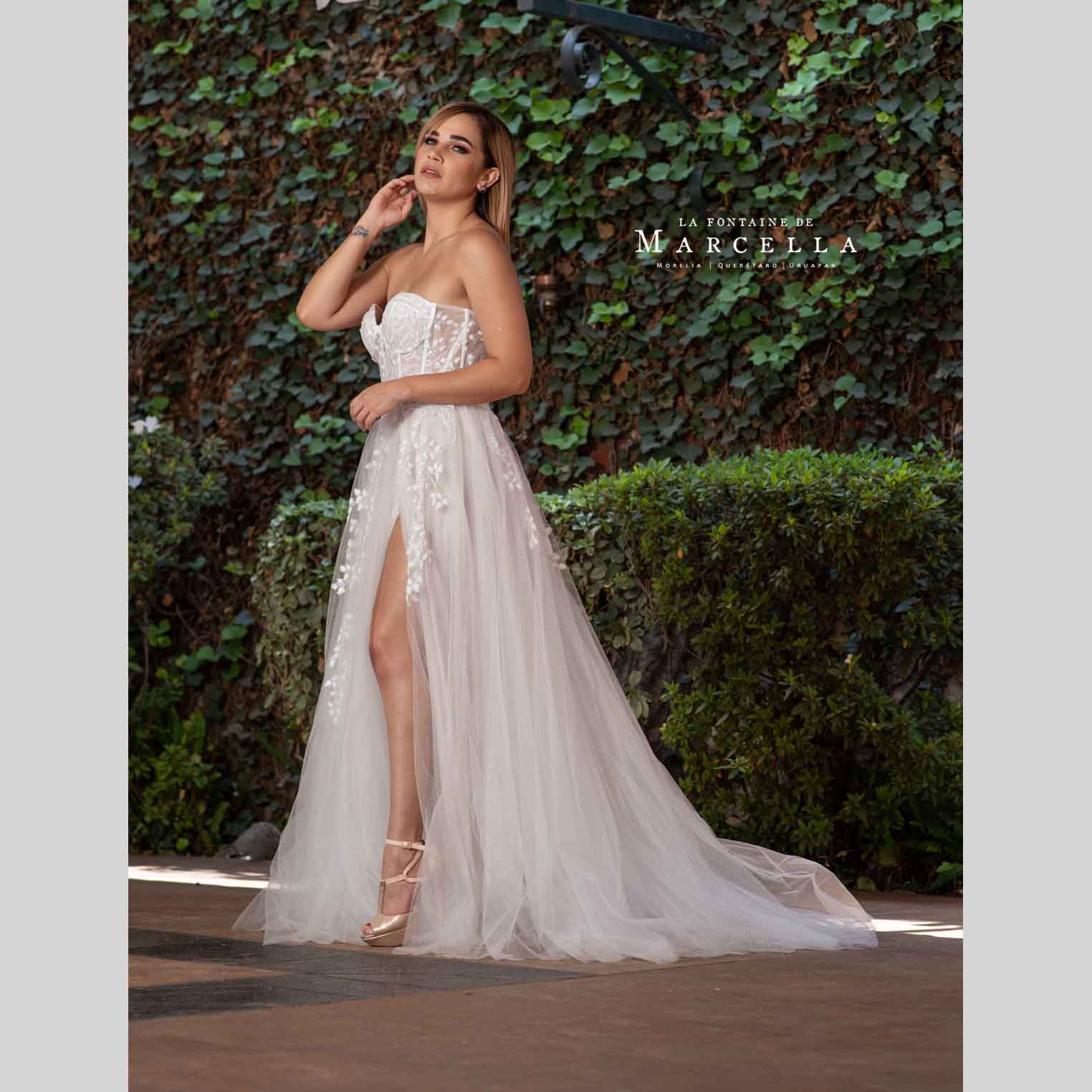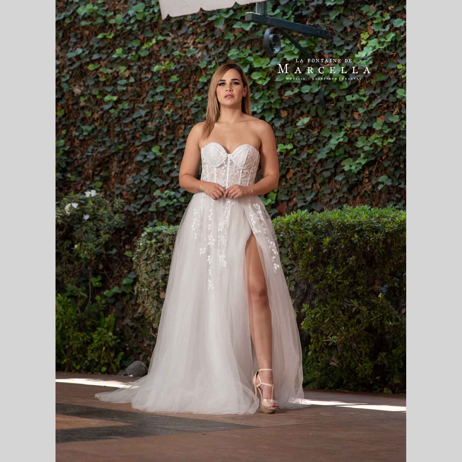 Vestido blanco con vista de cose y transparencias, adornado con aplicación en forma de pétalos con relieve se recomienda para cuerpos tipo Triangulo Invertido y Reloj de Arena.Leer más
