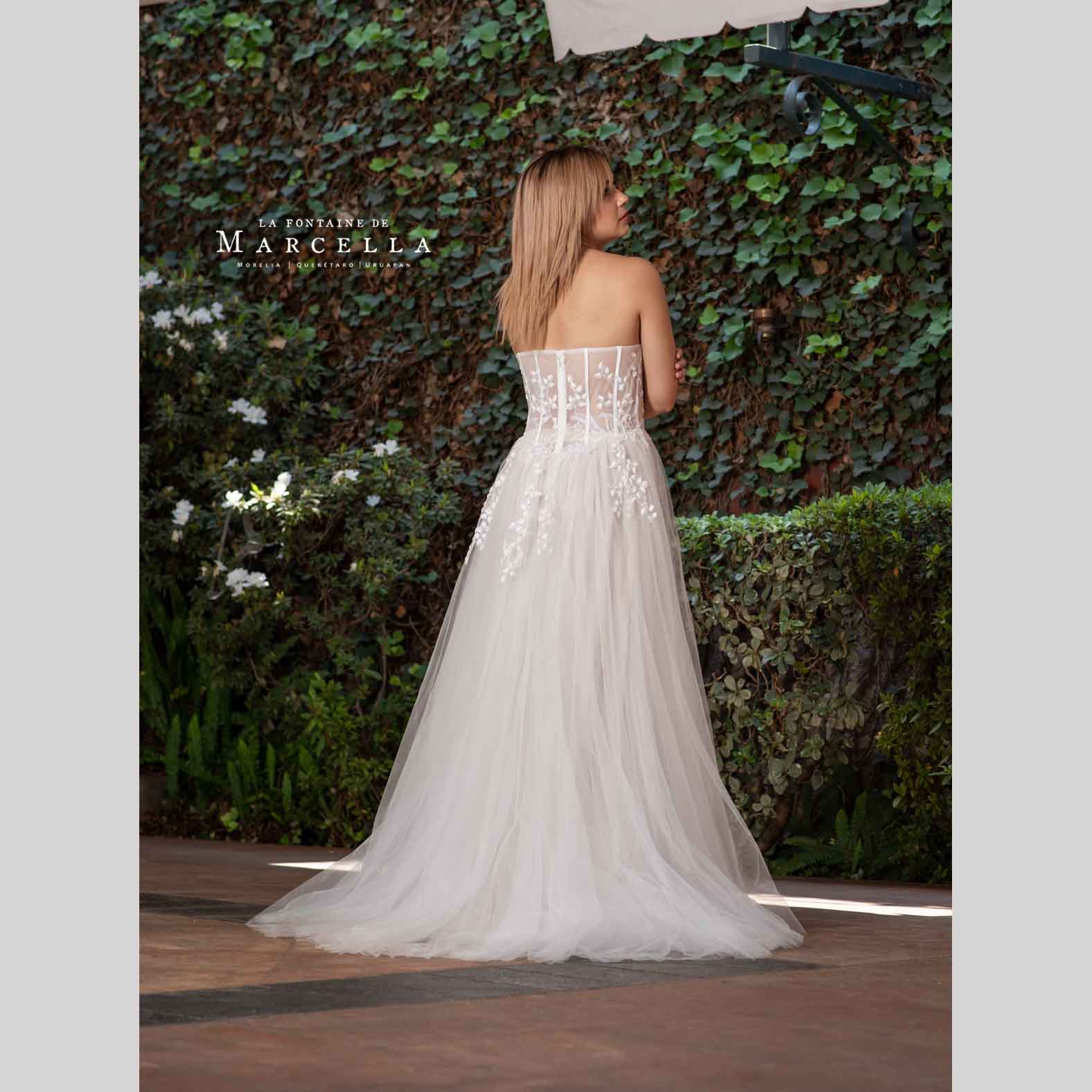 Vestido blanco con vista de cose y transparencias, adornado con aplicación en forma de pétalos con relieve se recomienda para cuerpos tipo Triangulo Invertido y Reloj de Arena.