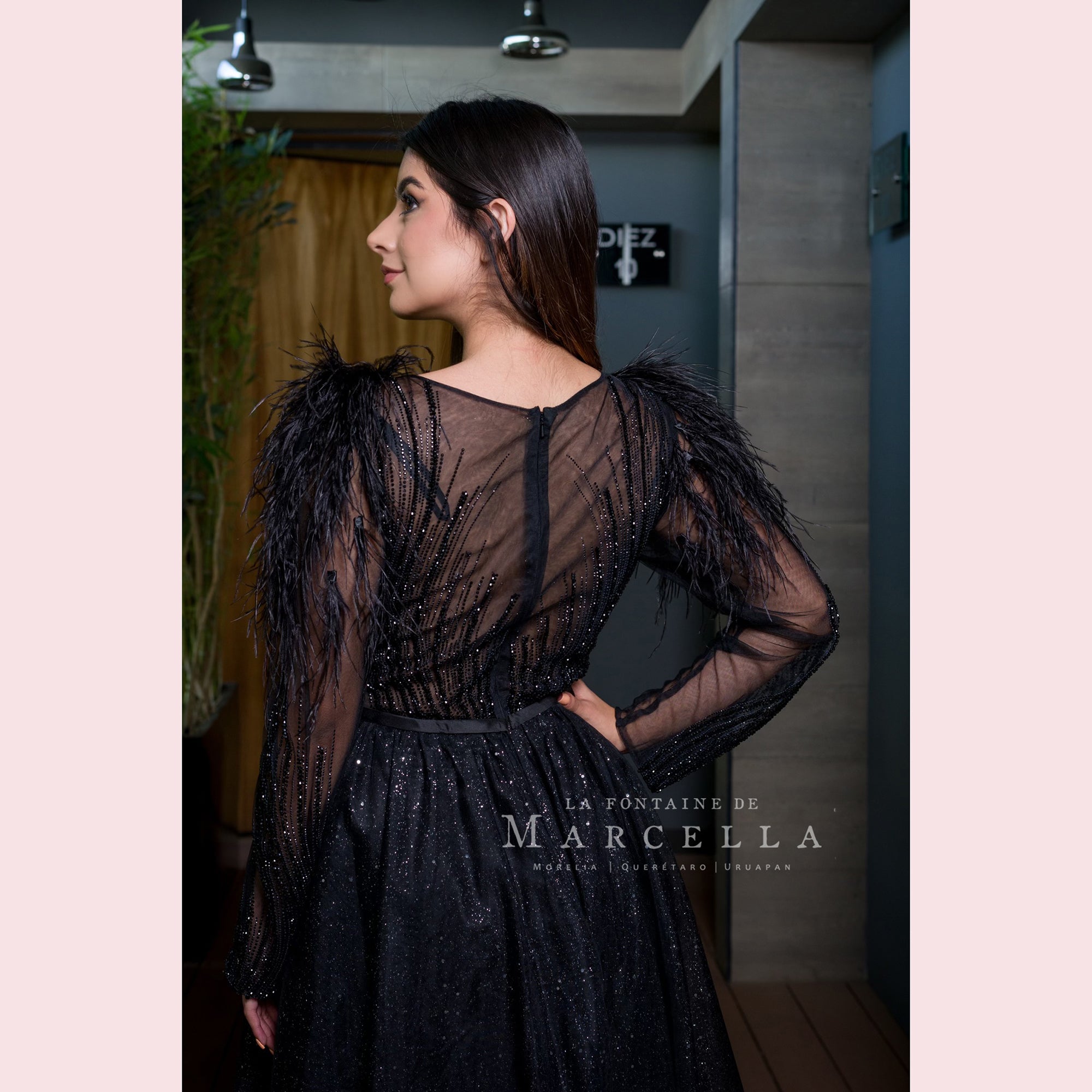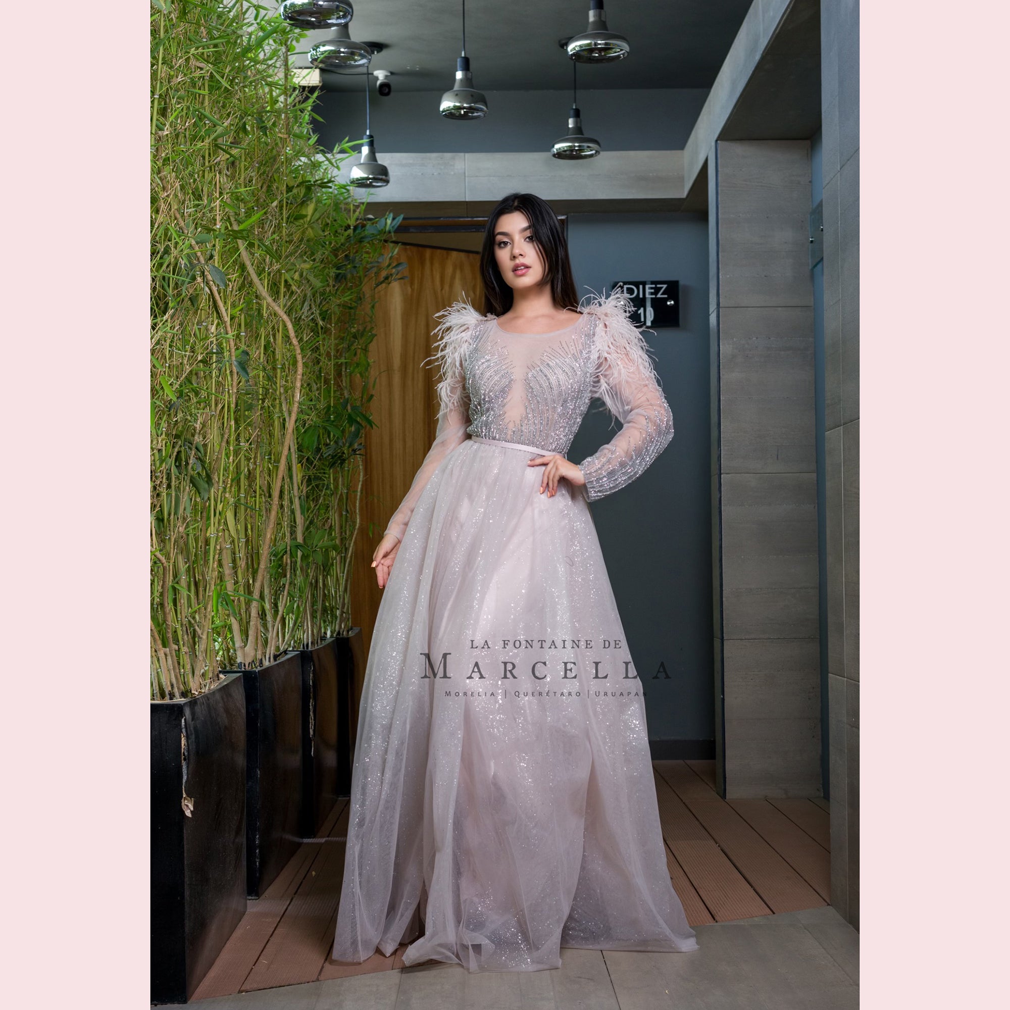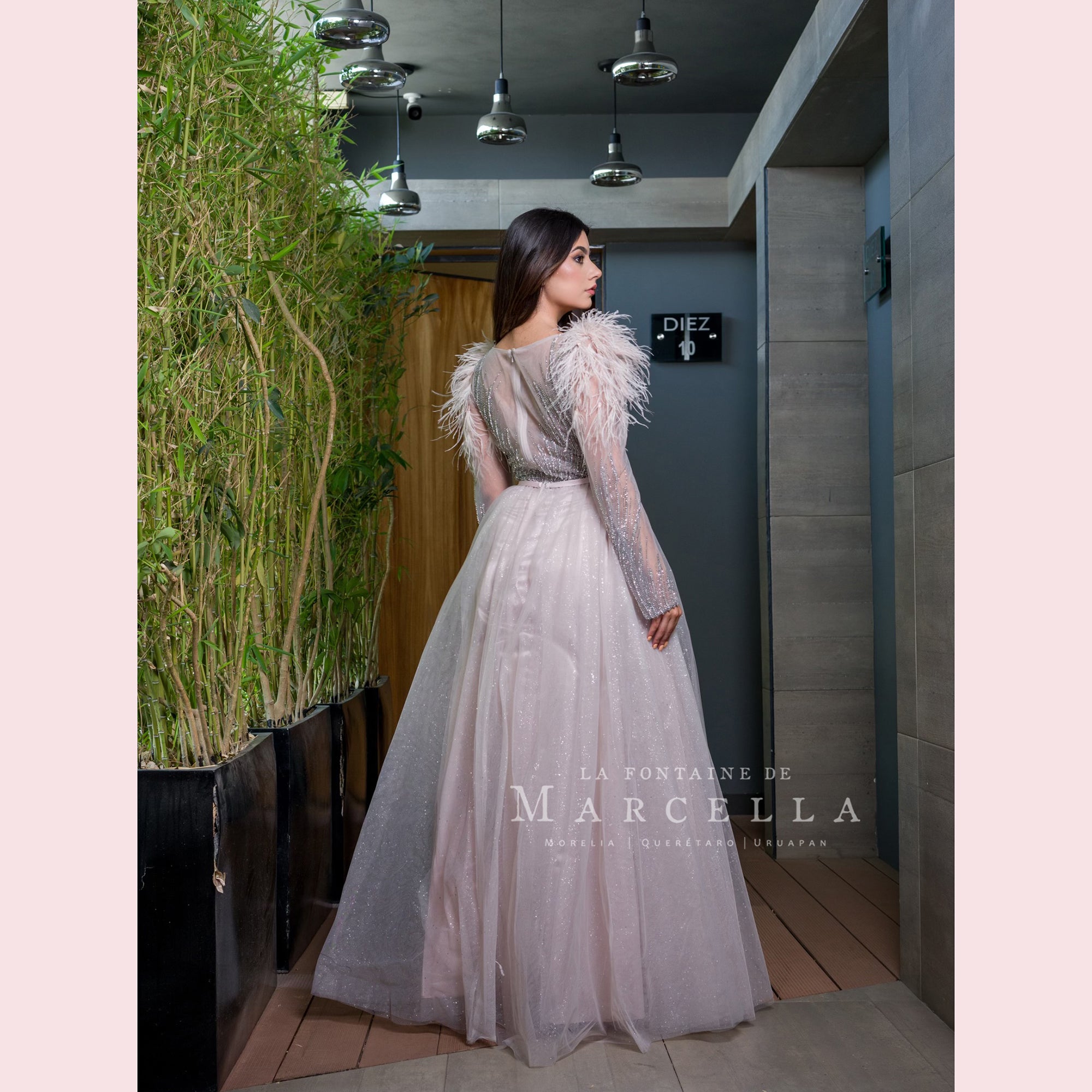 Vestido de manga larga adornado hermosamente con pedrería de fantasía y pluma en los hombros, de corte A en tul es recomendado para cuerpos tipo Rectángulo y Pera.Leer más