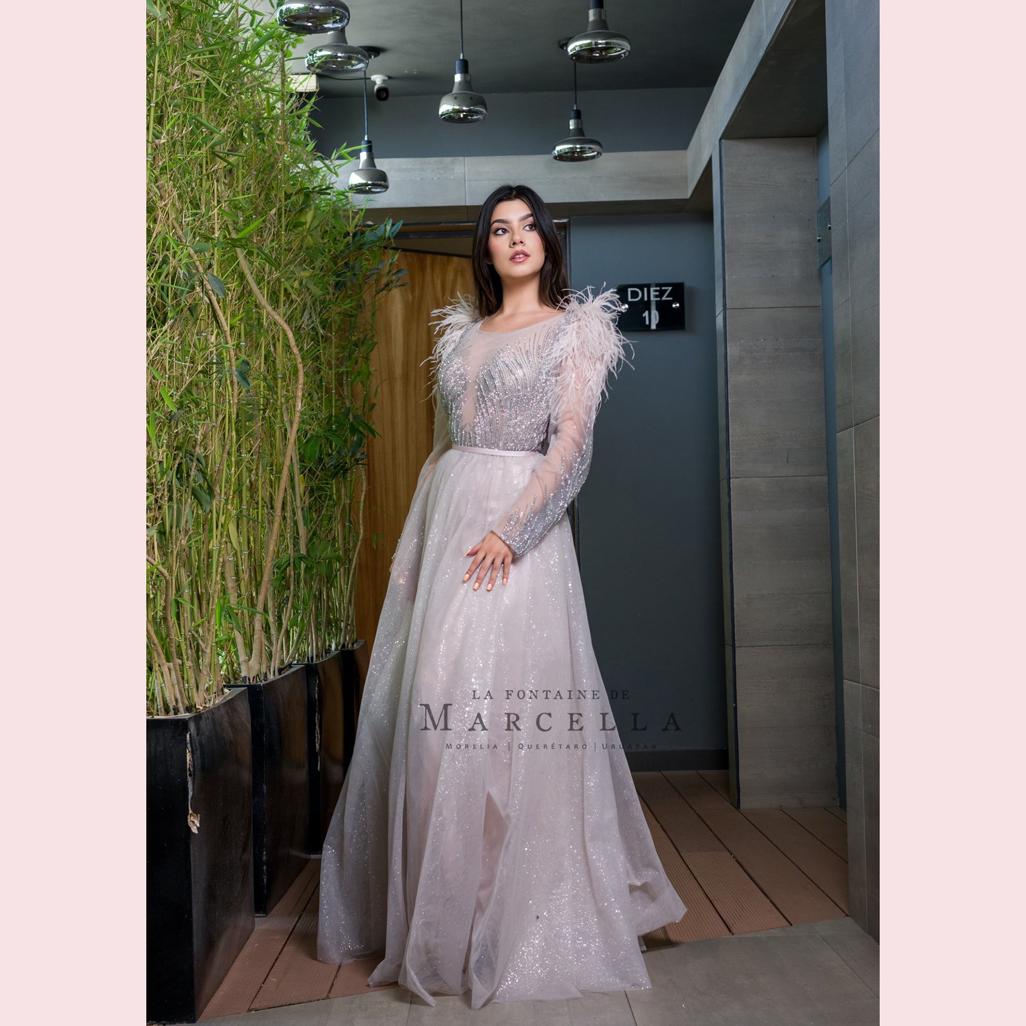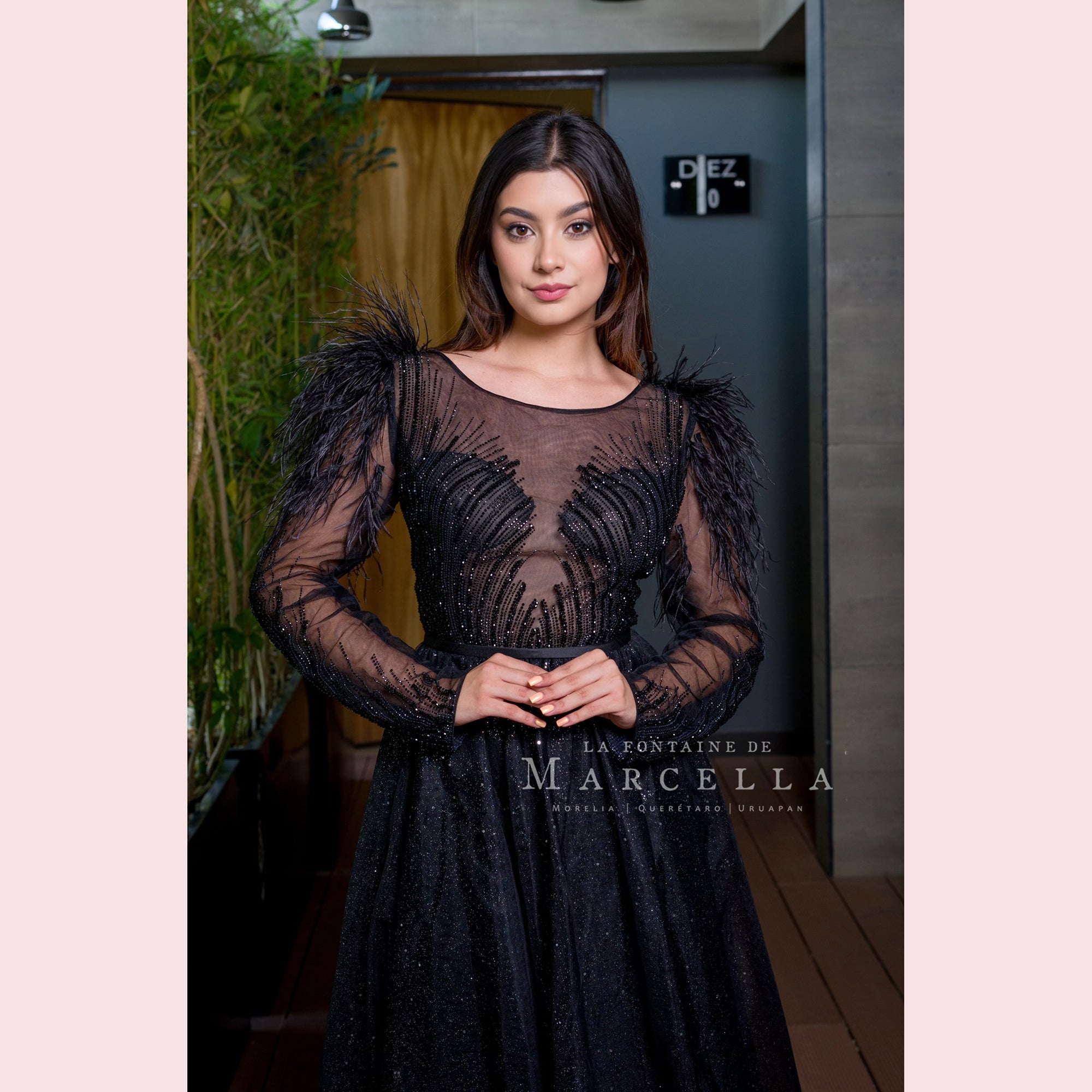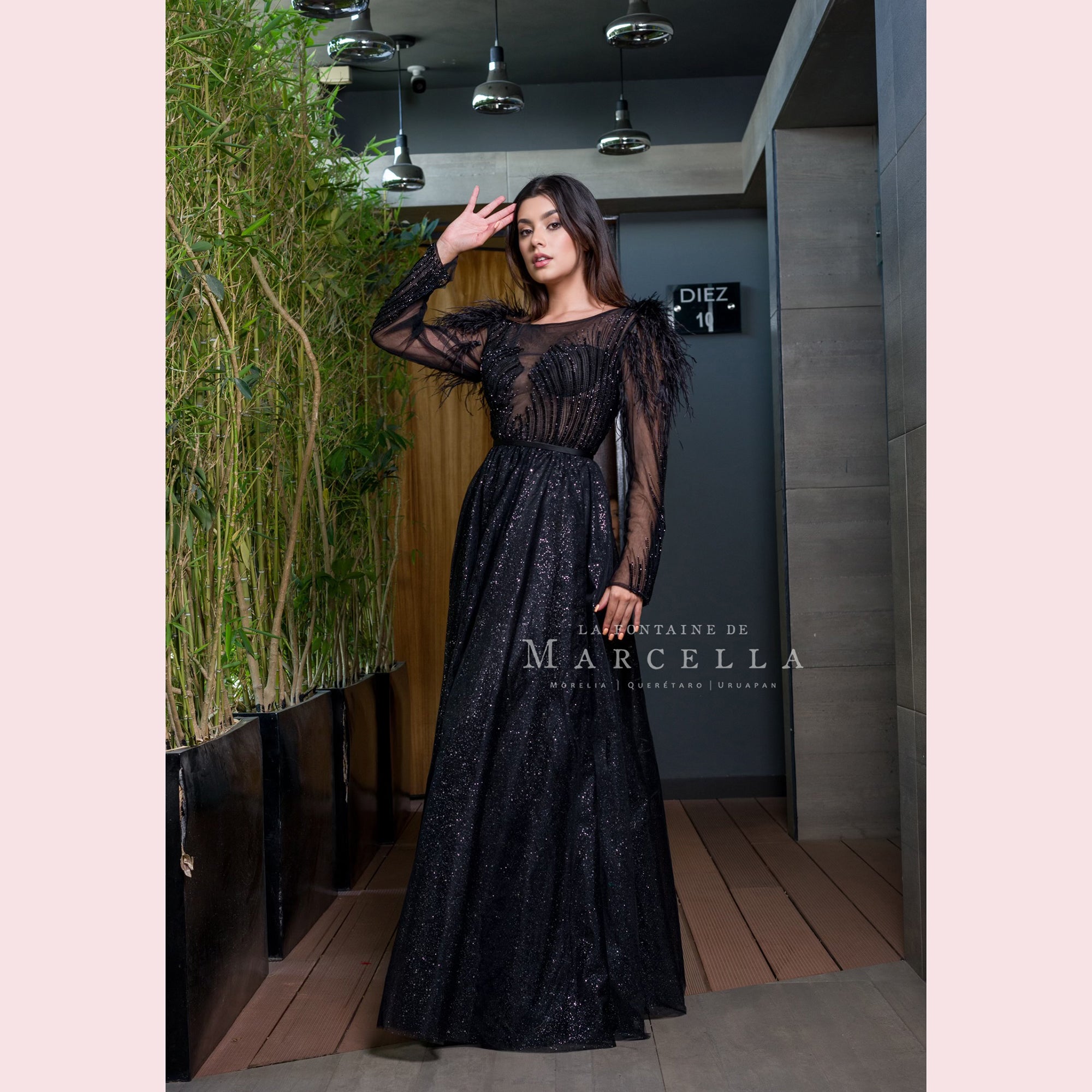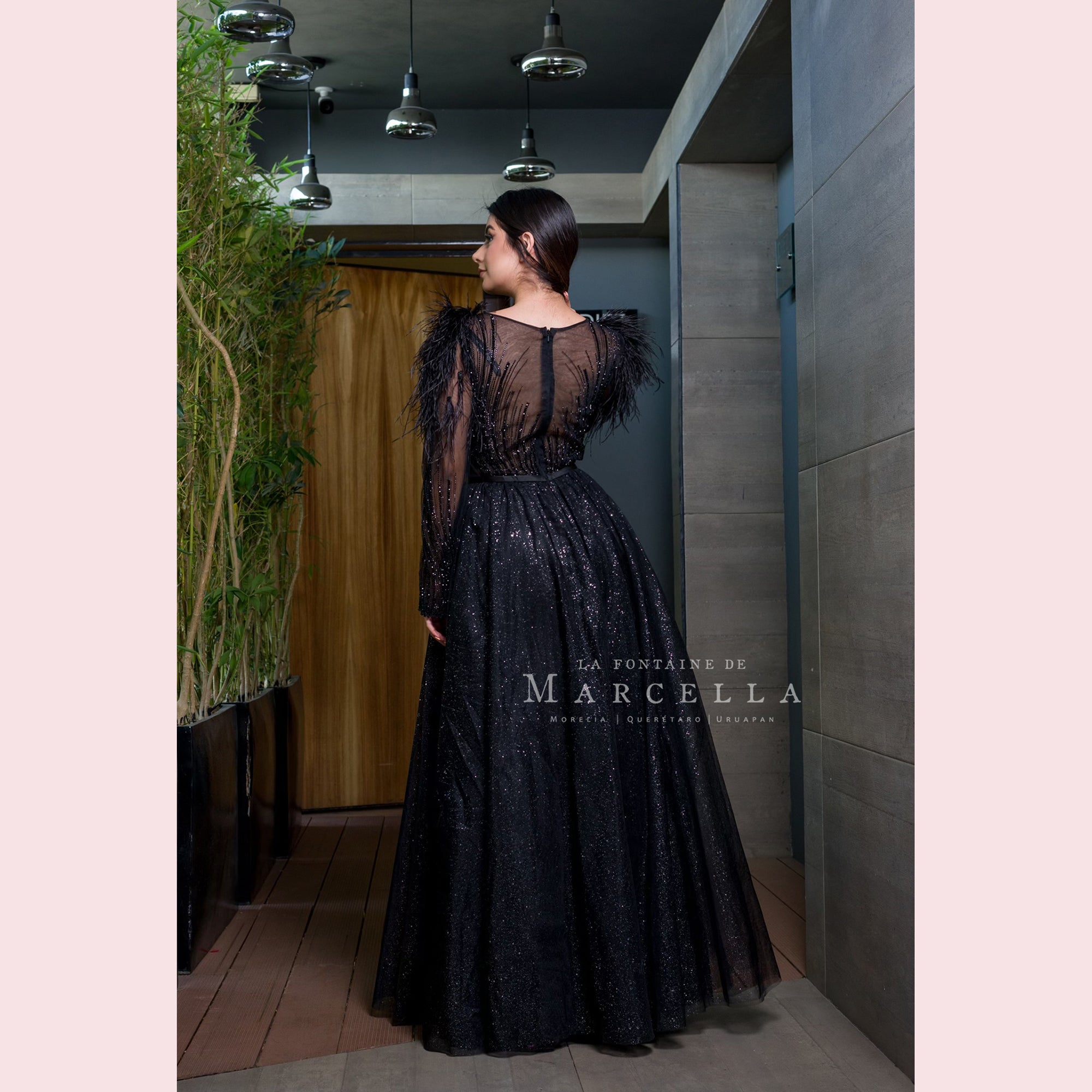 Vestido de manga larga adornado hermosamente con pedrería de fantasía y pluma en los hombros, de corte A en tul es recomendado para cuerpos tipo Rectángulo y Pera.Leer más