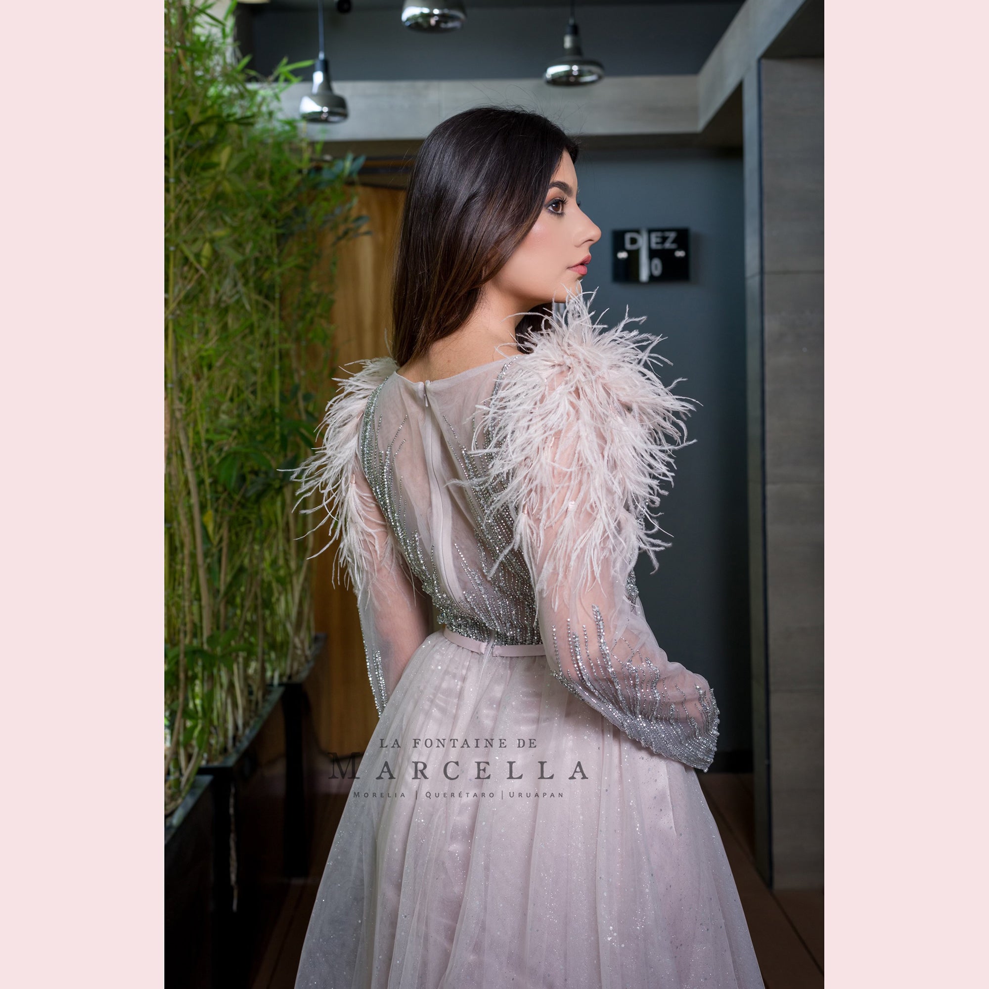 Vestido de manga larga adornado hermosamente con pedrería de fantasía y pluma en los hombros, de corte A en tul es recomendado para cuerpos tipo Rectángulo y Pera.