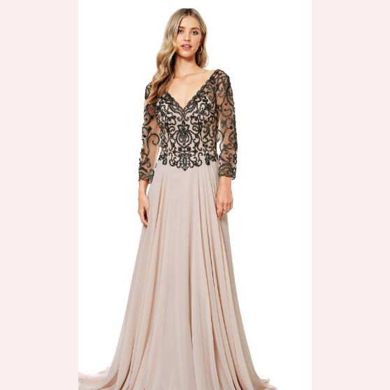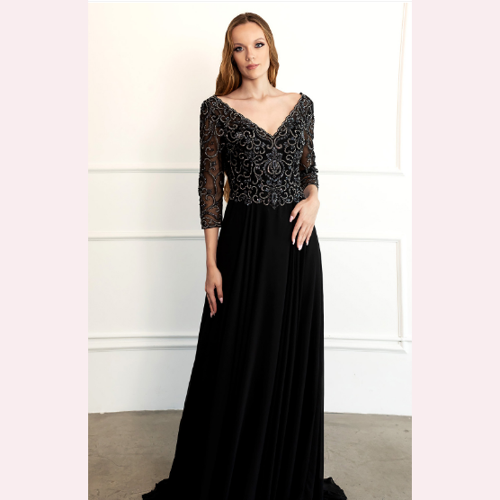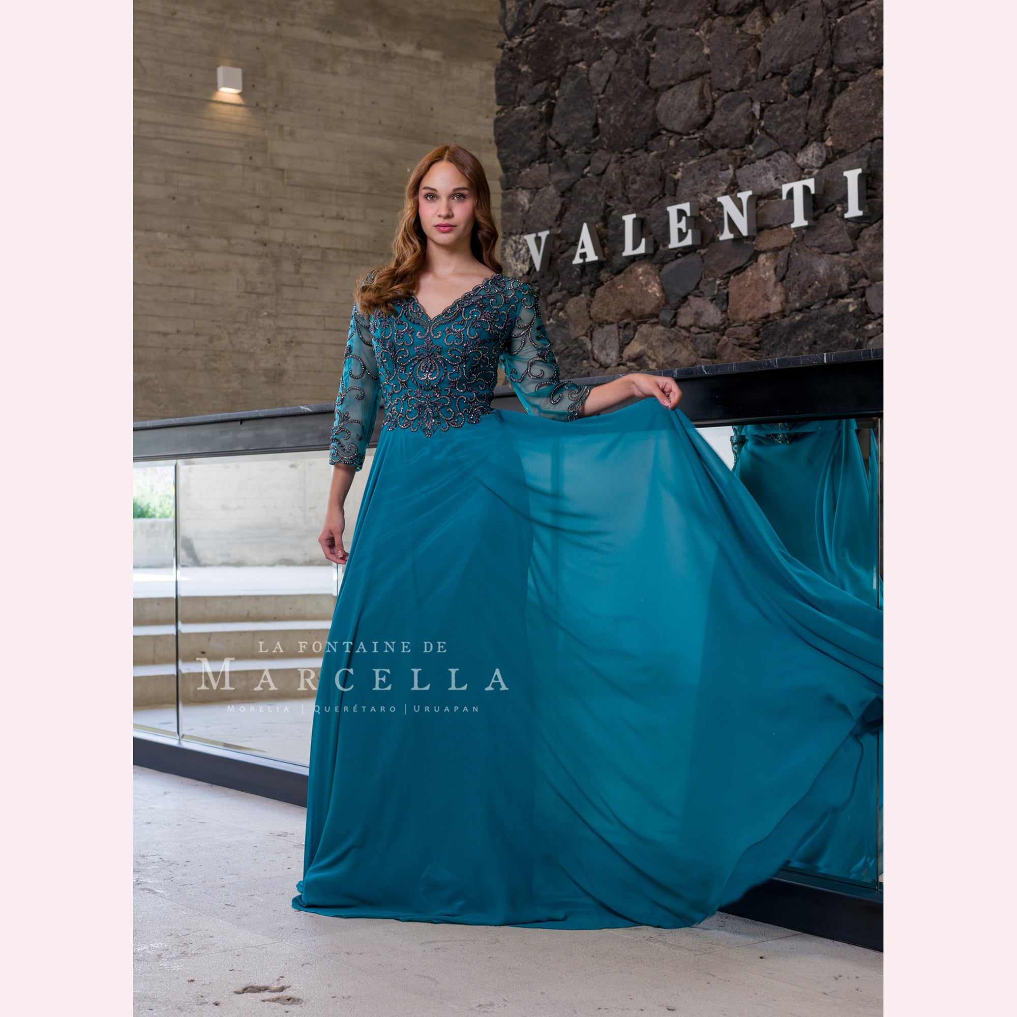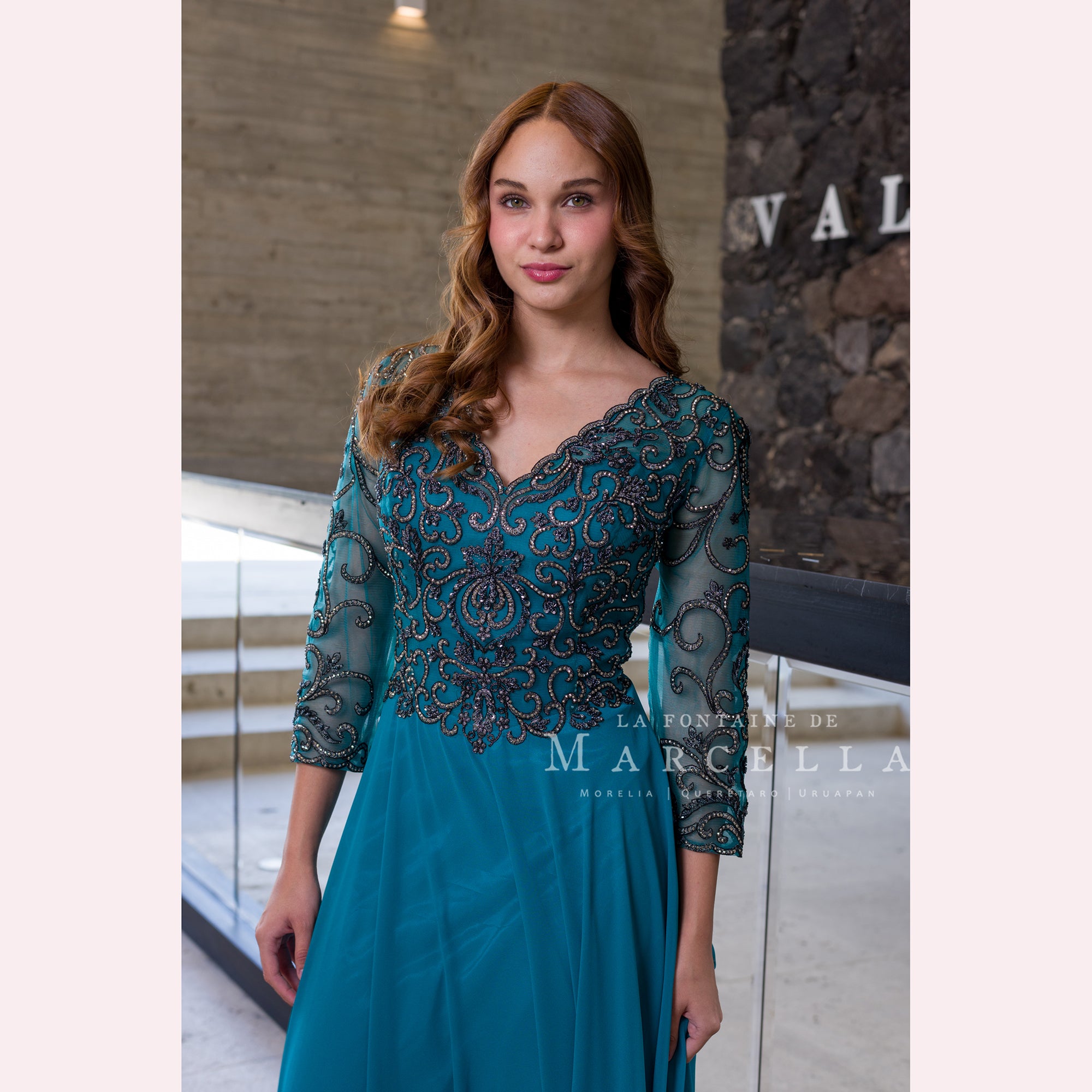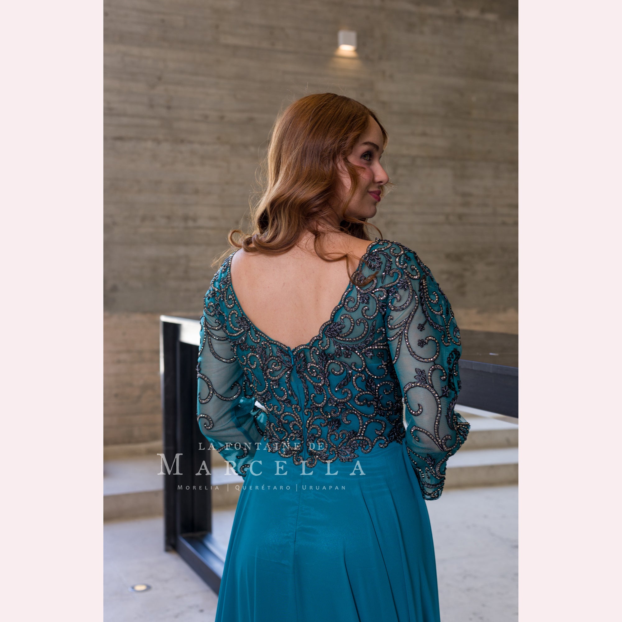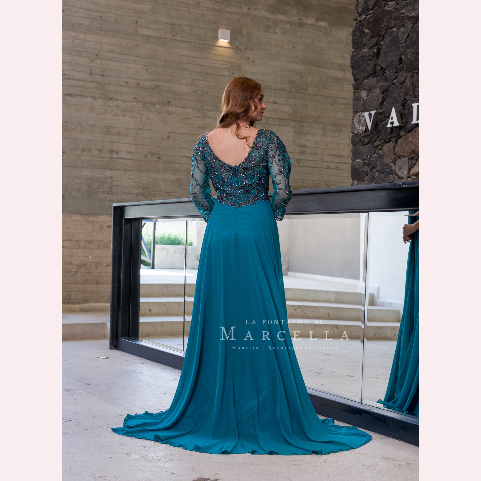 Vestido de manga larga adonado en la parte superior con un hermoso patrón en chaquira, es recomendado para cuerpos tipo Manzana y Rectángulo.