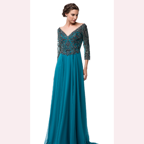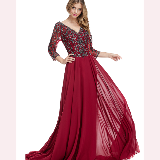 Vestido de manga larga adonado en la parte superior con un hermoso patrón en chaquira, es recomendado para cuerpos tipo Manzana y Rectángulo.Leer más