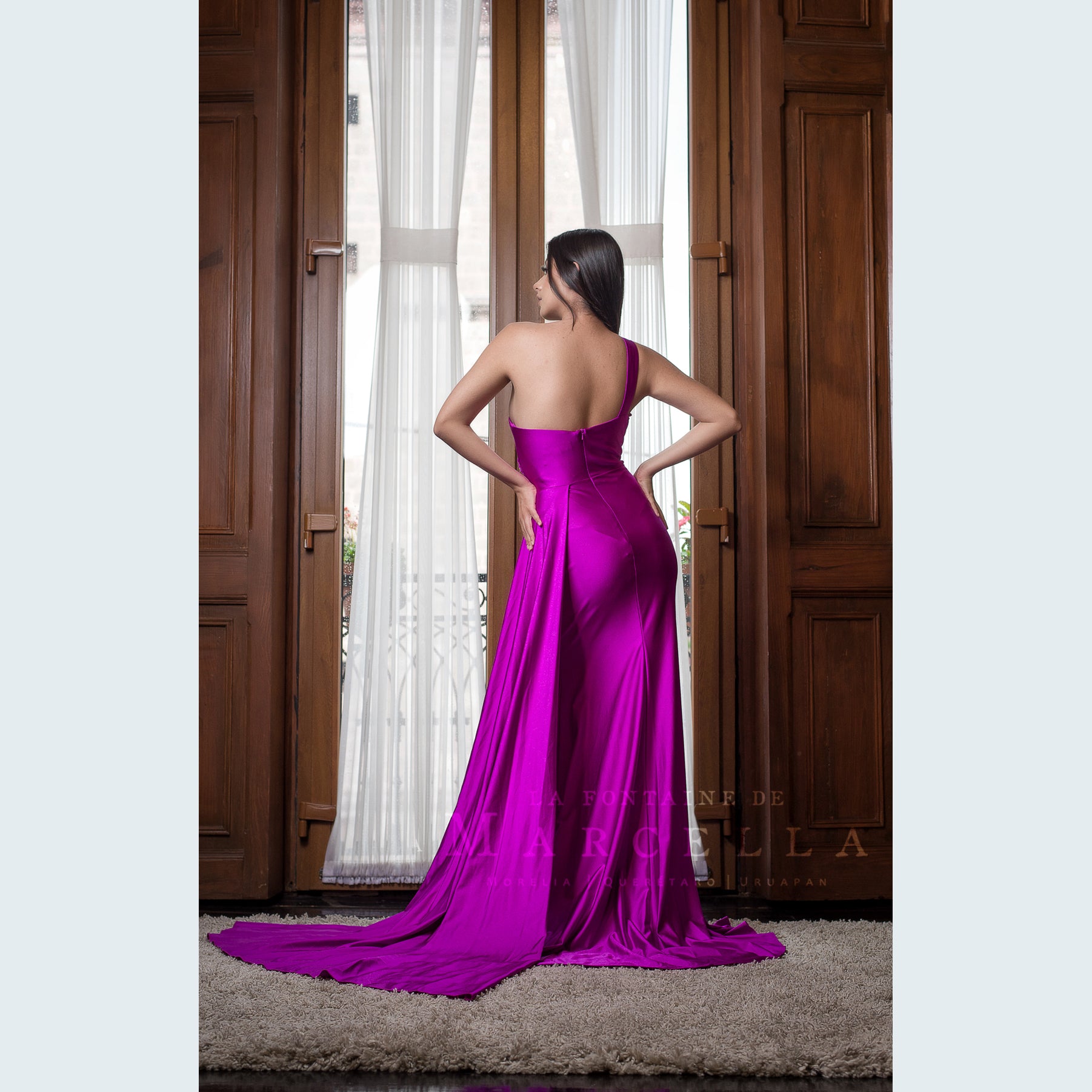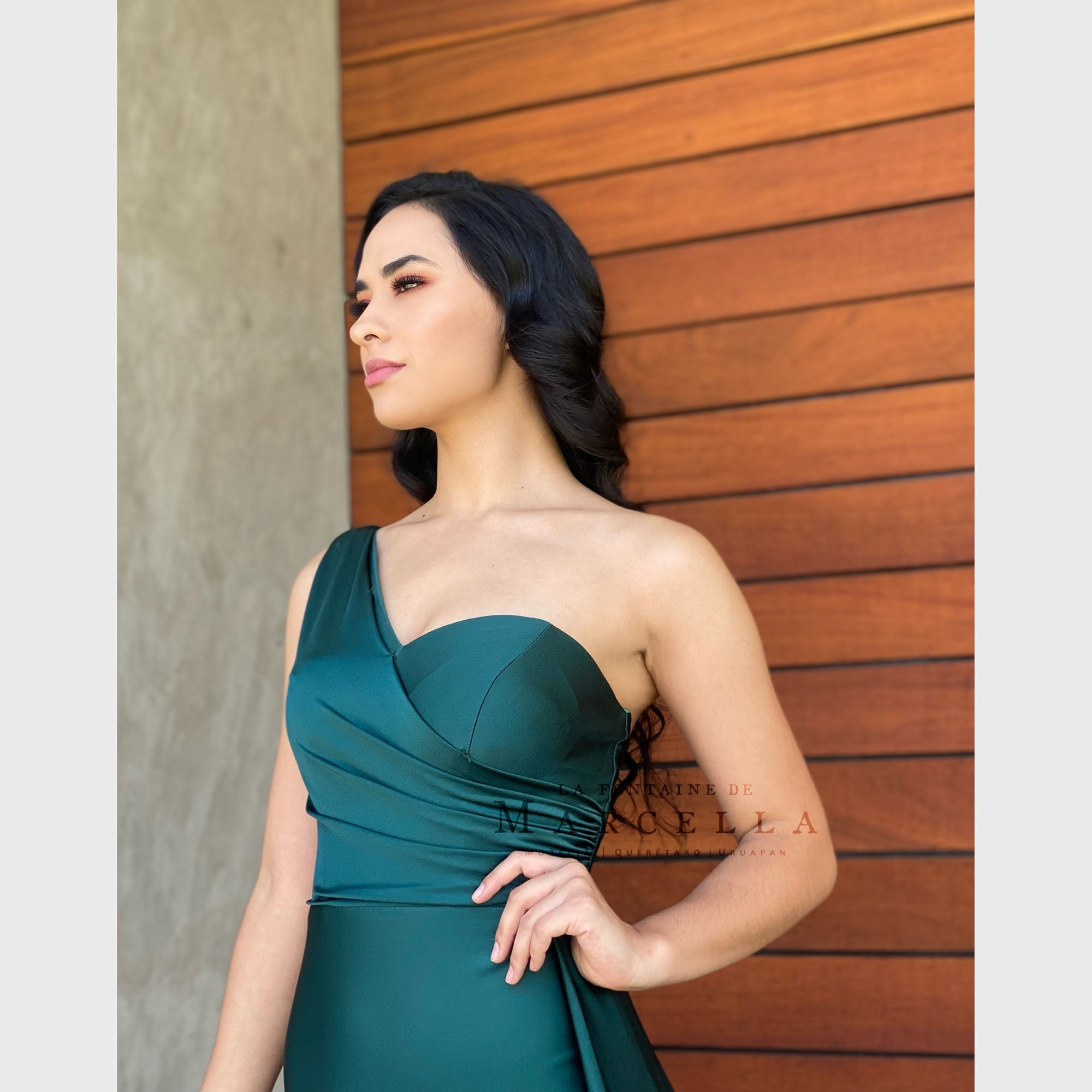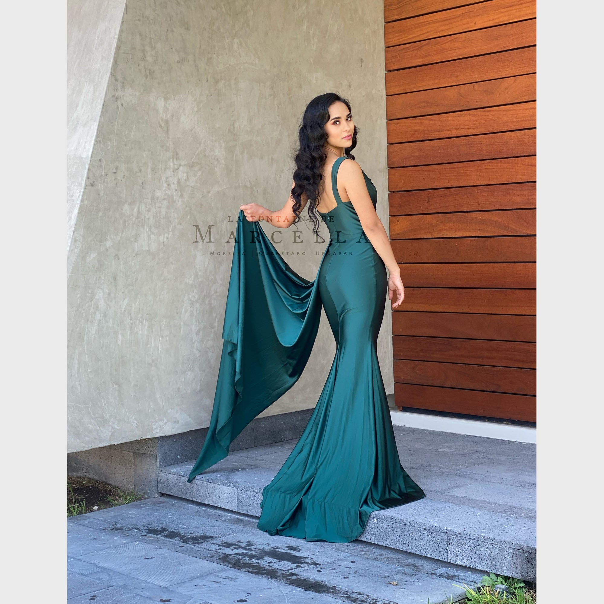 Vestido largo con corte sirena adornado con elegante manto a la cadera, recomendado para cuerpos tipo reloj de Arena y Pera. *Este modelo se encuentra en producción, para mas información sobre pedidos favor de comunicarse via redes sociales*Leer más