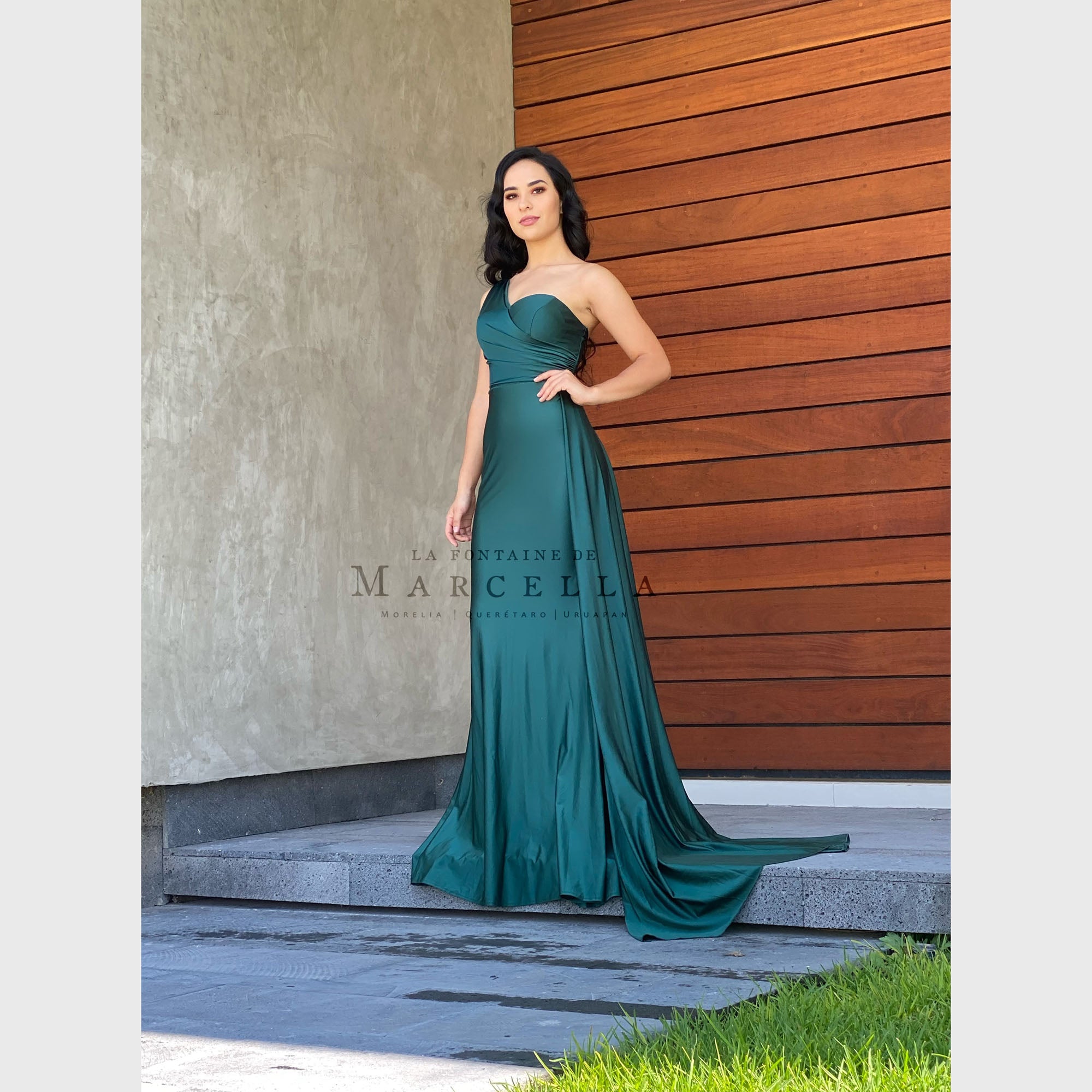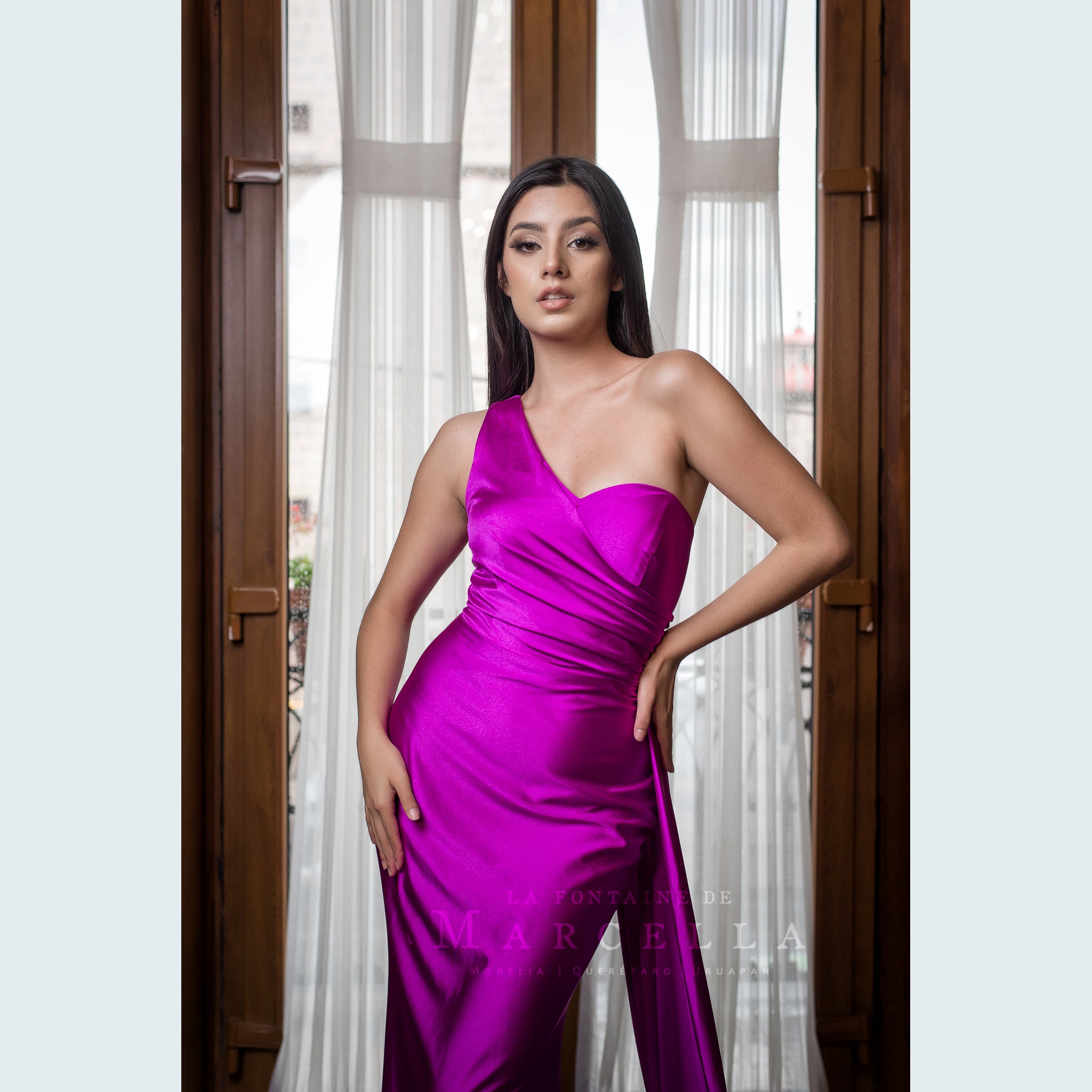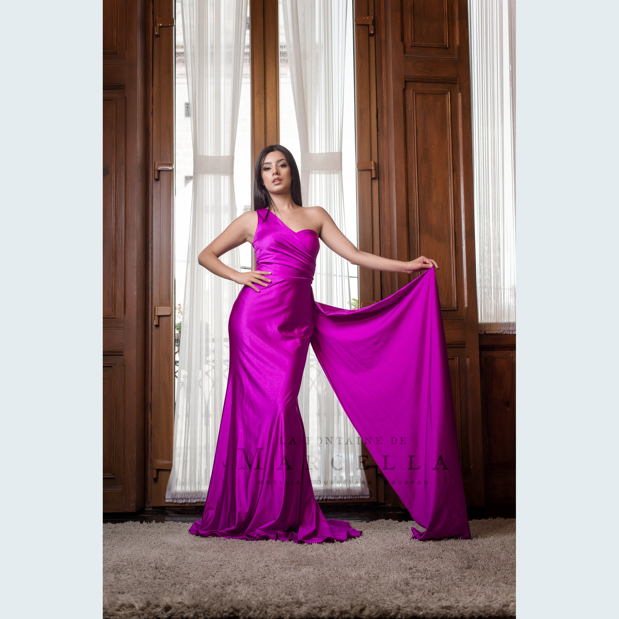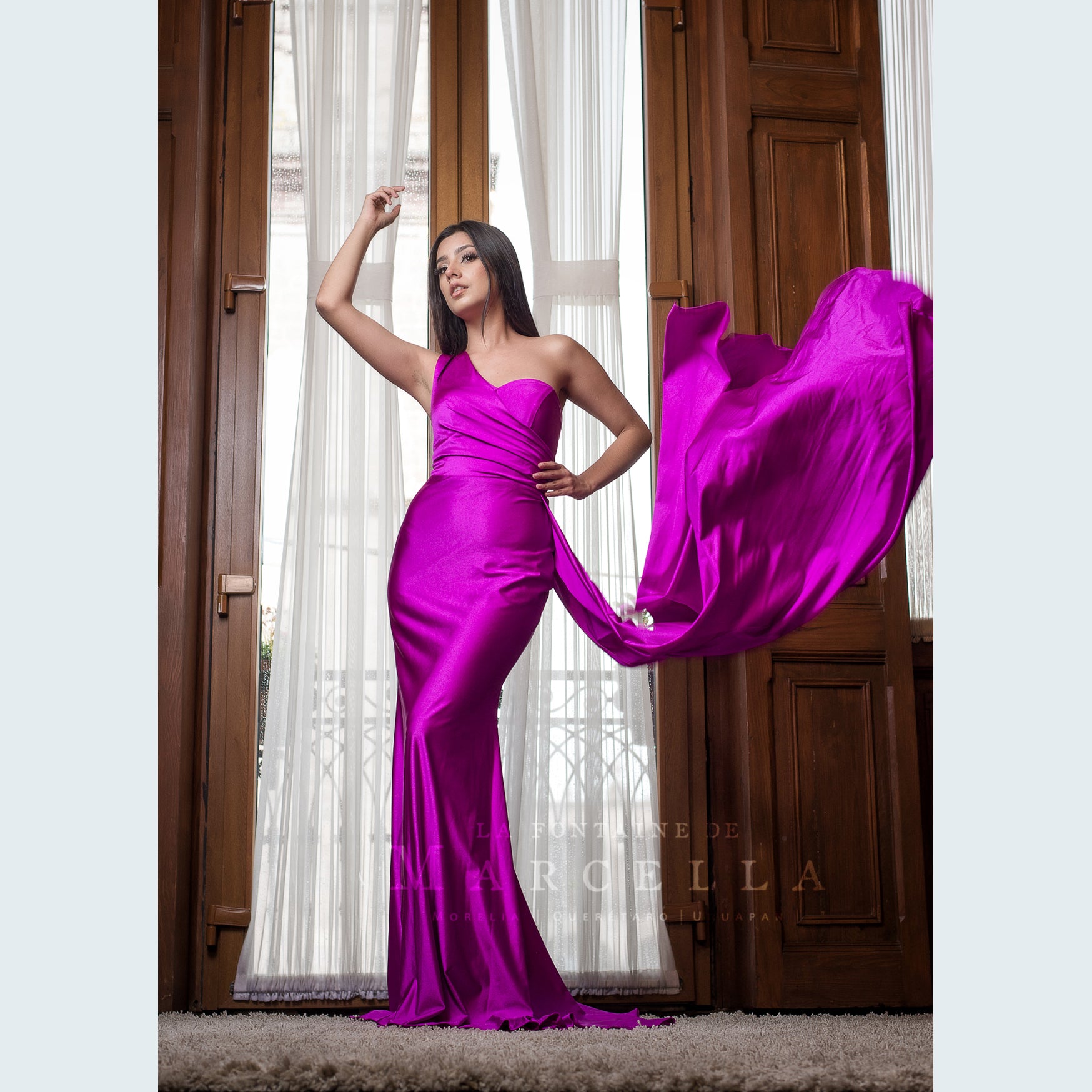 Vestido largo con corte sirena adornado con elegante manto a la cadera, recomendado para cuerpos tipo reloj de Arena y Pera. *Este modelo se encuentra en producción, para mas información sobre pedidos favor de comunicarse via redes sociales*Leer más