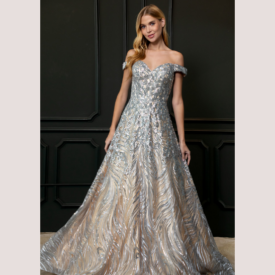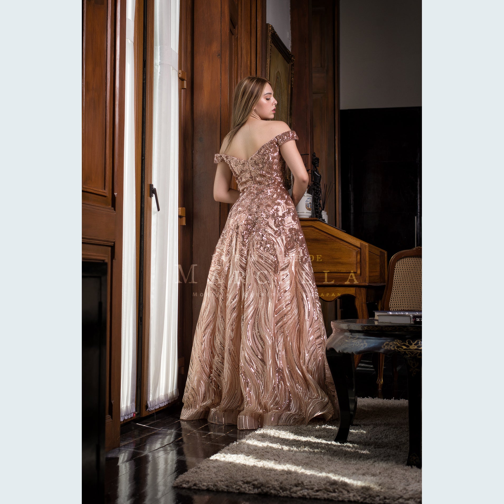 Vestido corte princesa con manga de ojal y adornado completamente por lentejuelas, recomendado para cuerpos tipo Triangulo Invertido y Rectángulo.