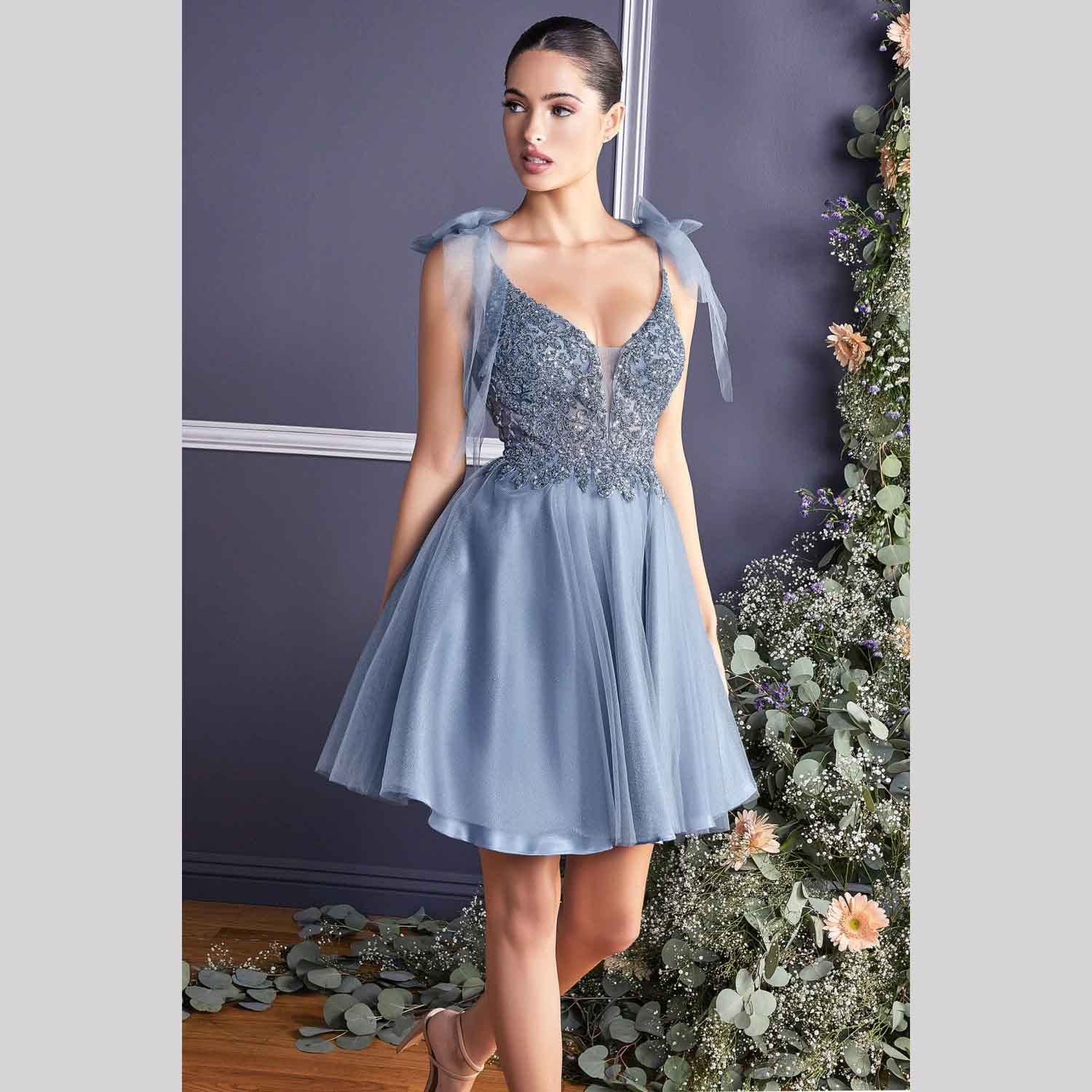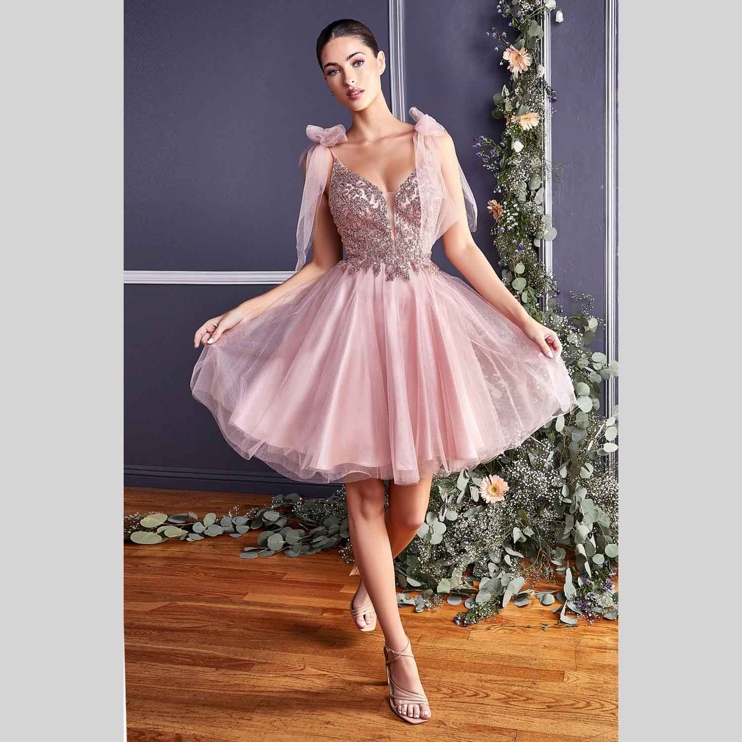 Vestido corto de tul con tirante delgado y adorno de moño a los hombros, con hermosa aplicación brillante en la parte superior, recomendada para cuerpos tipo Rectángulo y Reloj de Arena.