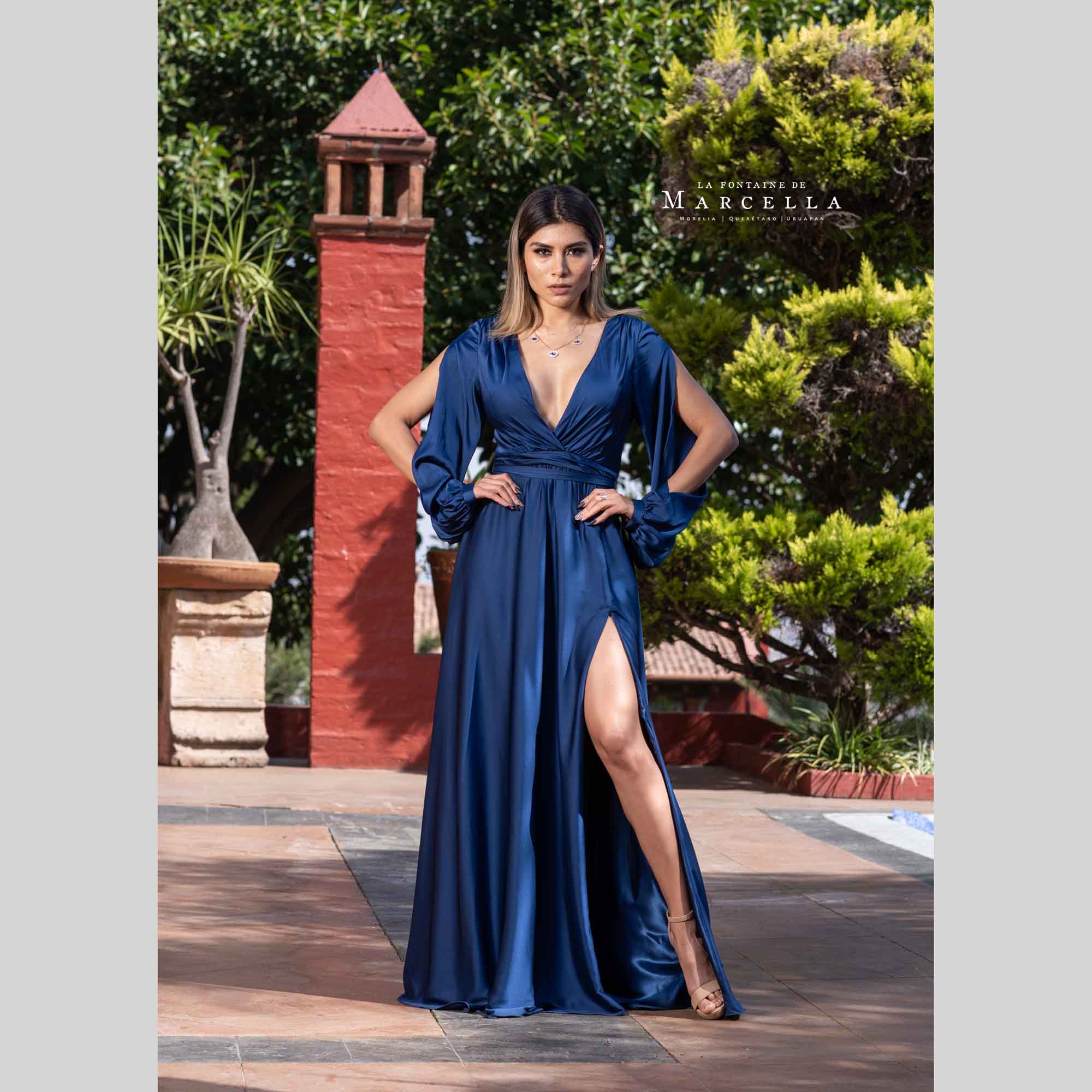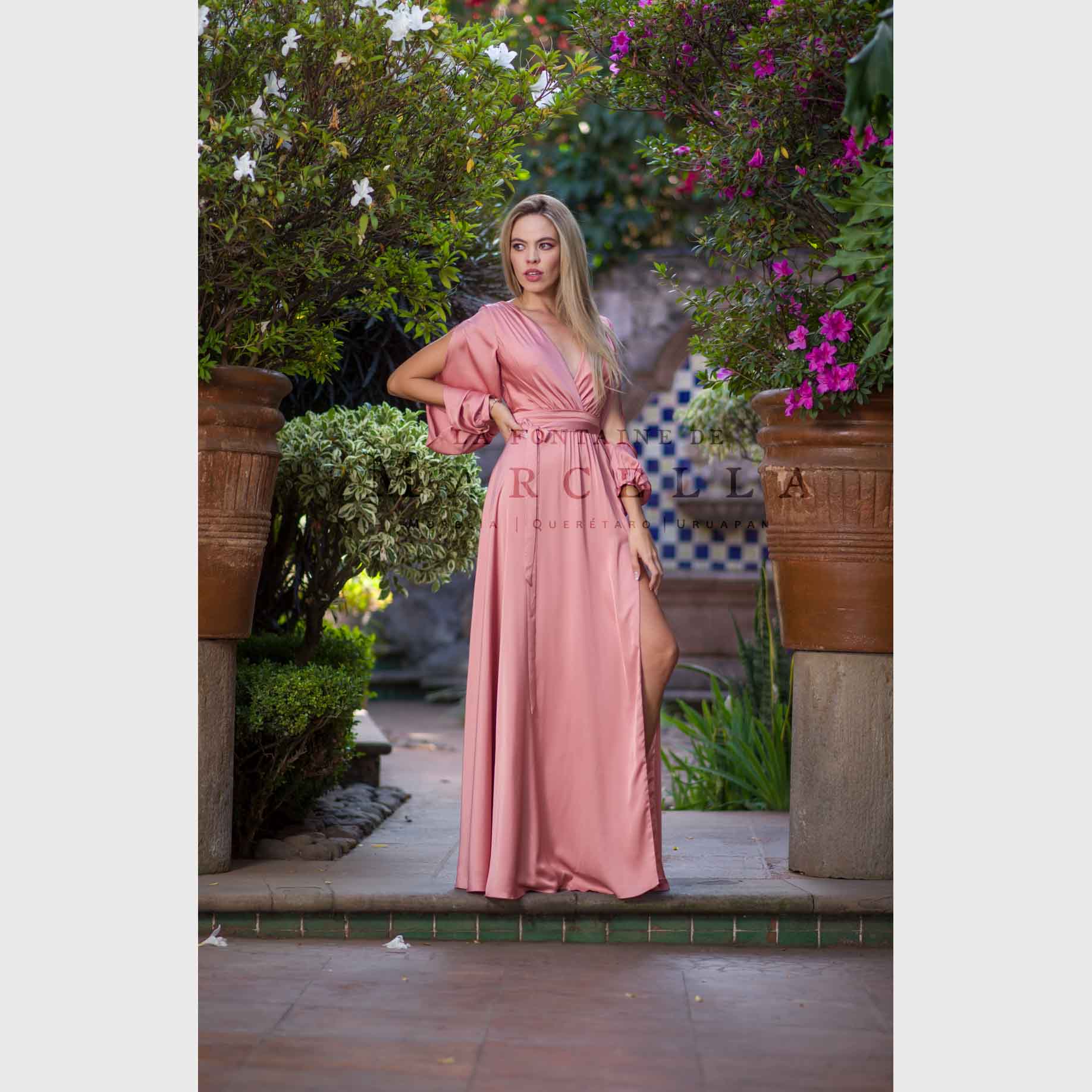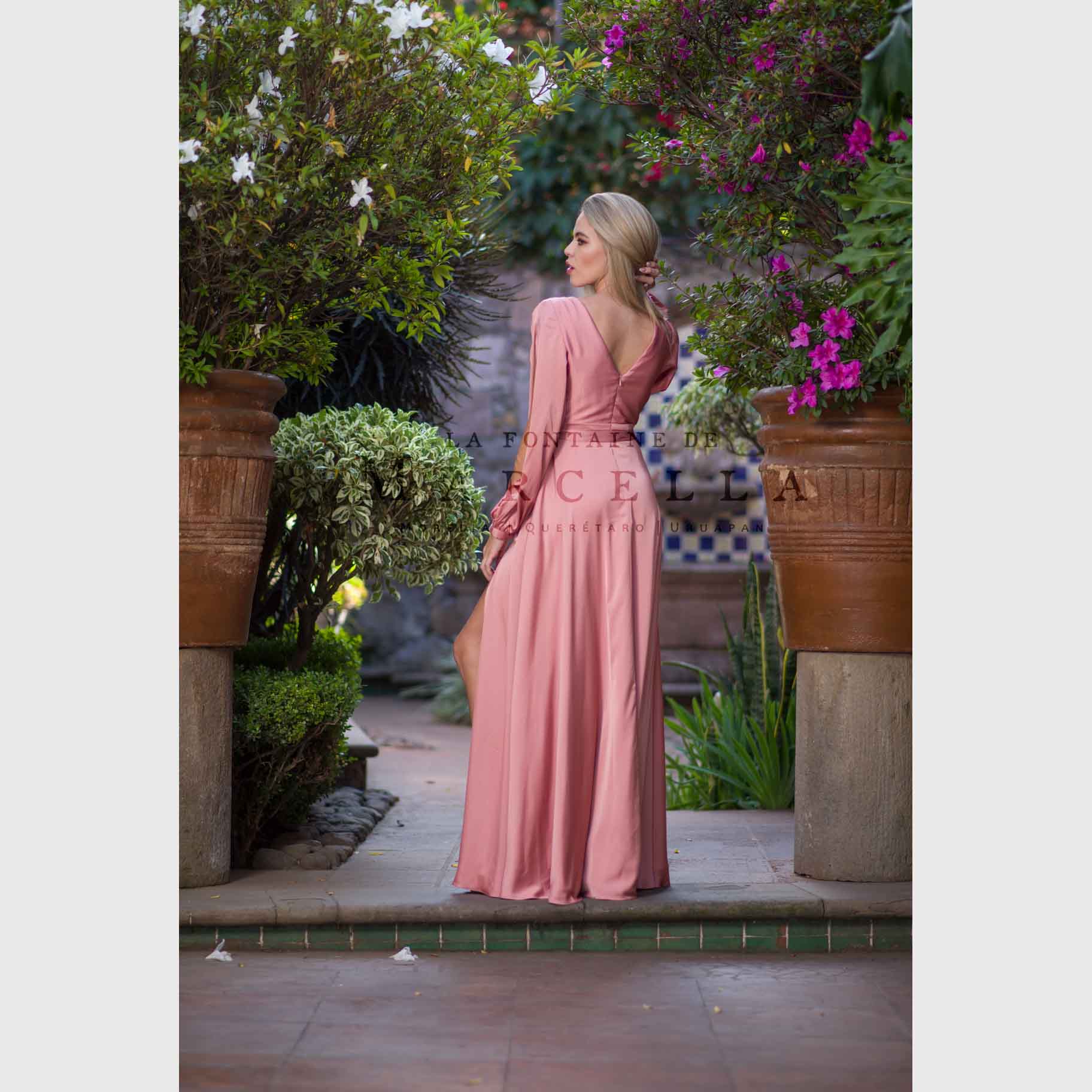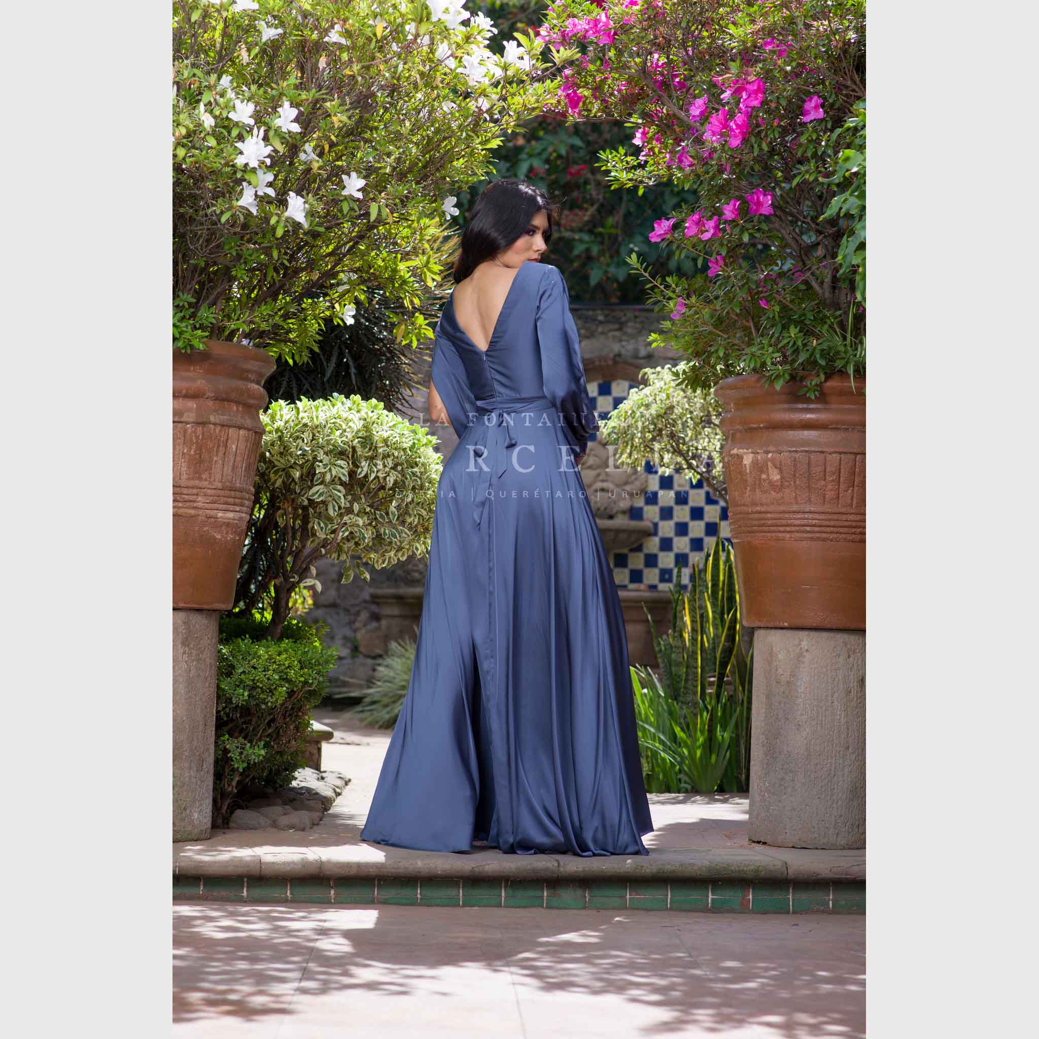Vestido de manga larga y escote en V, con tela brillante y abertura en la pierna se recomienda para cuerpos tipo Manzana y Rectángulo.