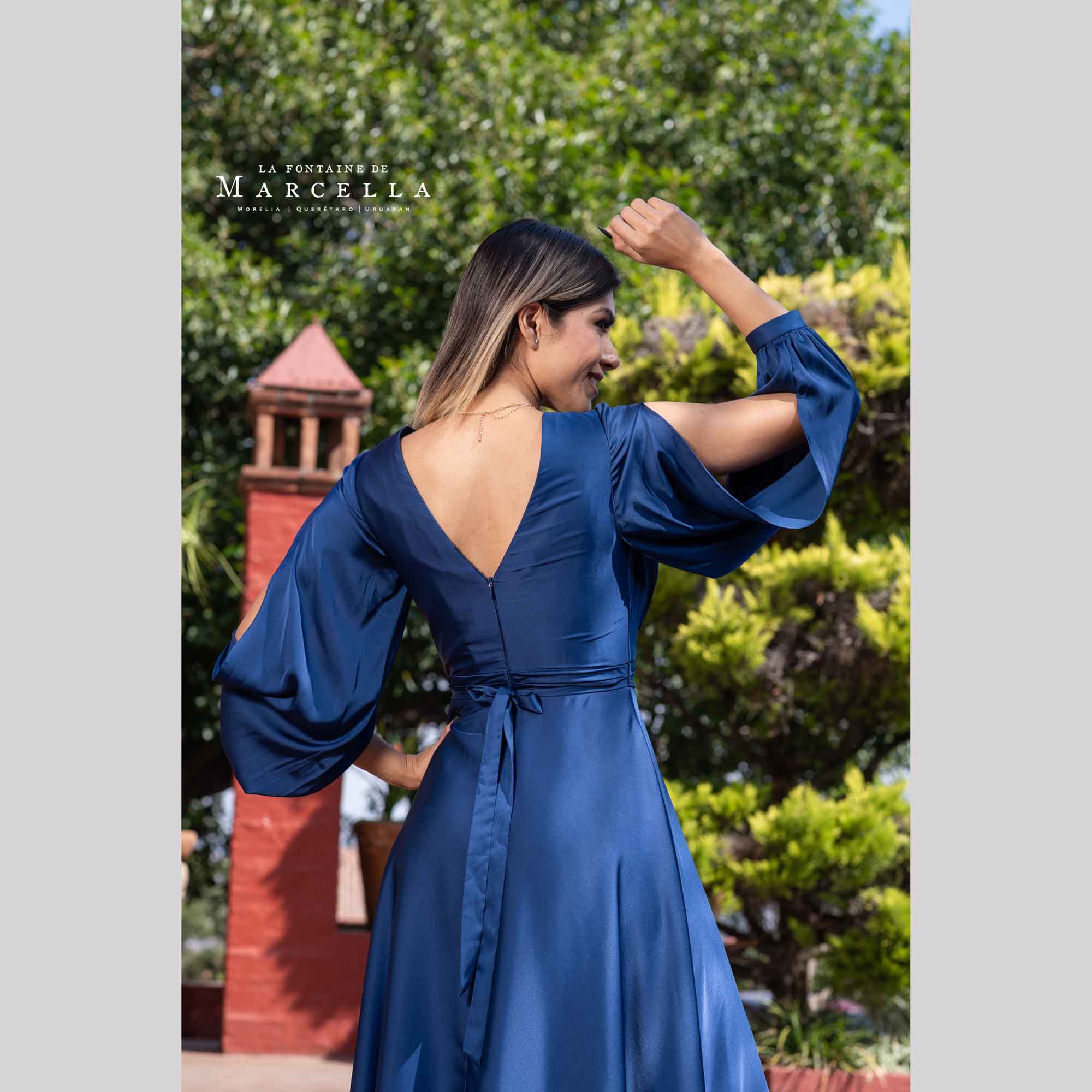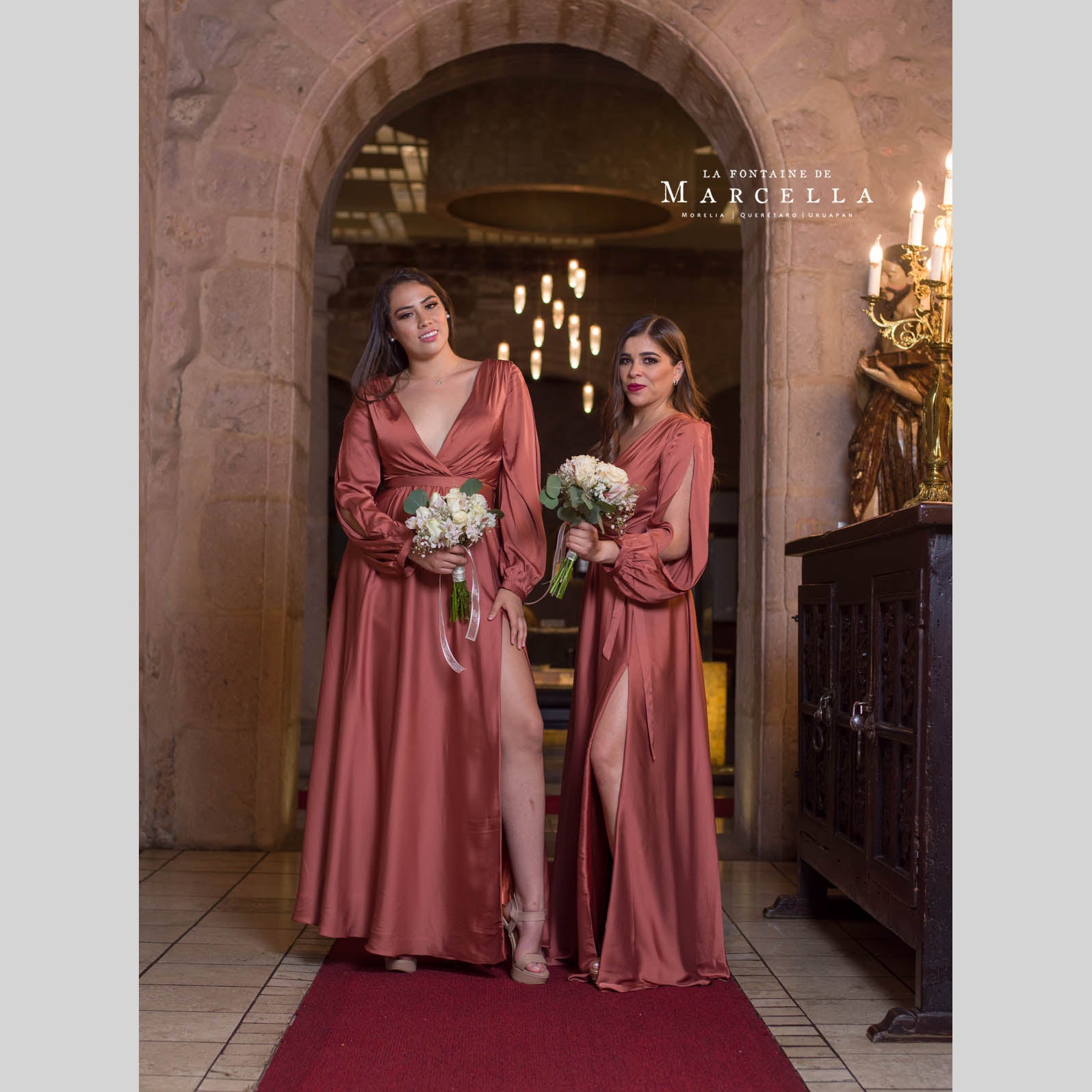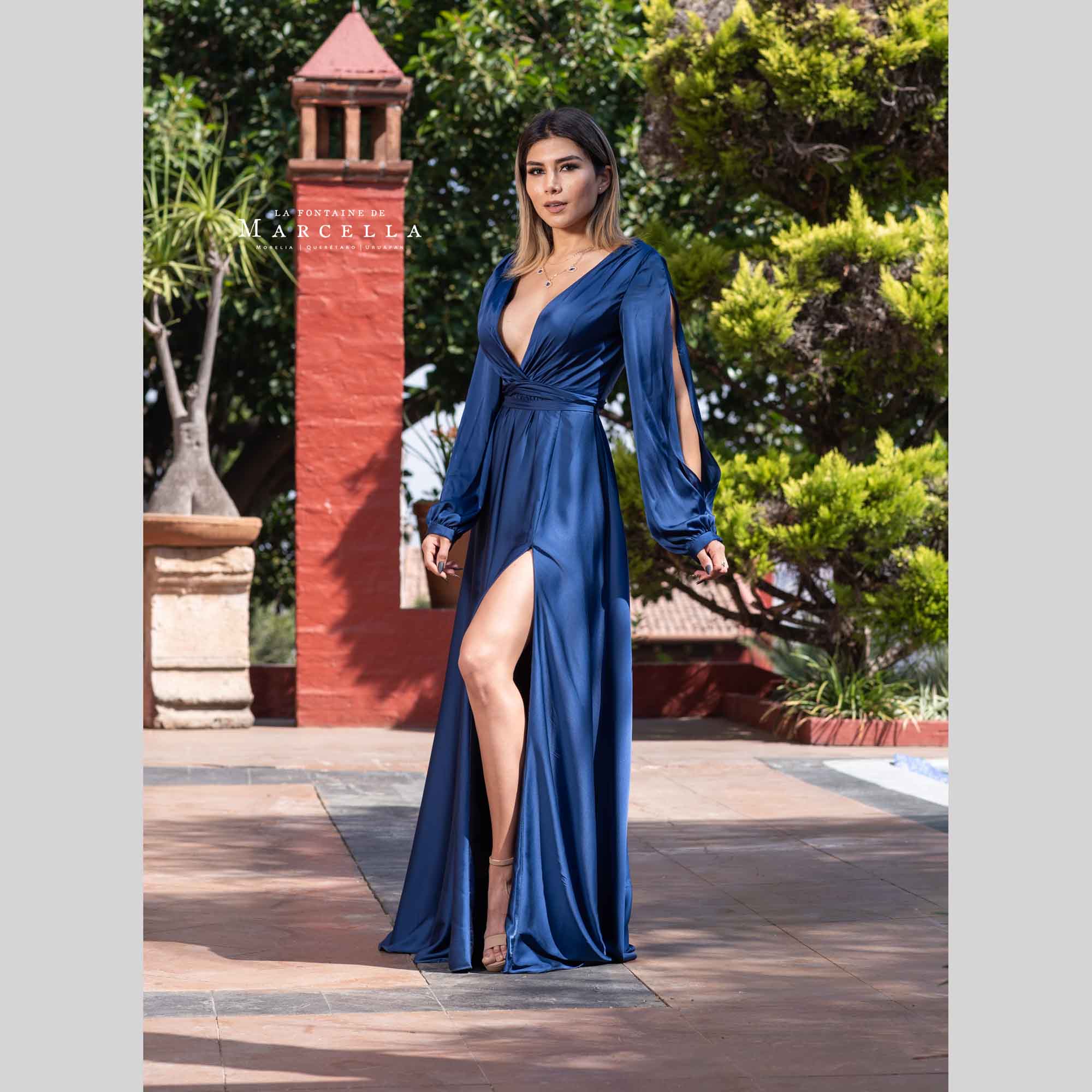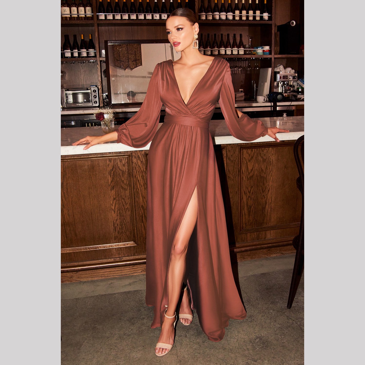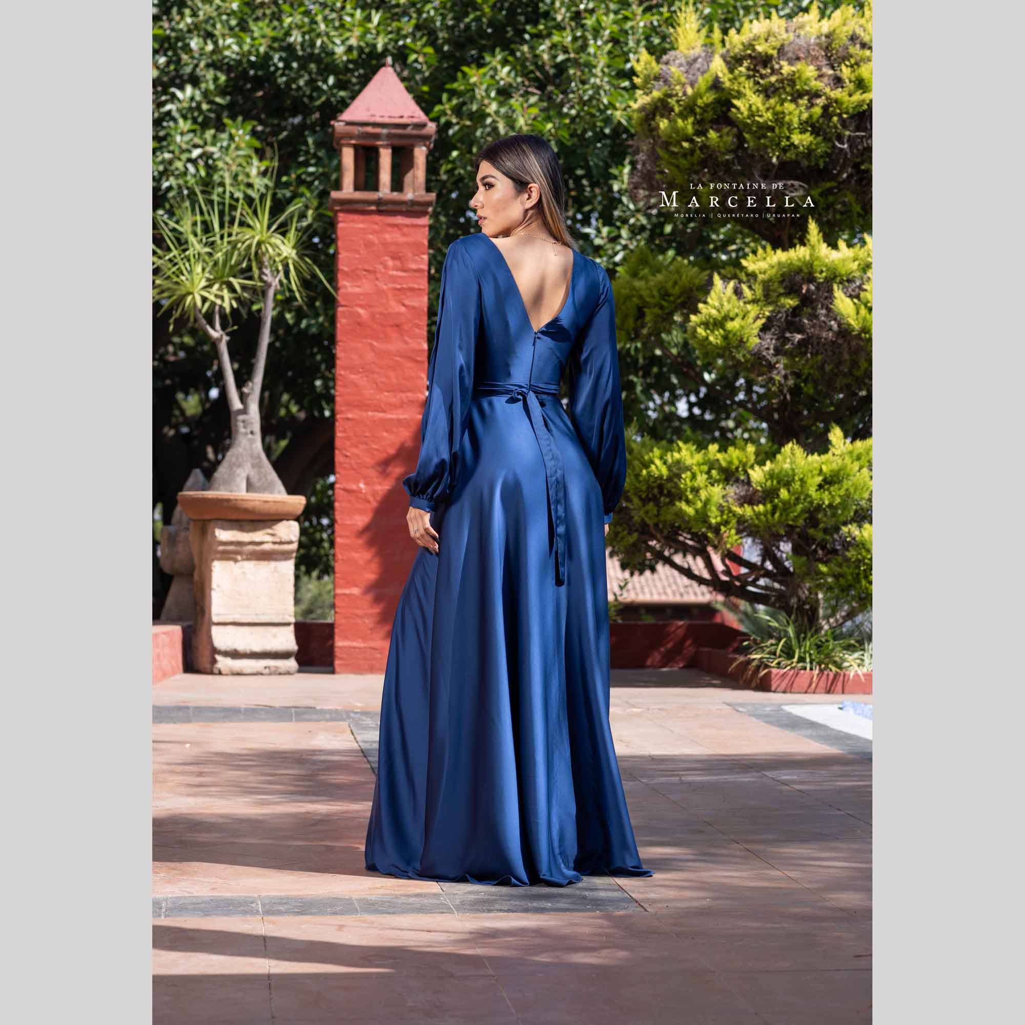 Vestido de manga larga y escote en V, con tela brillante y abertura en la pierna se recomienda para cuerpos tipo Manzana y Rectángulo.