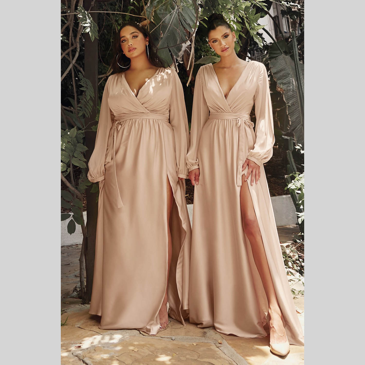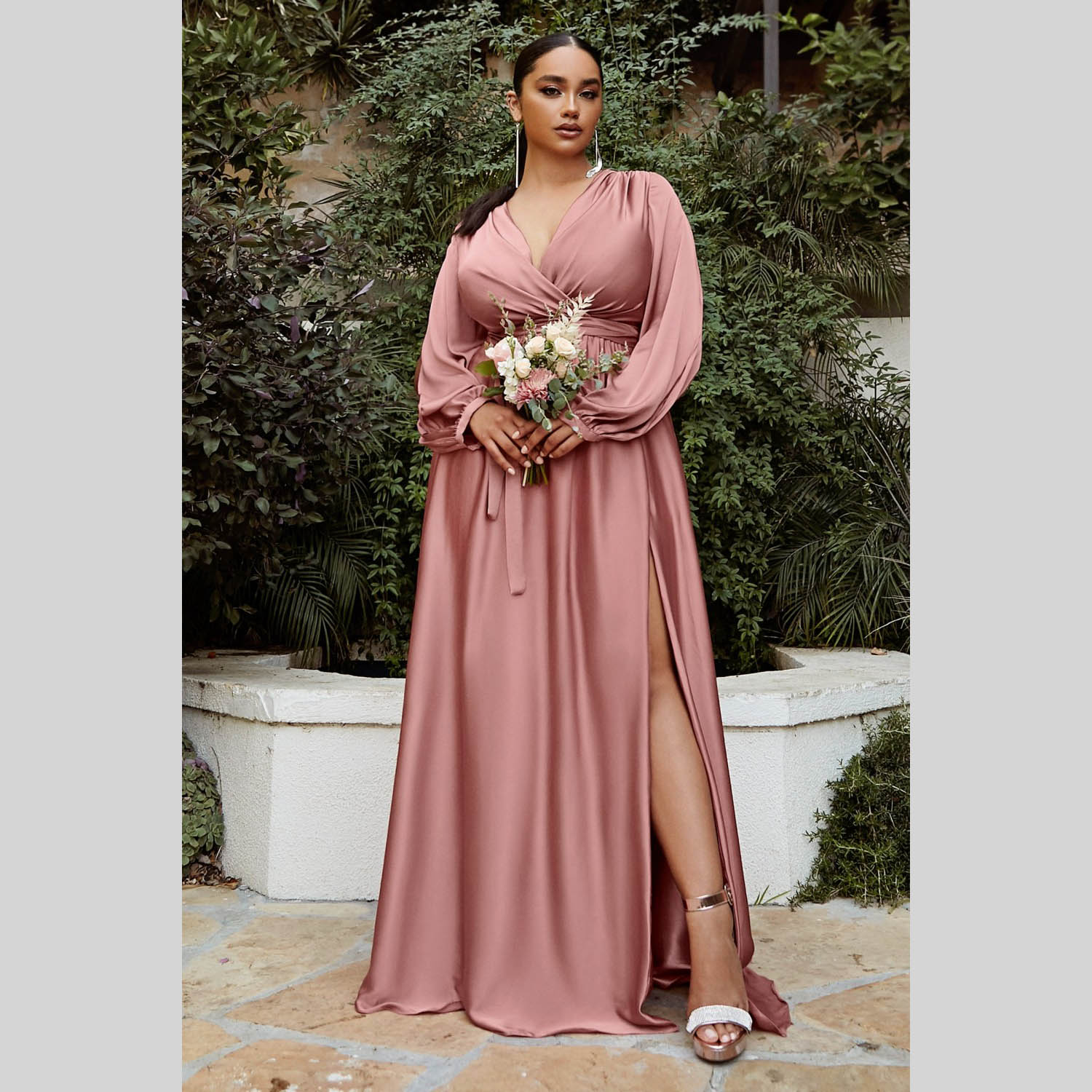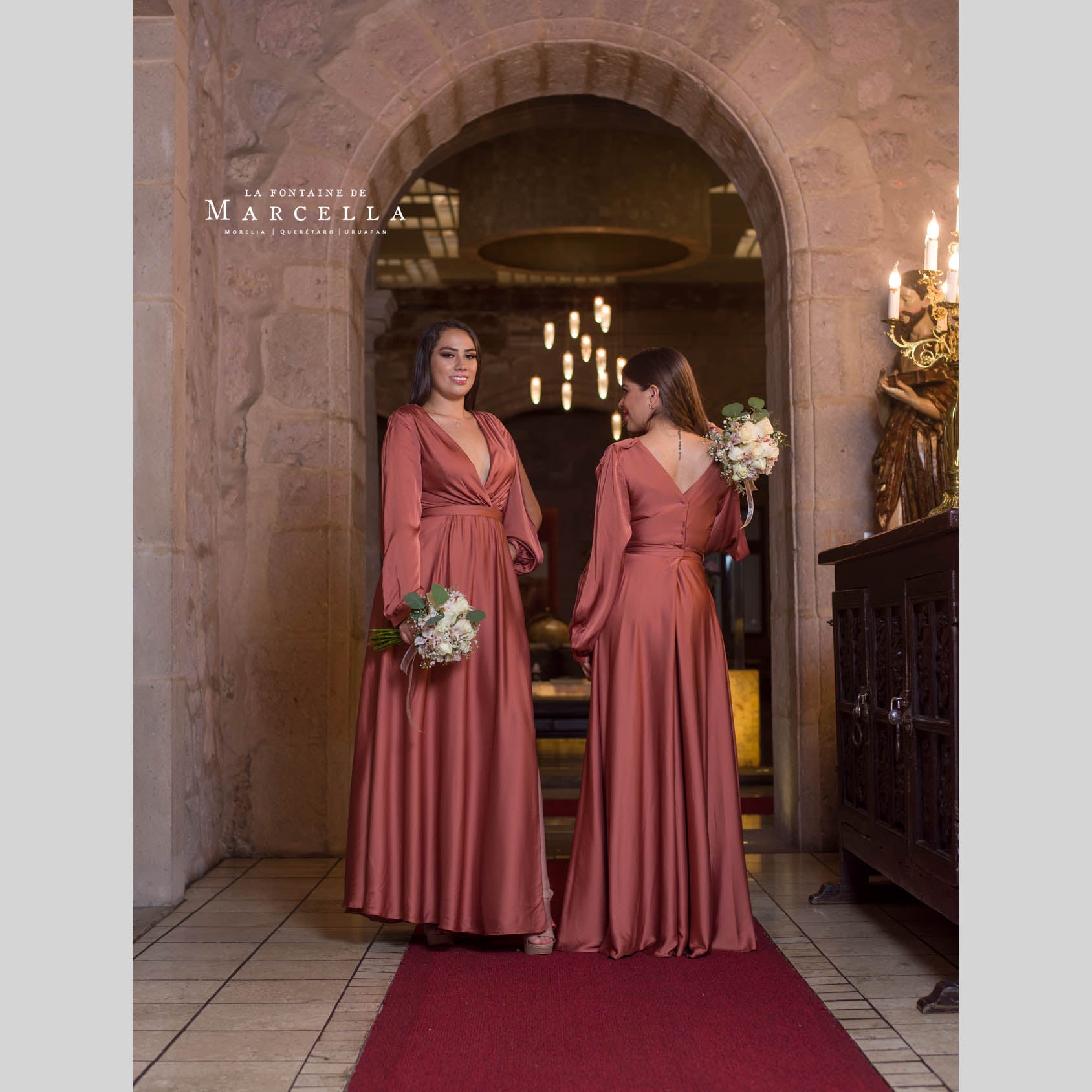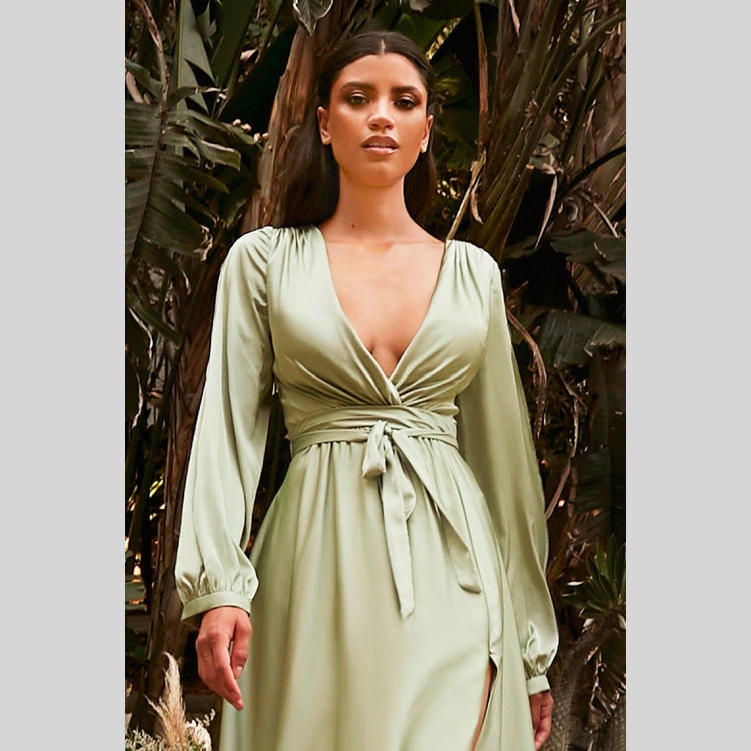 Vestido de manga larga y escote en V, con tela brillante y abertura en la pierna se recomienda para cuerpos tipo Manzana y Rectángulo.