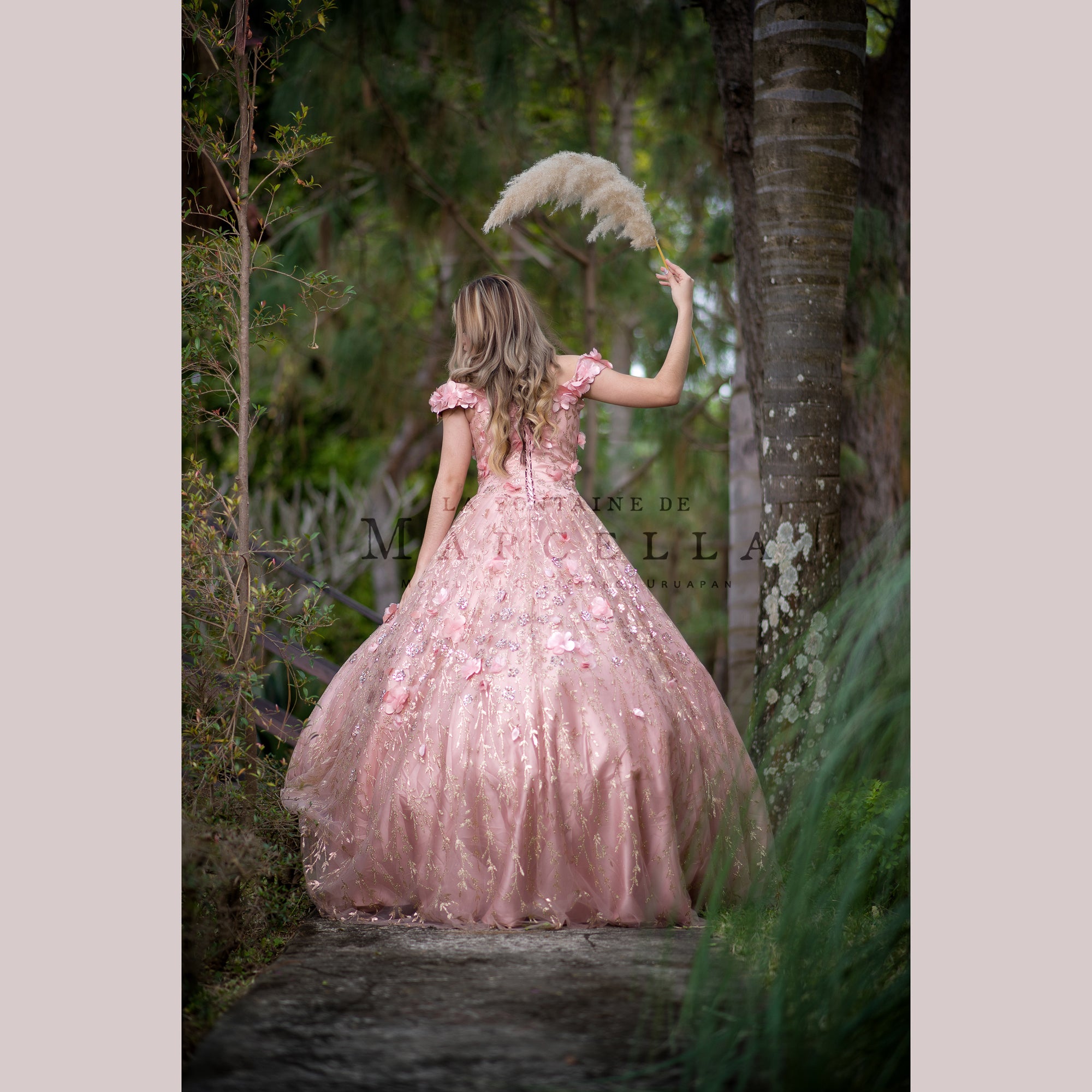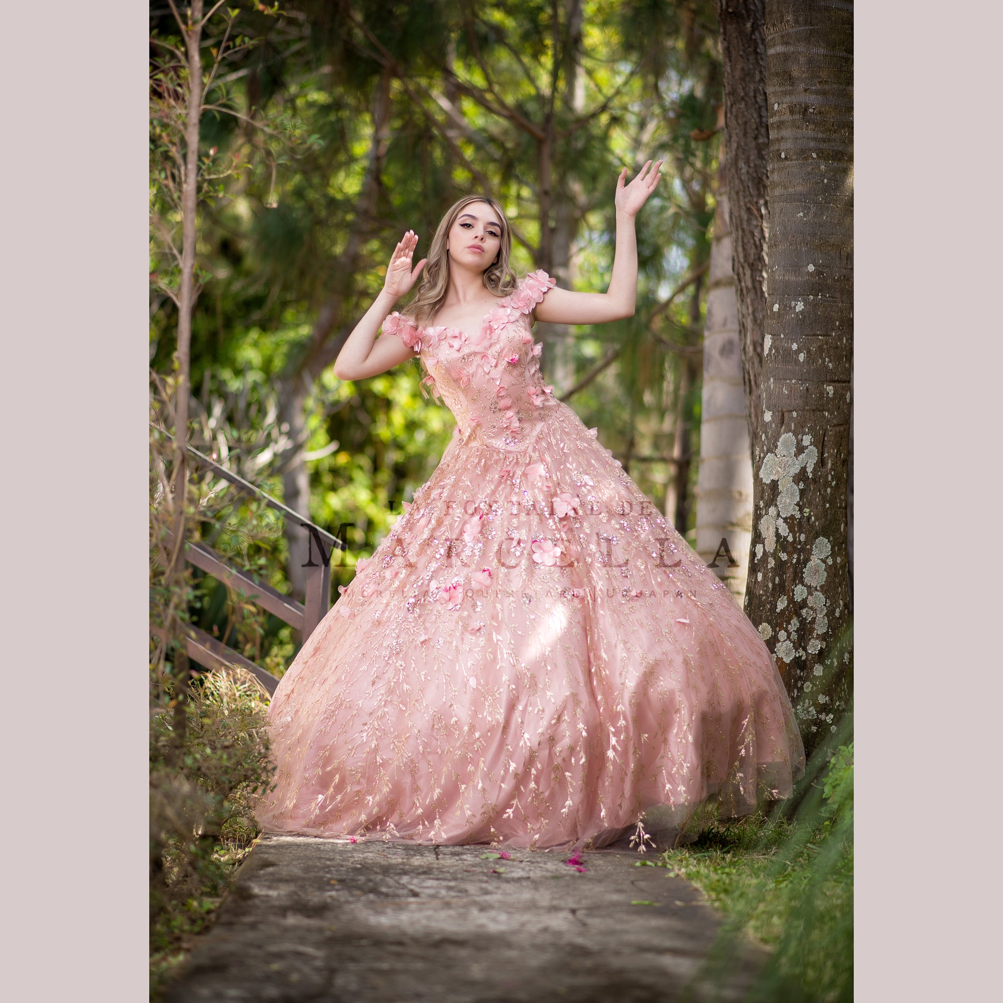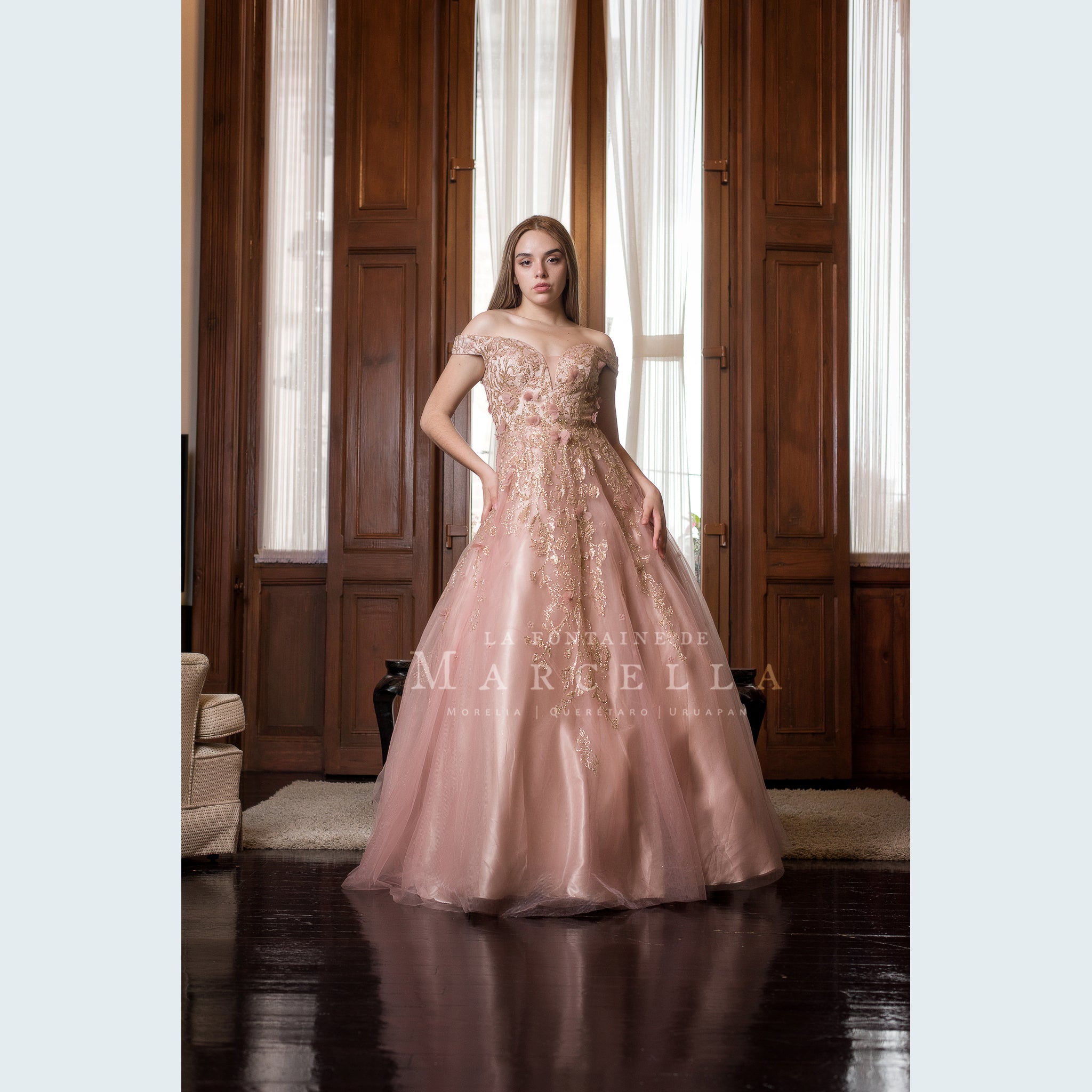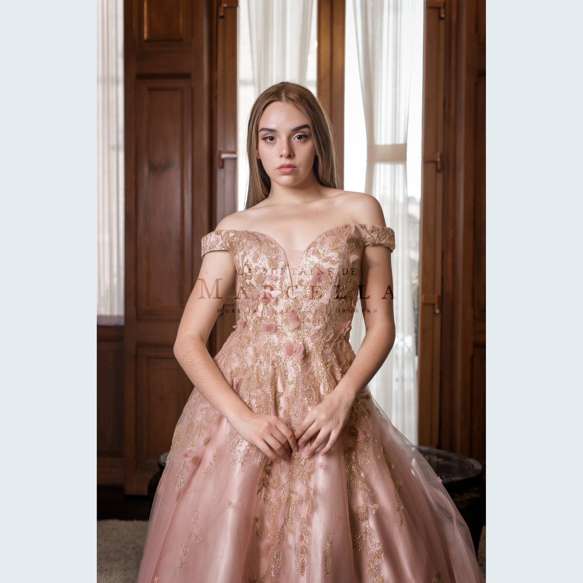 Vestido largo de corte princesa con aplicación floral y adornado con diamantina dorada, con mangas de ojal adornado con flores es recomendado para cuerpos tipo Triangulo invertido y Rectángulo. No incluye Crinolina*Leer más