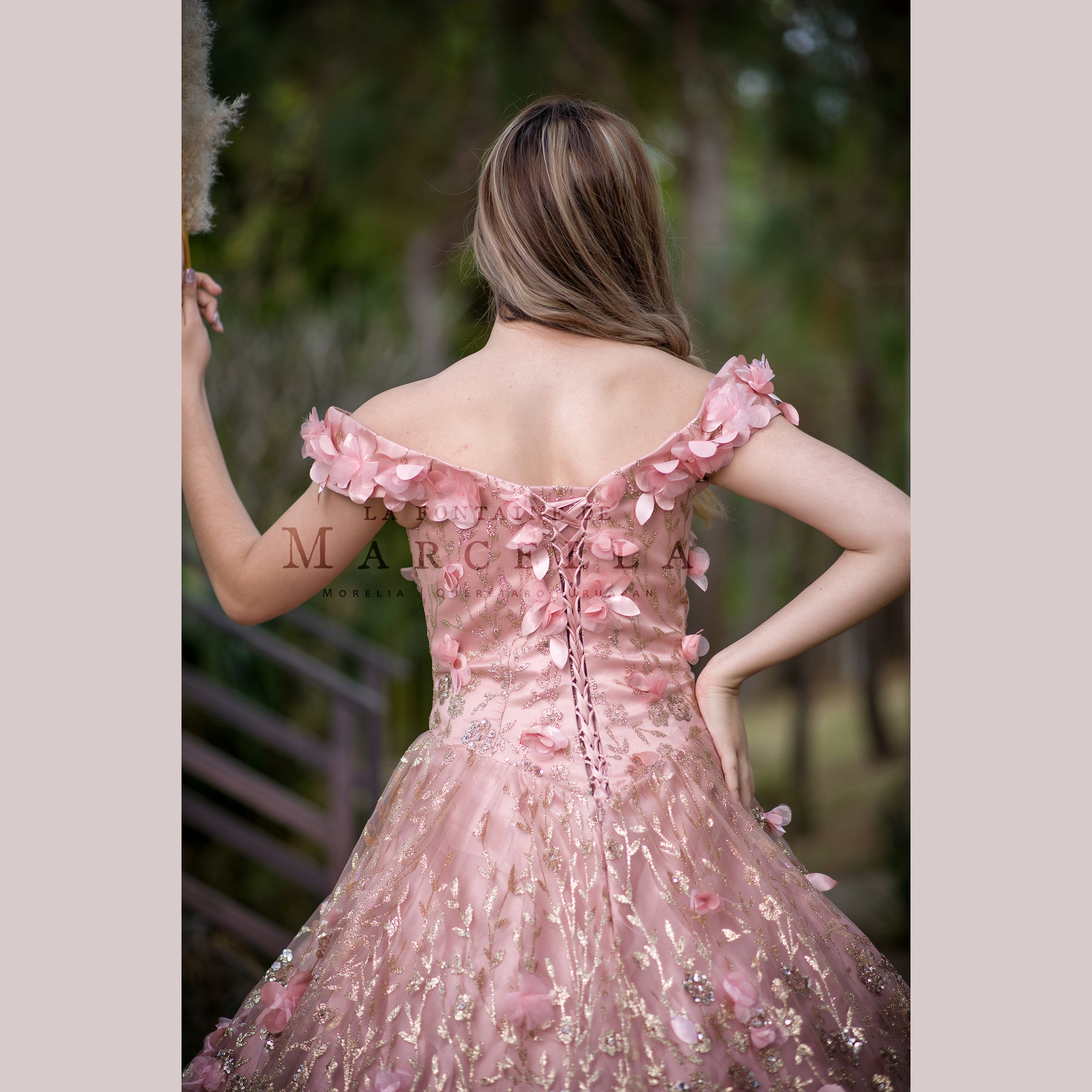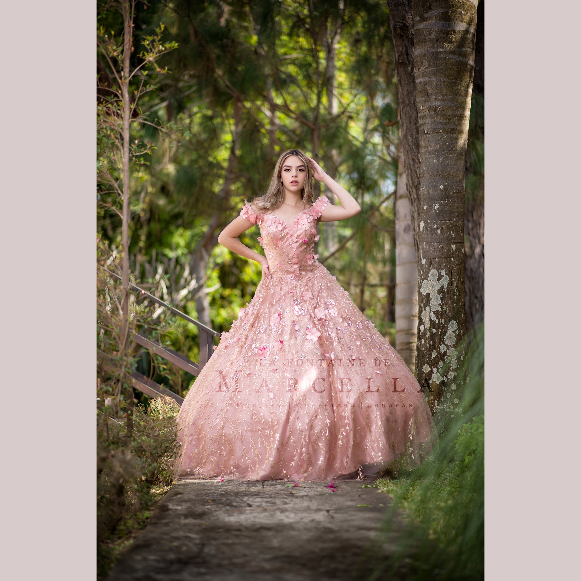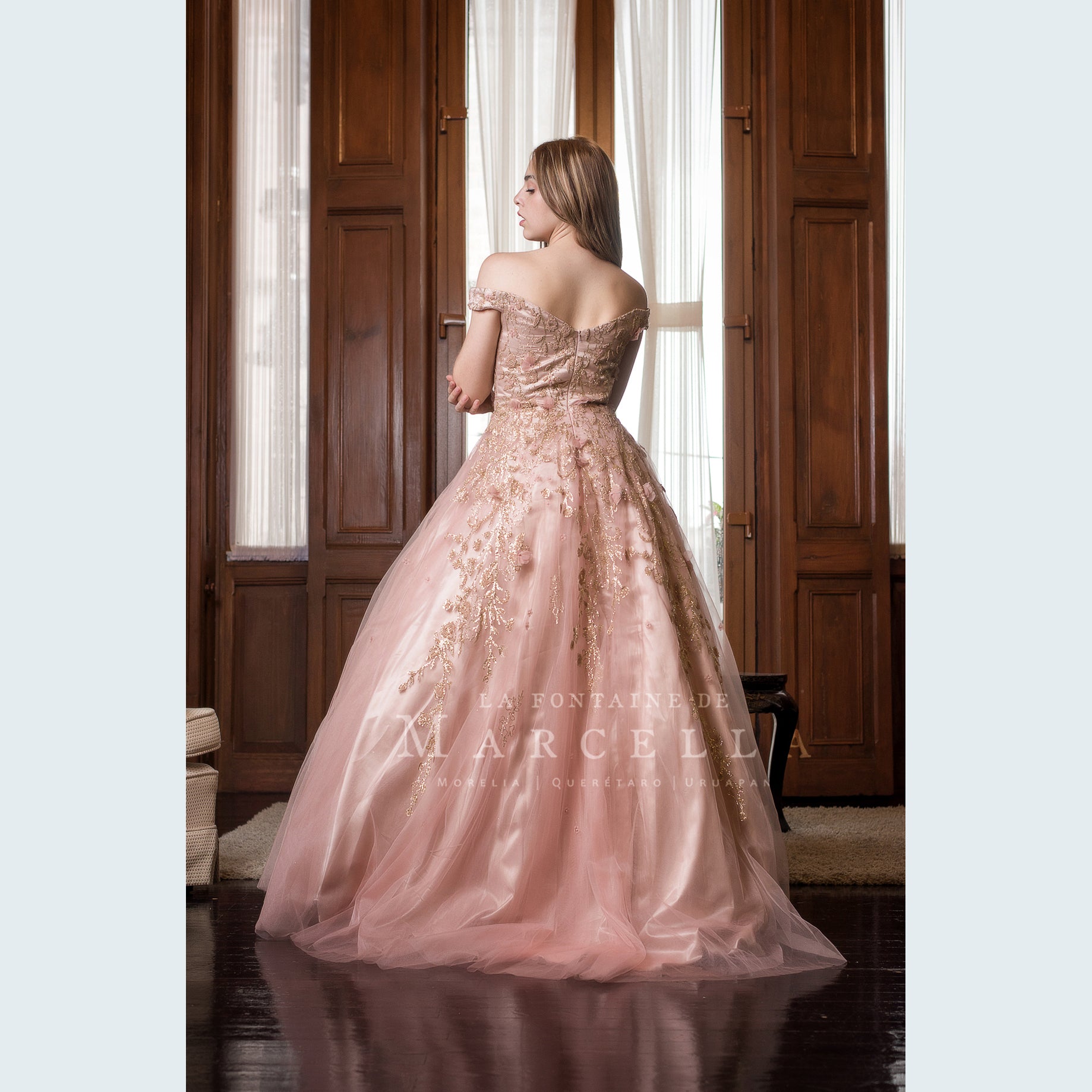 Vestido largo de corte princesa con aplicación floral y adornado con diamantina dorada, con mangas de ojal adornado con flores es recomendado para cuerpos tipo Triangulo invertido y Rectángulo. No incluye Crinolina*Leer más