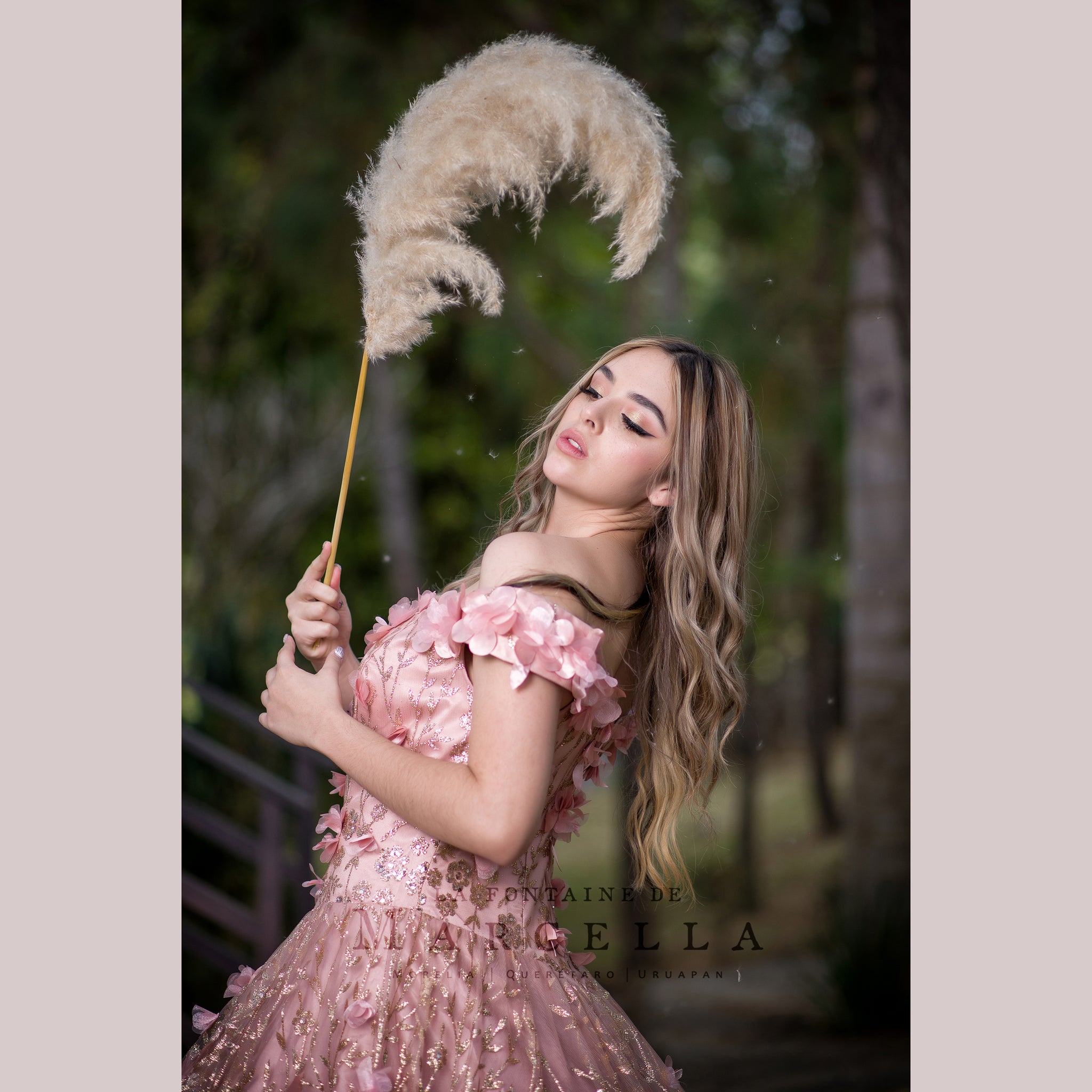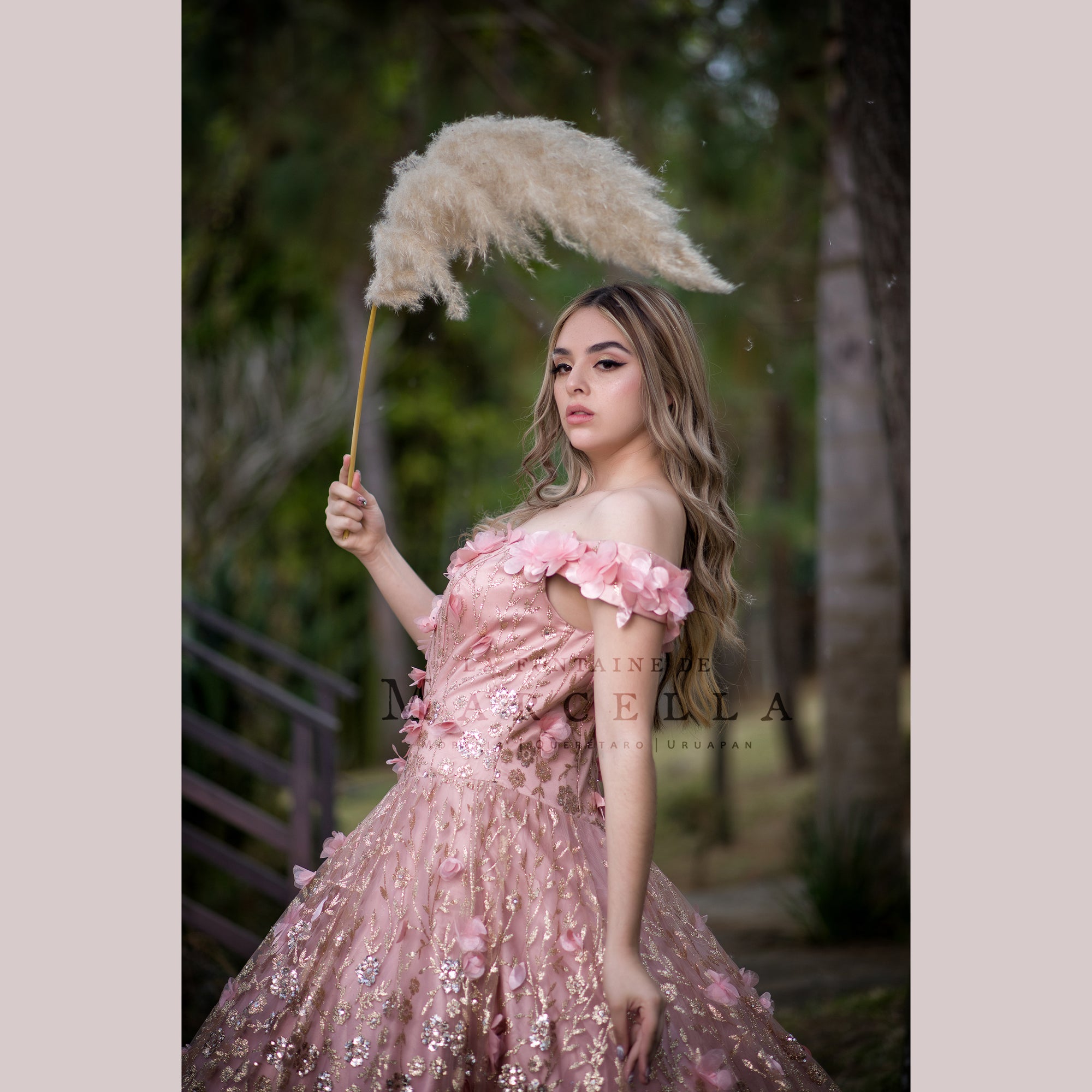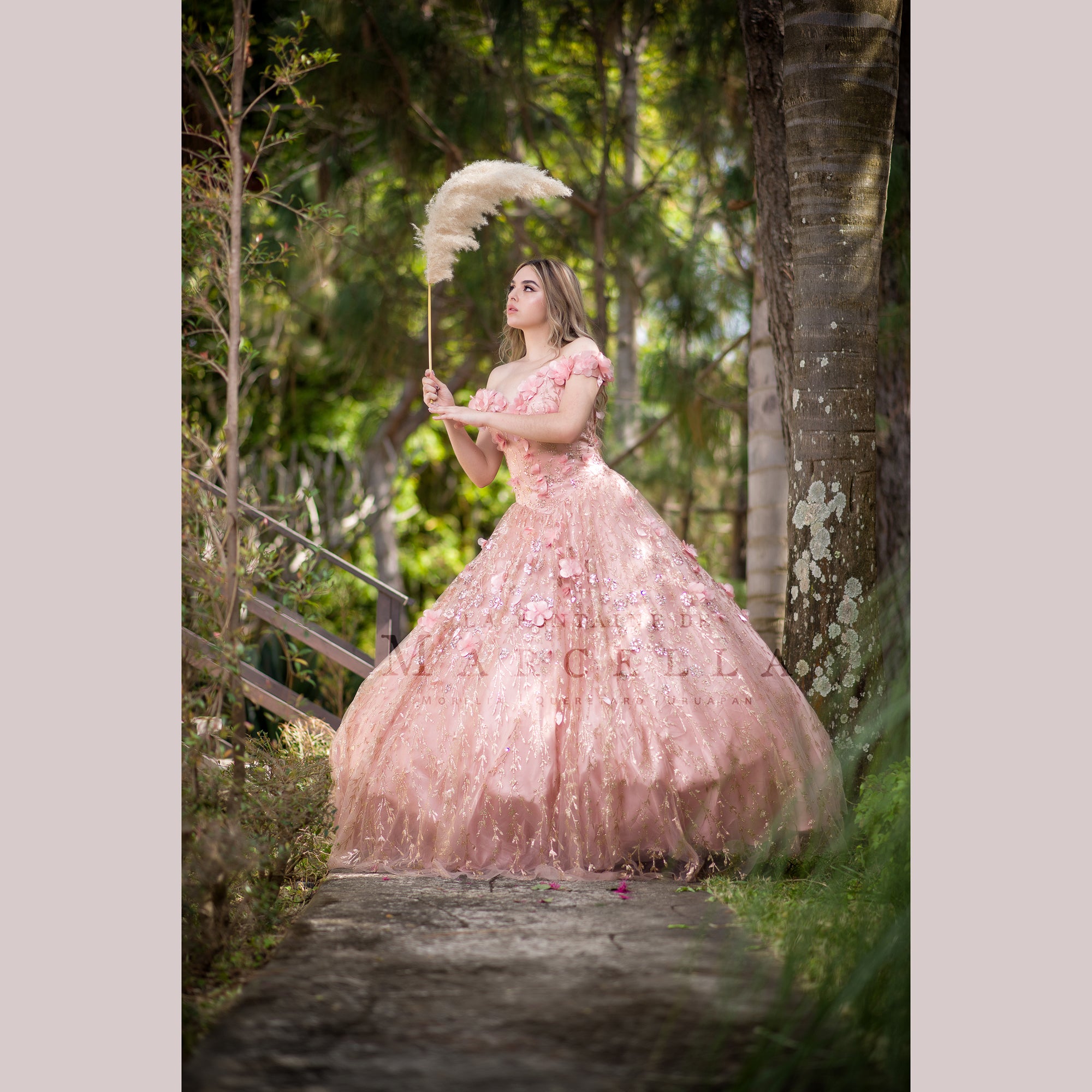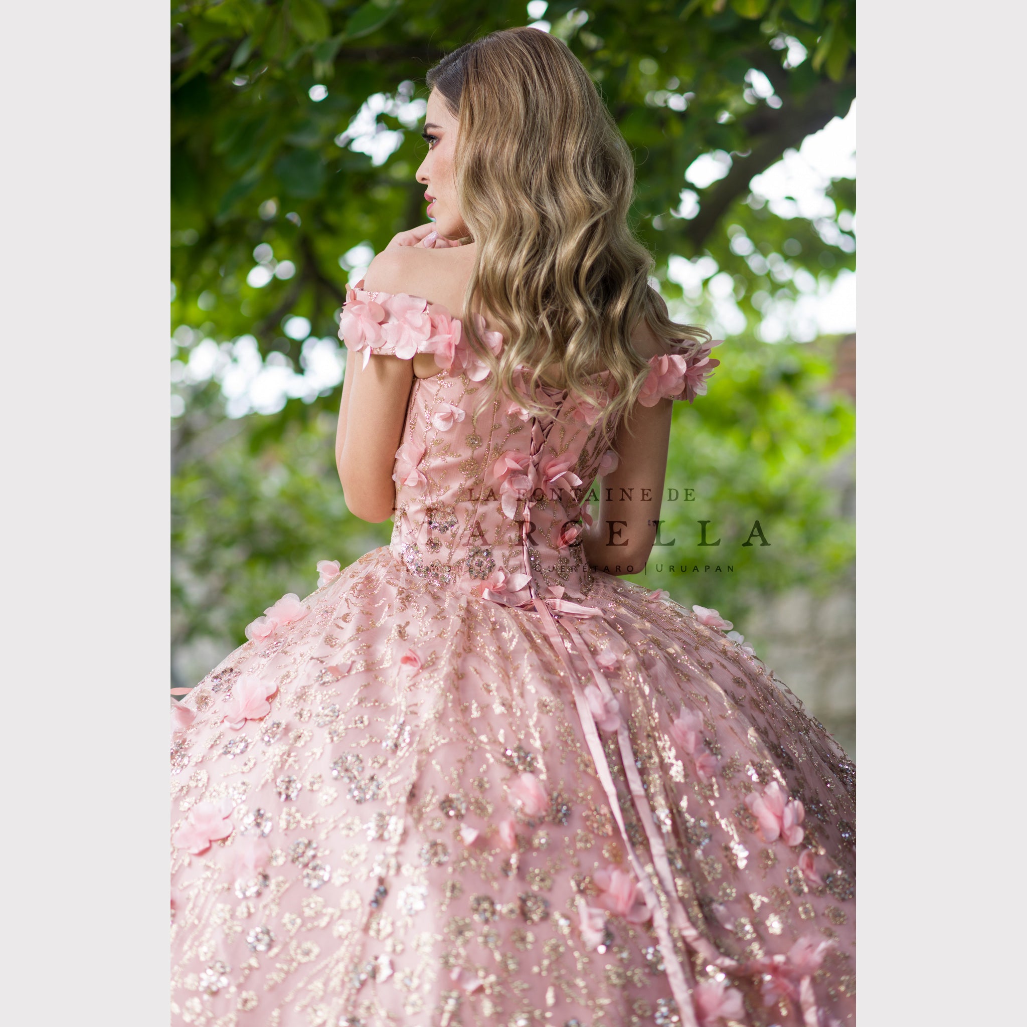 Vestido largo de corte princesa con aplicación floral y adornado con diamantina dorada, con mangas de ojal adornado con flores es recomendado para cuerpos tipo Triangulo invertido y Rectángulo. No incluye Crinolina*Leer más