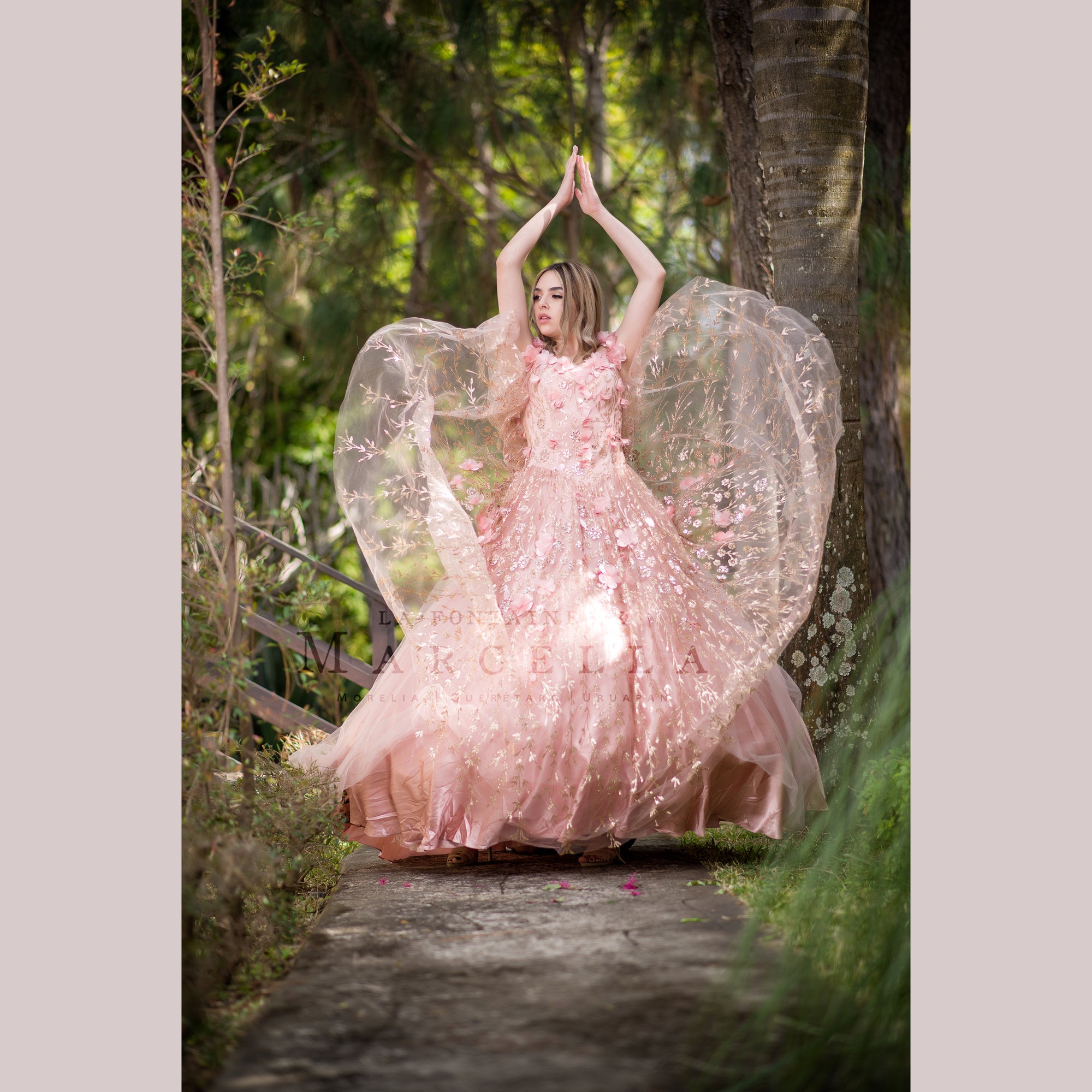 Vestido largo de corte princesa con aplicación floral y adornado con diamantina dorada, con mangas de ojal adornado con flores es recomendado para cuerpos tipo Triangulo invertido y Rectángulo.