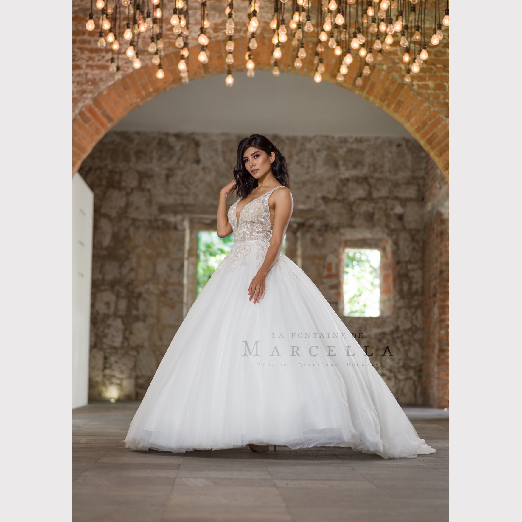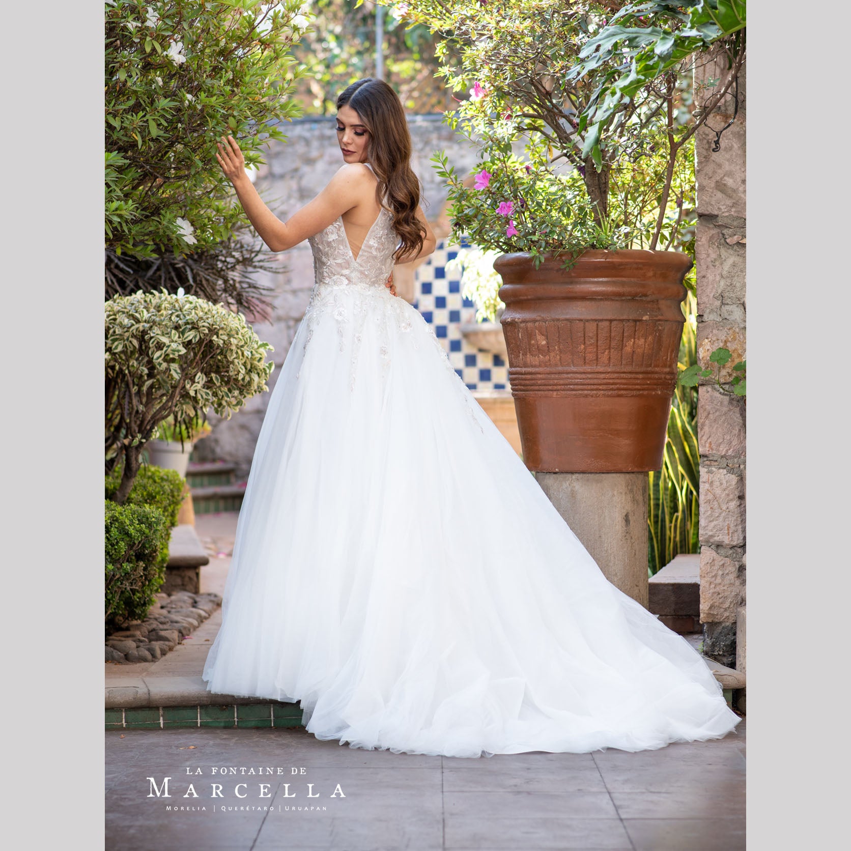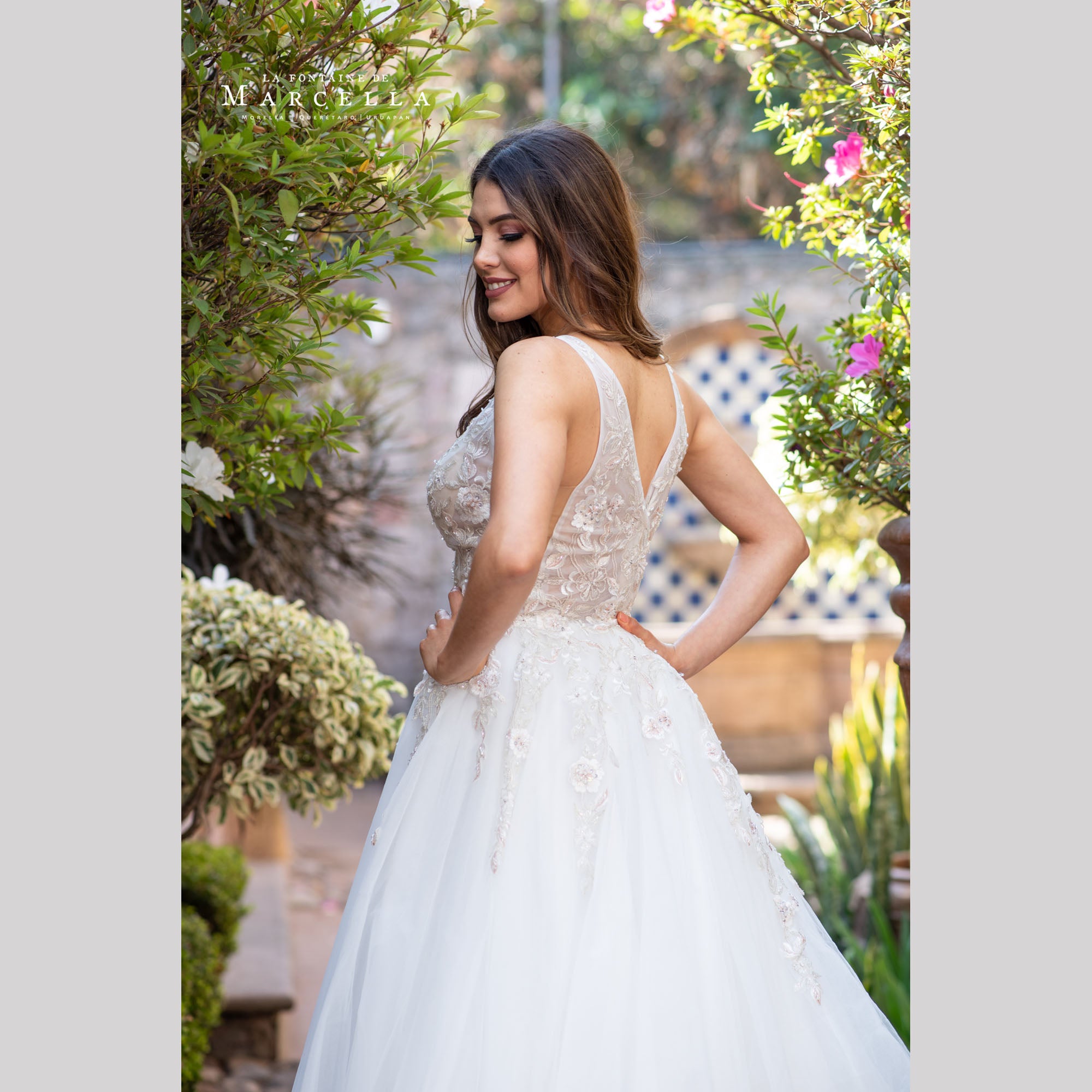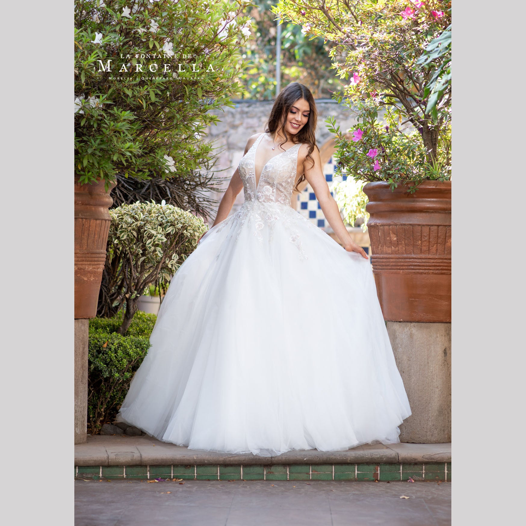 Vestido de Novia corte princesa, con escote en V y transparencia, adornado con encaje floral. Recomendado para cuerpos tipo Rectángulo, Triangulo Invertido y Reloj de Arena. No incluye Crinolina*Leer más