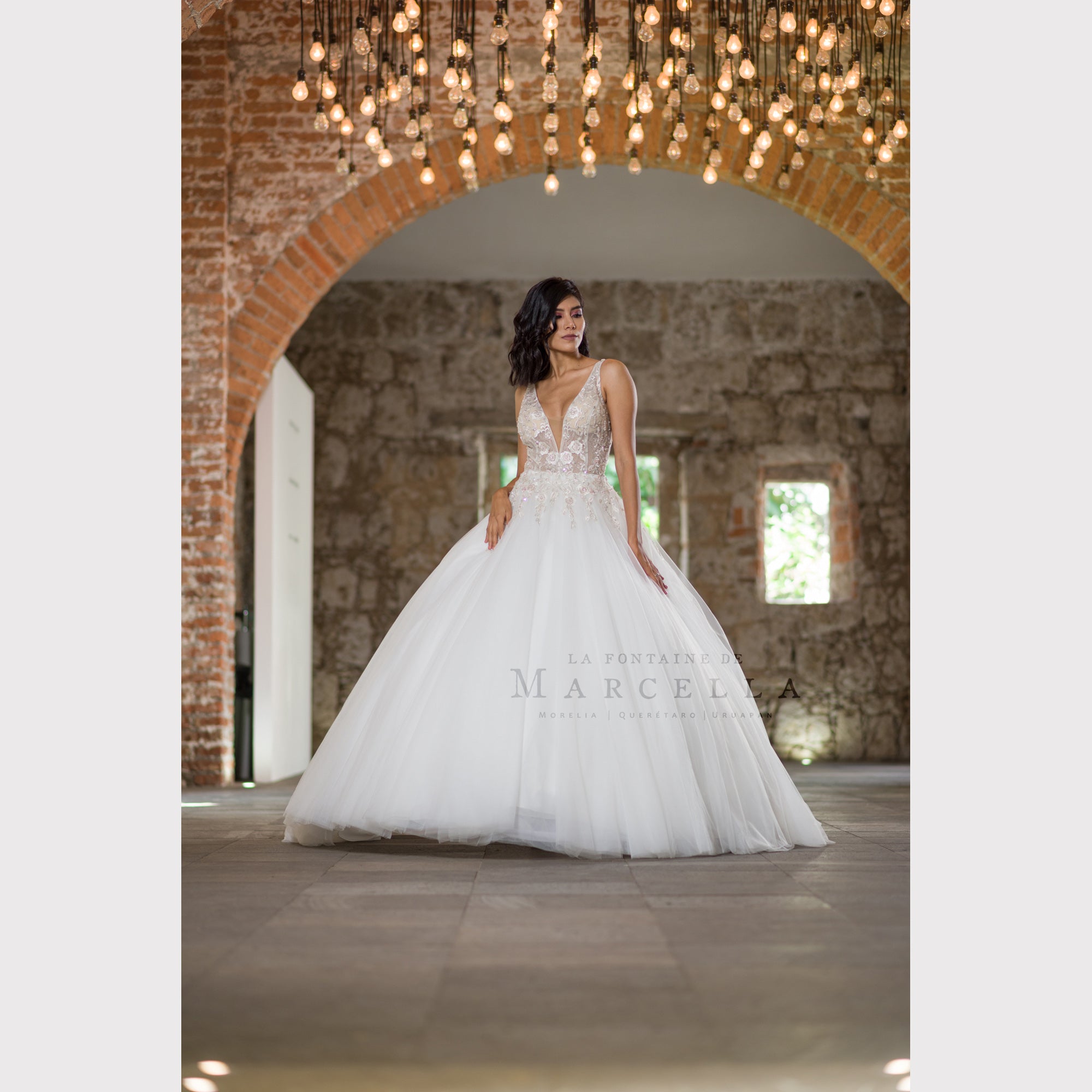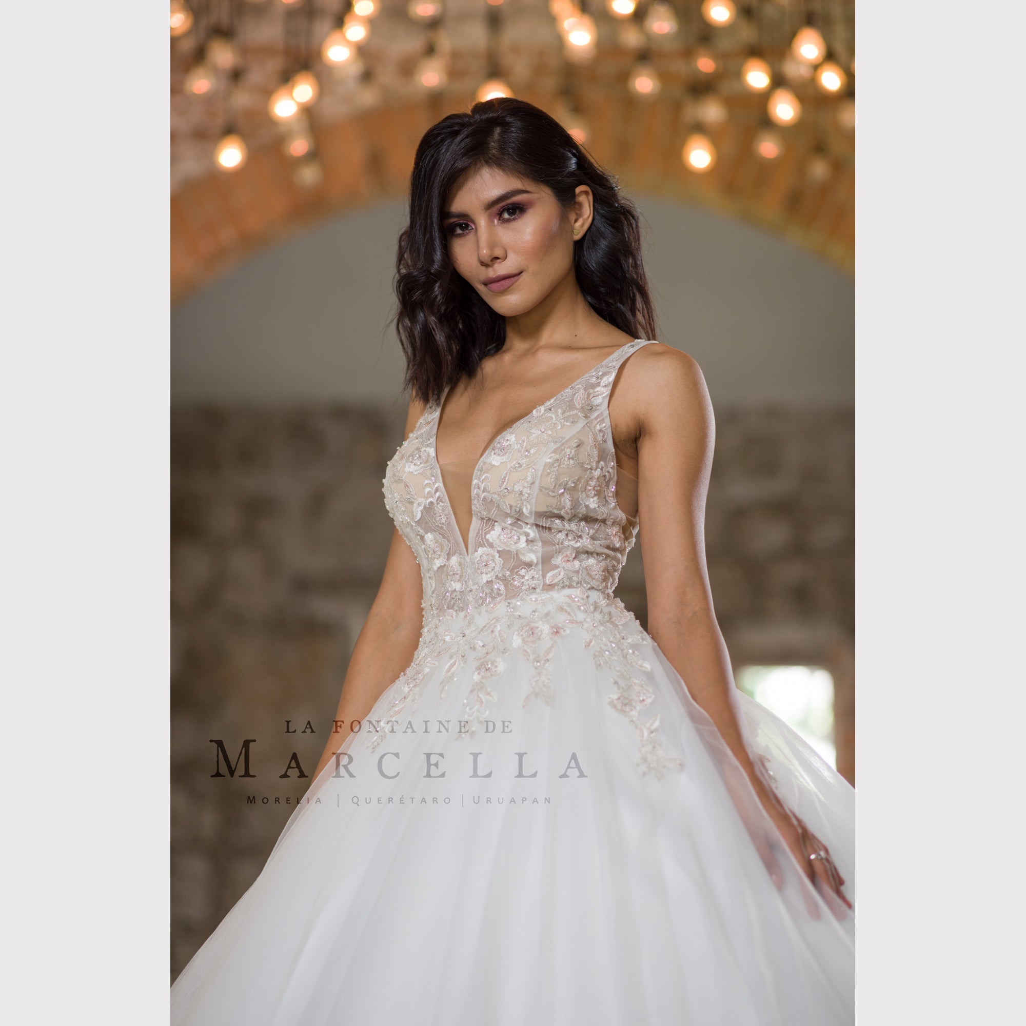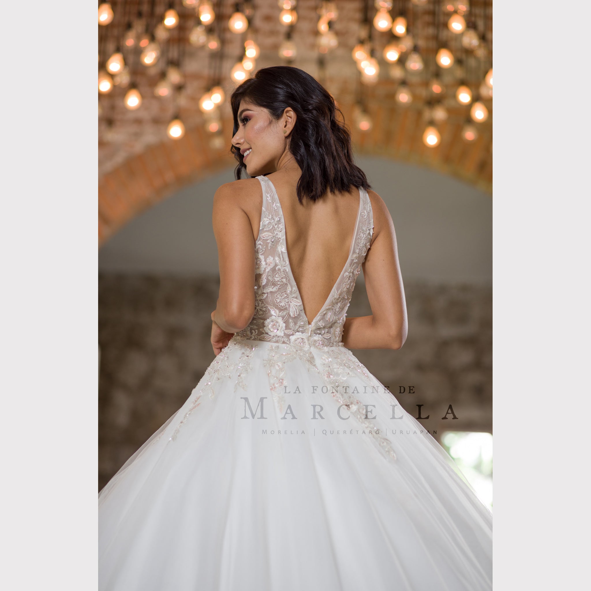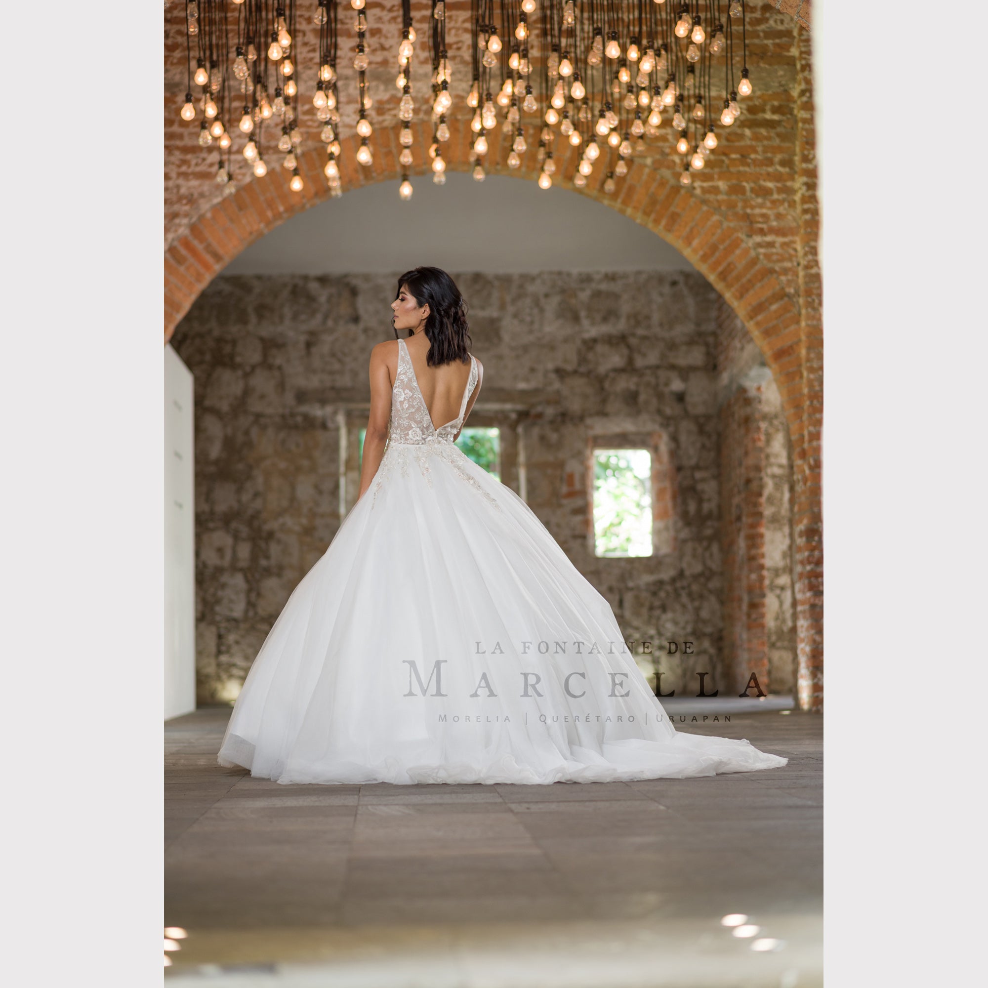 Vestido de Novia corte princesa, con escote en V y transparencia, adornado con encaje floral. Recomendado para cuerpos tipo Rectángulo, Triangulo Invertido y Reloj de Arena. No incluye Crinolina*Leer más