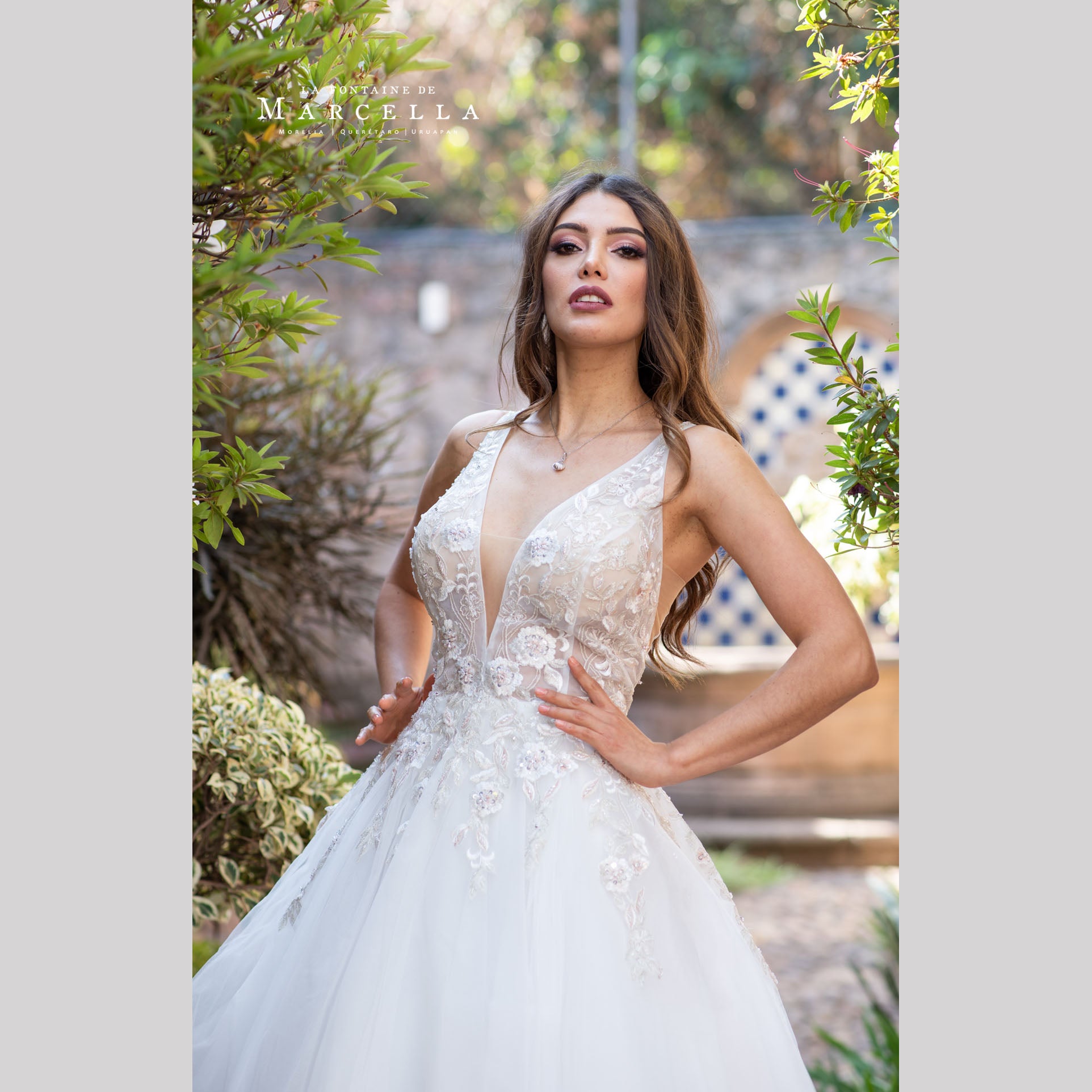 Vestido de Novia corte princesa, con escote en V y transparencia, adornado con encaje floral. Recomendado para cuerpos tipo Rectángulo, Triangulo Invertido y Reloj de Arena.