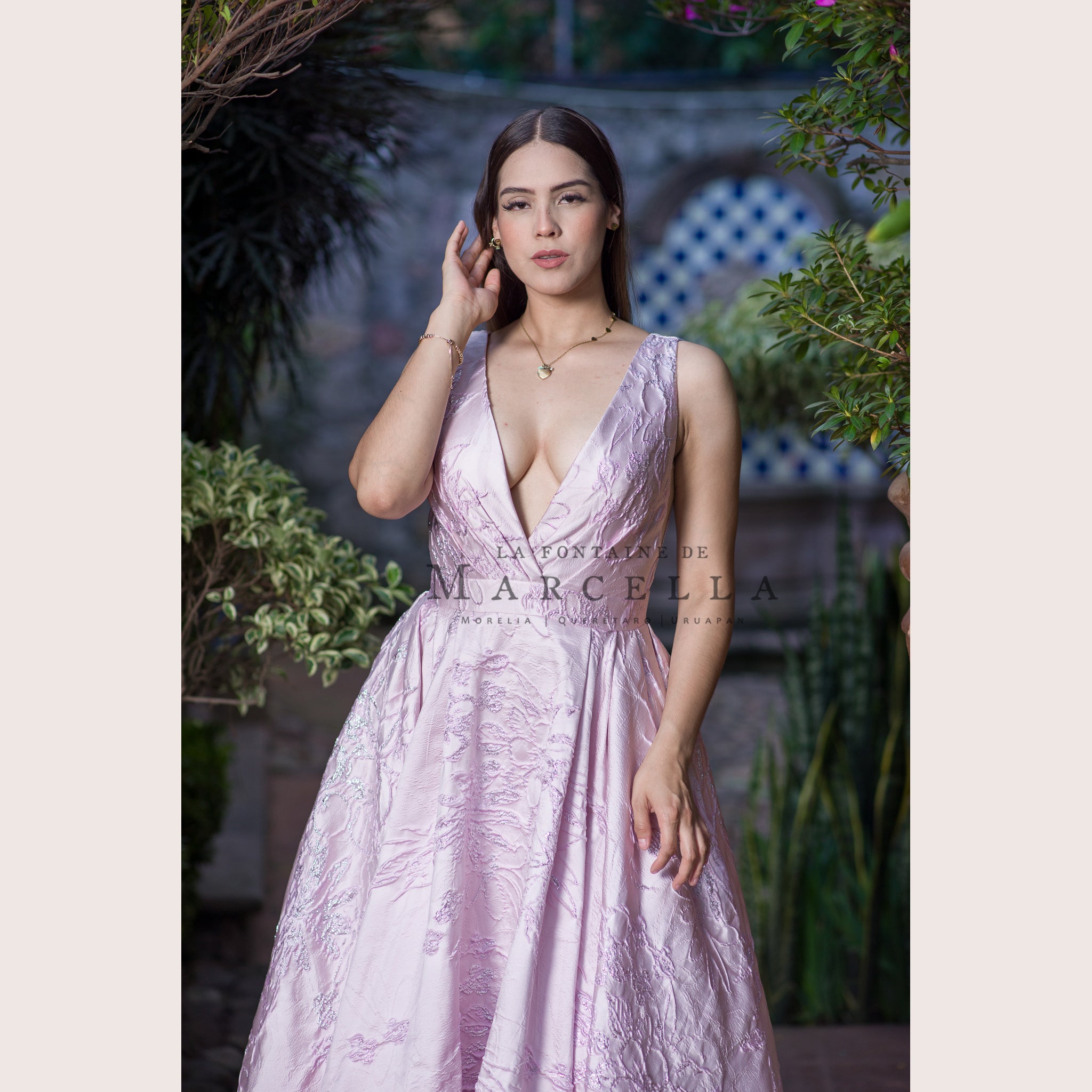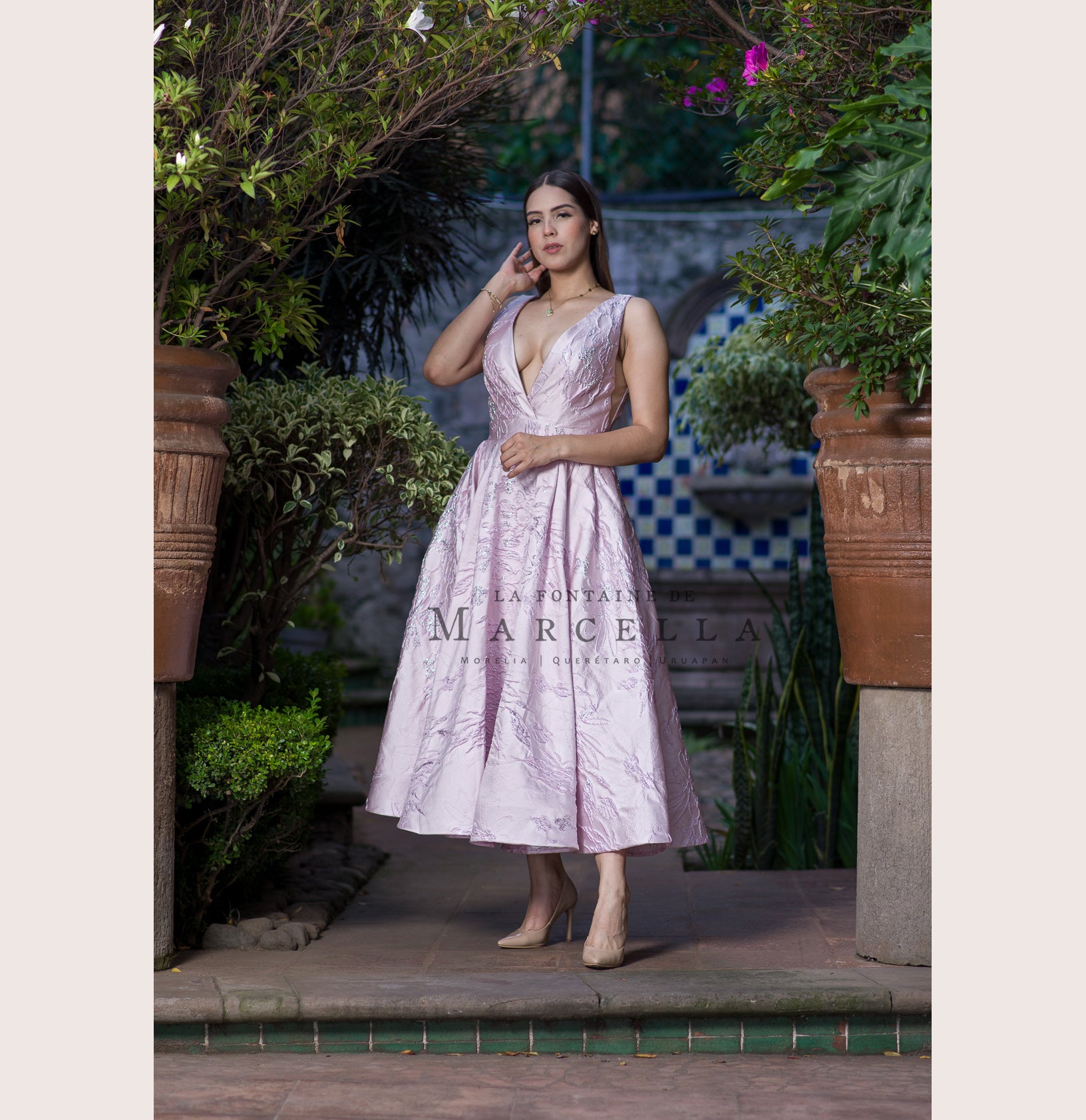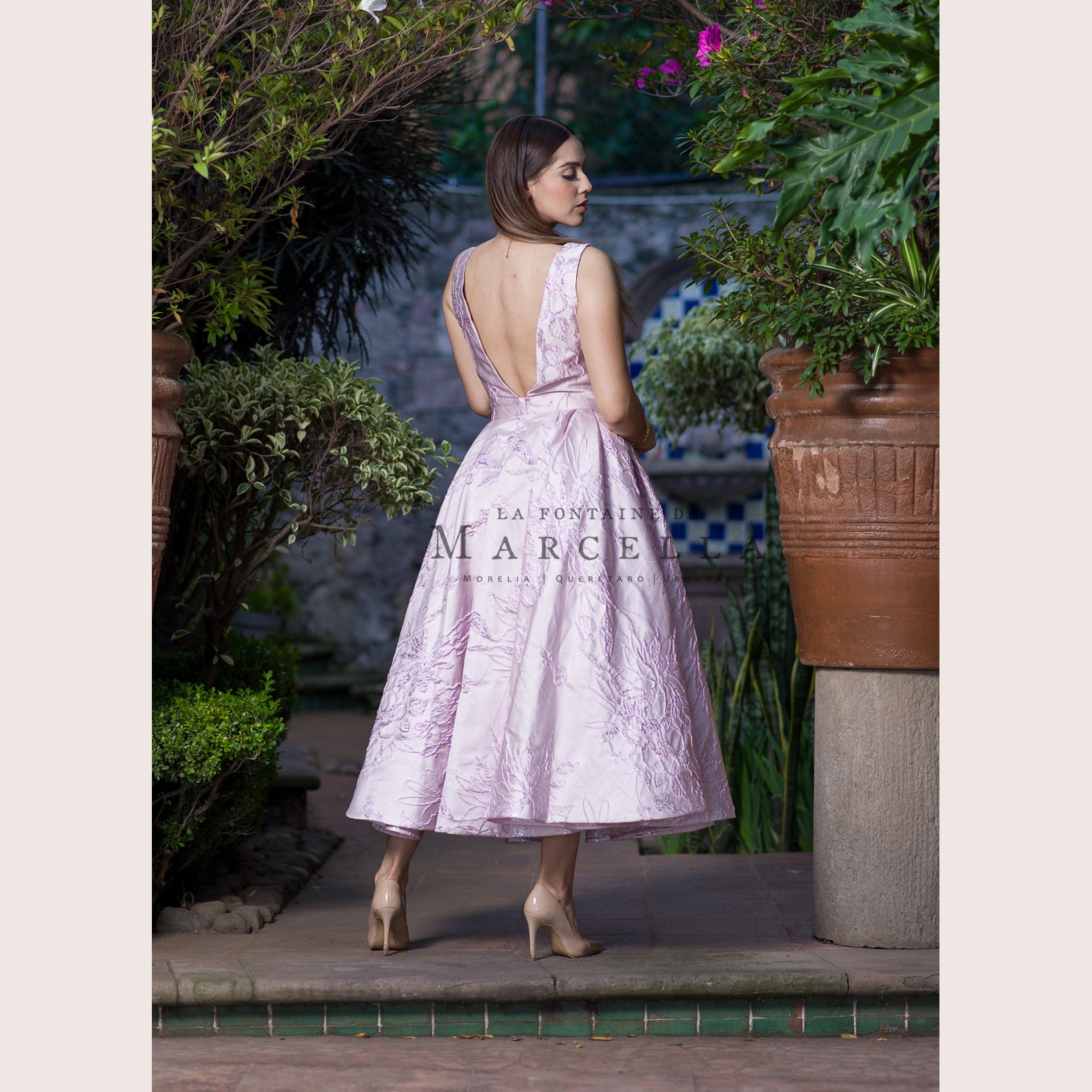 Vestido midi de corte princesa, tirante de ojal, escote en V y tela con relieve, recomendado para cuerpos tipo Triangulo Invertido y Rectángulo.