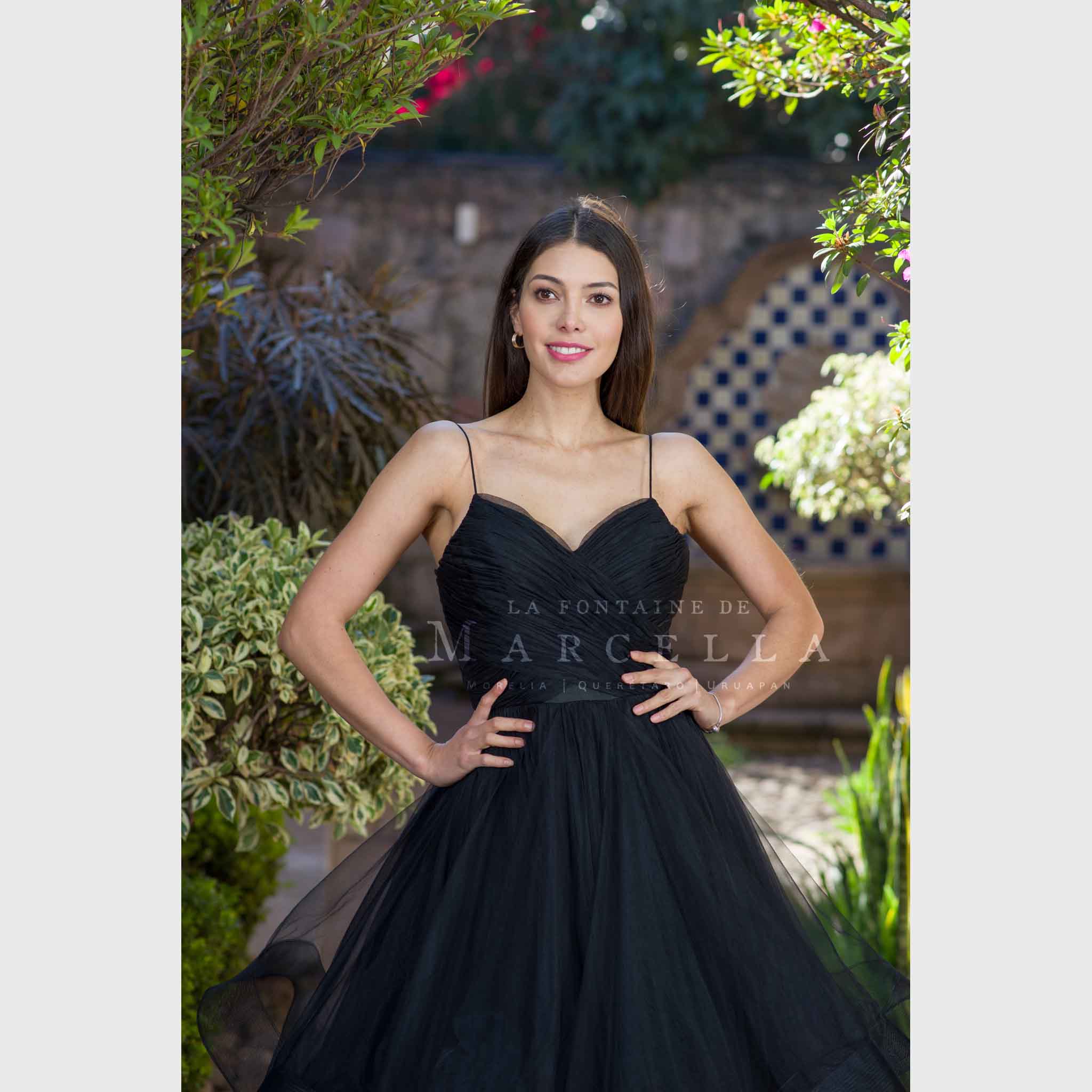 Vestido largo con detalle de pliegues, ideal para cuerpos tipo triangulo invertido y rectángulo.