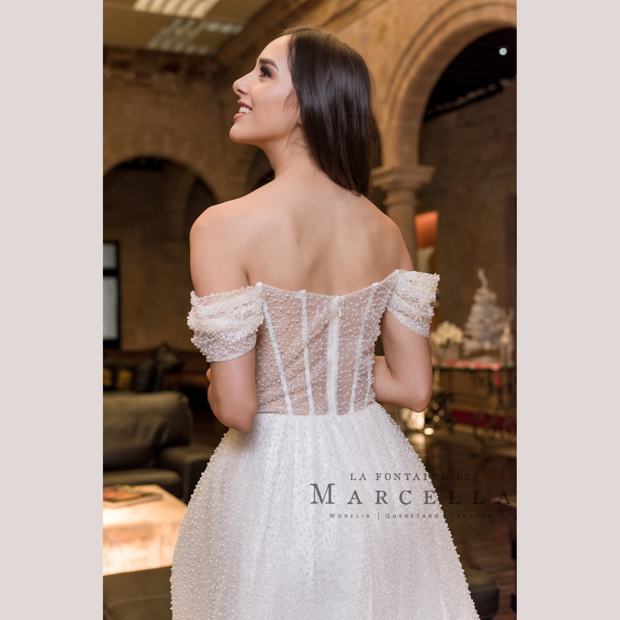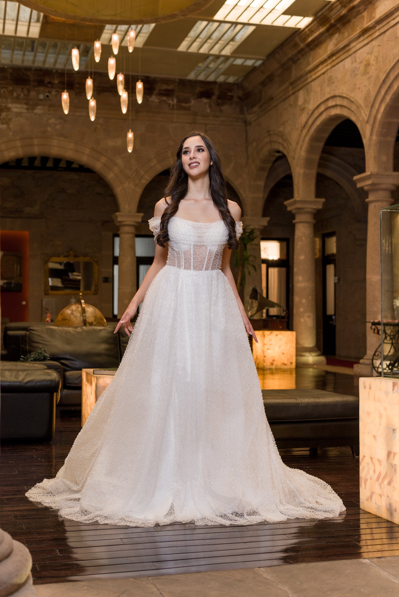 Vestido largo corte princesa con manga de olan y transparencia, es recomendado para cuerpos tipo Rectángulo y Triangulo Invertido. Leer más