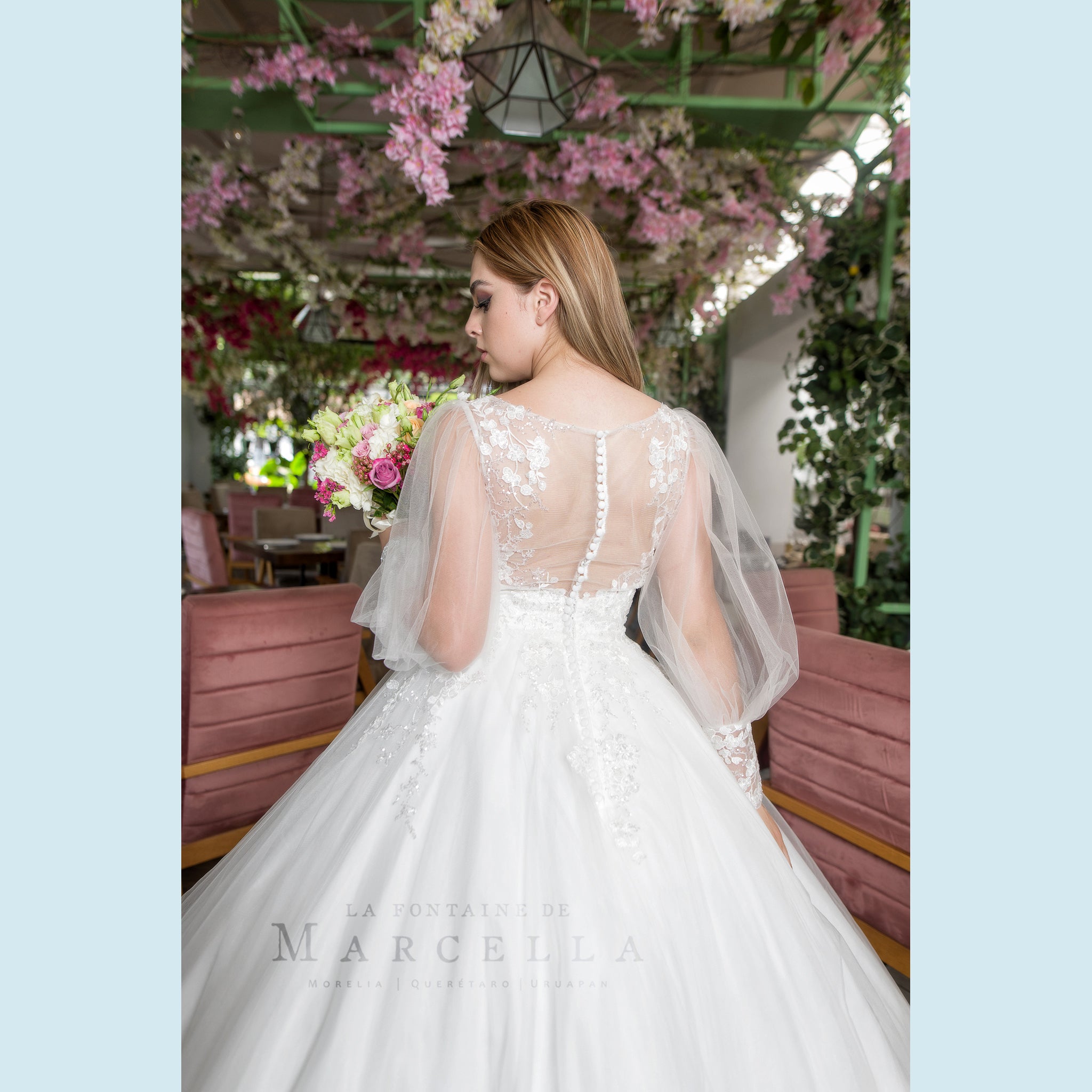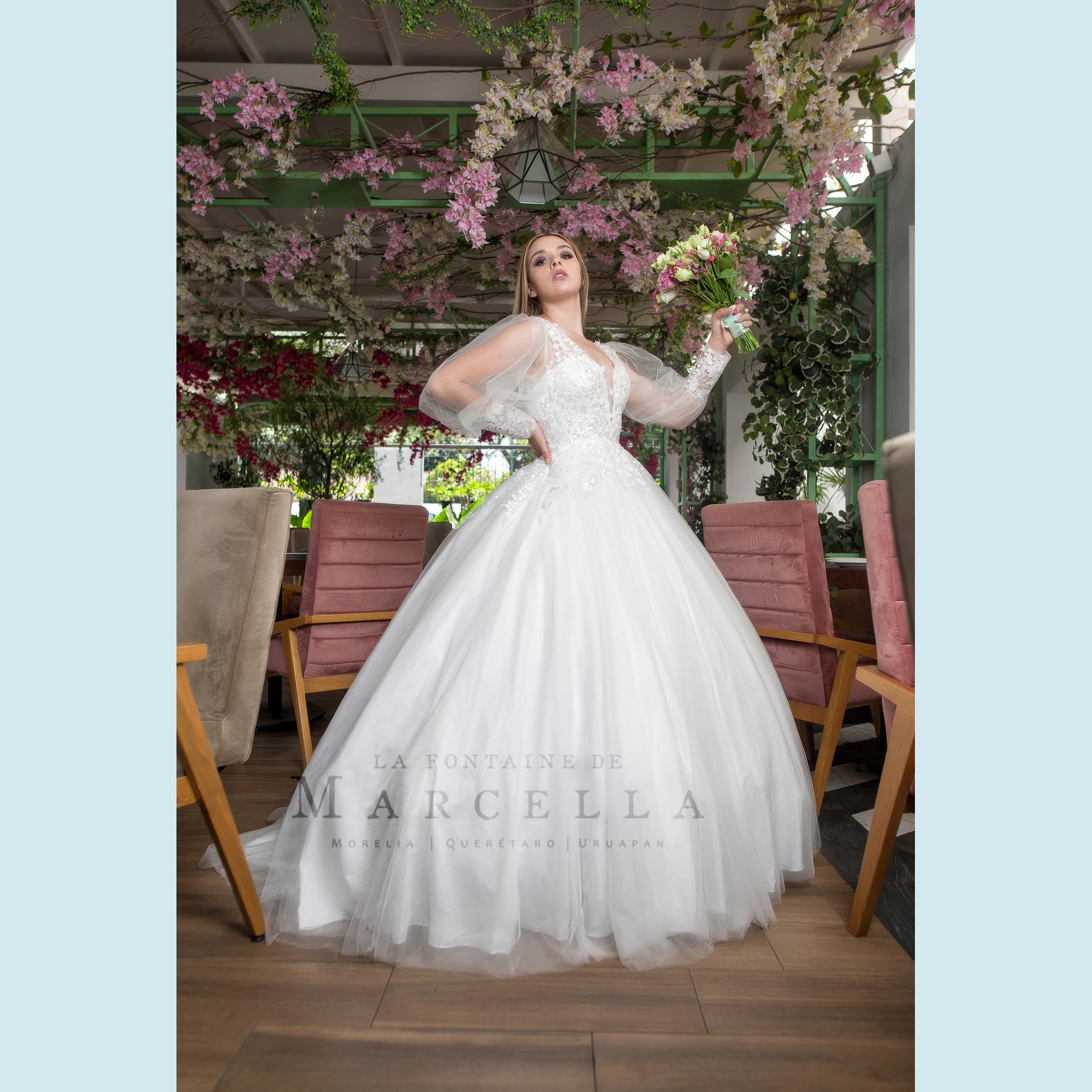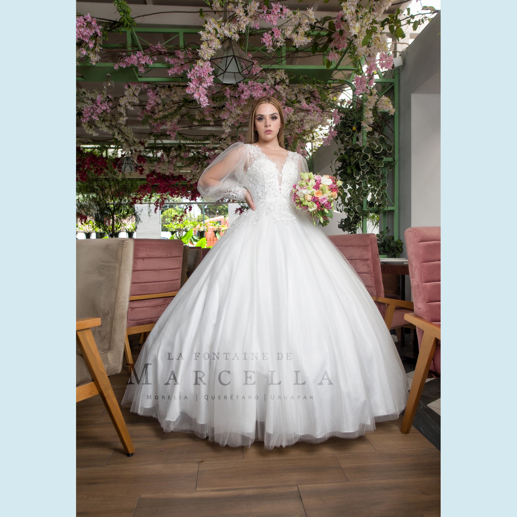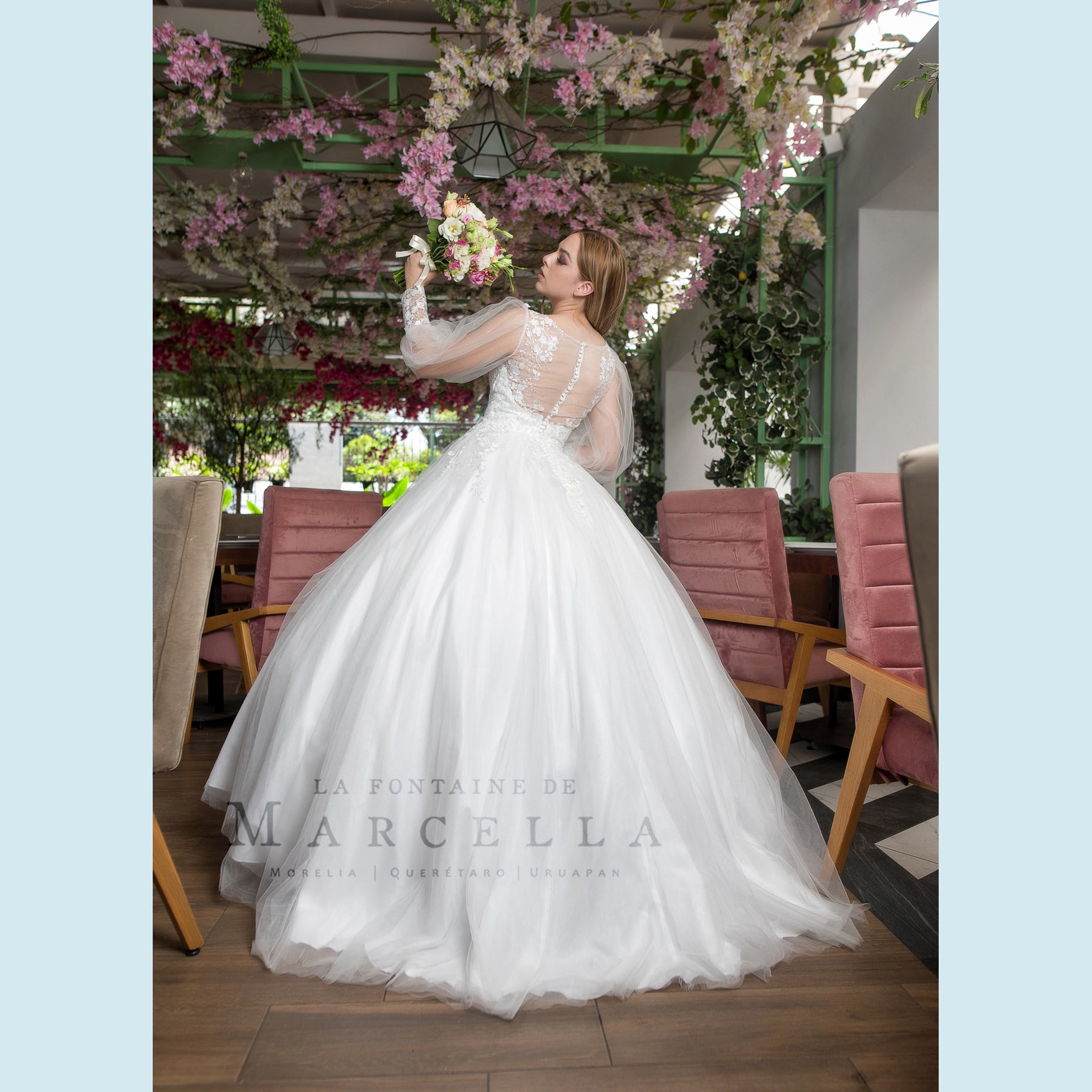 Vestido corte princesa con manga abullonada semi transparente, adornado con aplicación en la parte superior, es recomendado para cuerpos tipo Triangulo Invertido y Rectangulo.Leer más