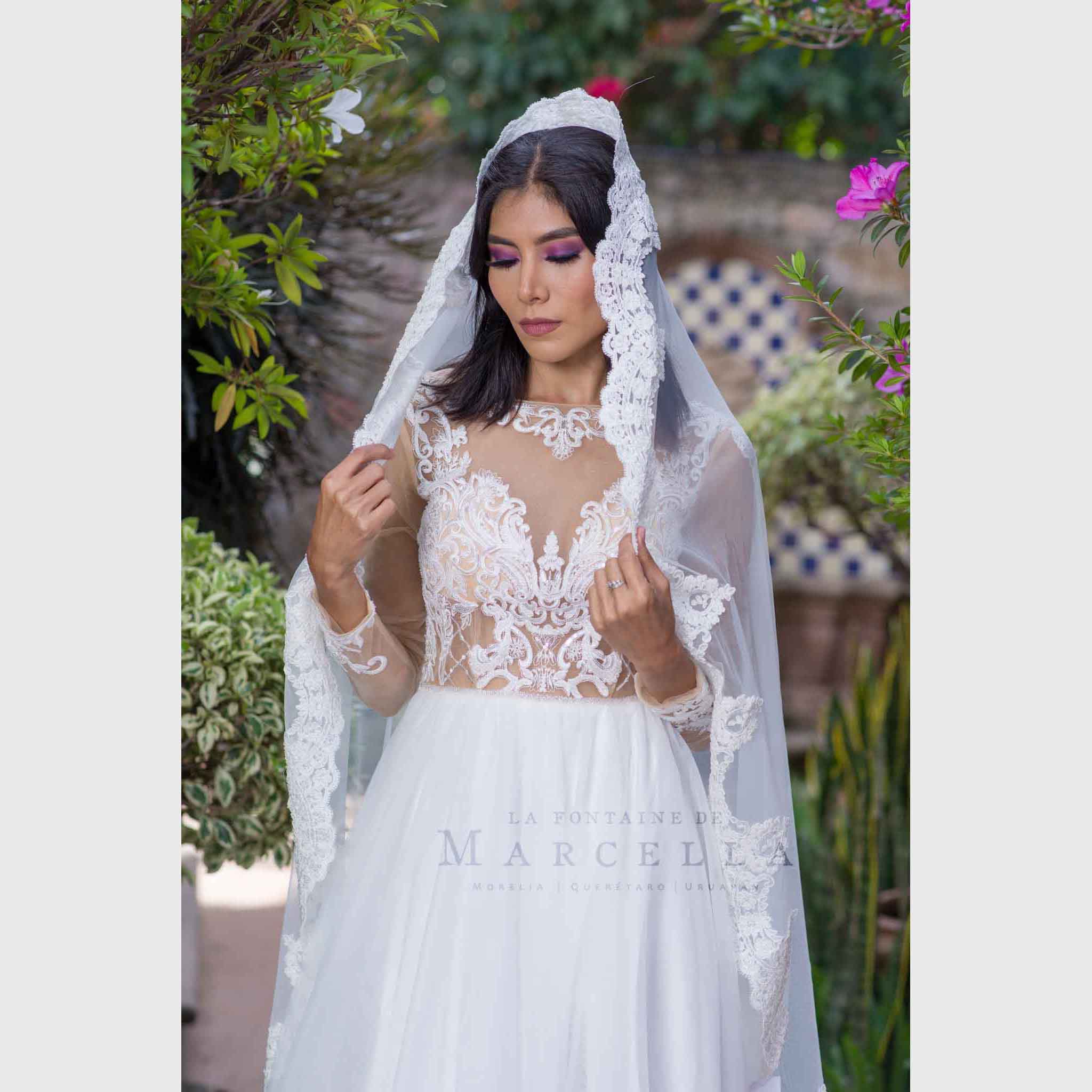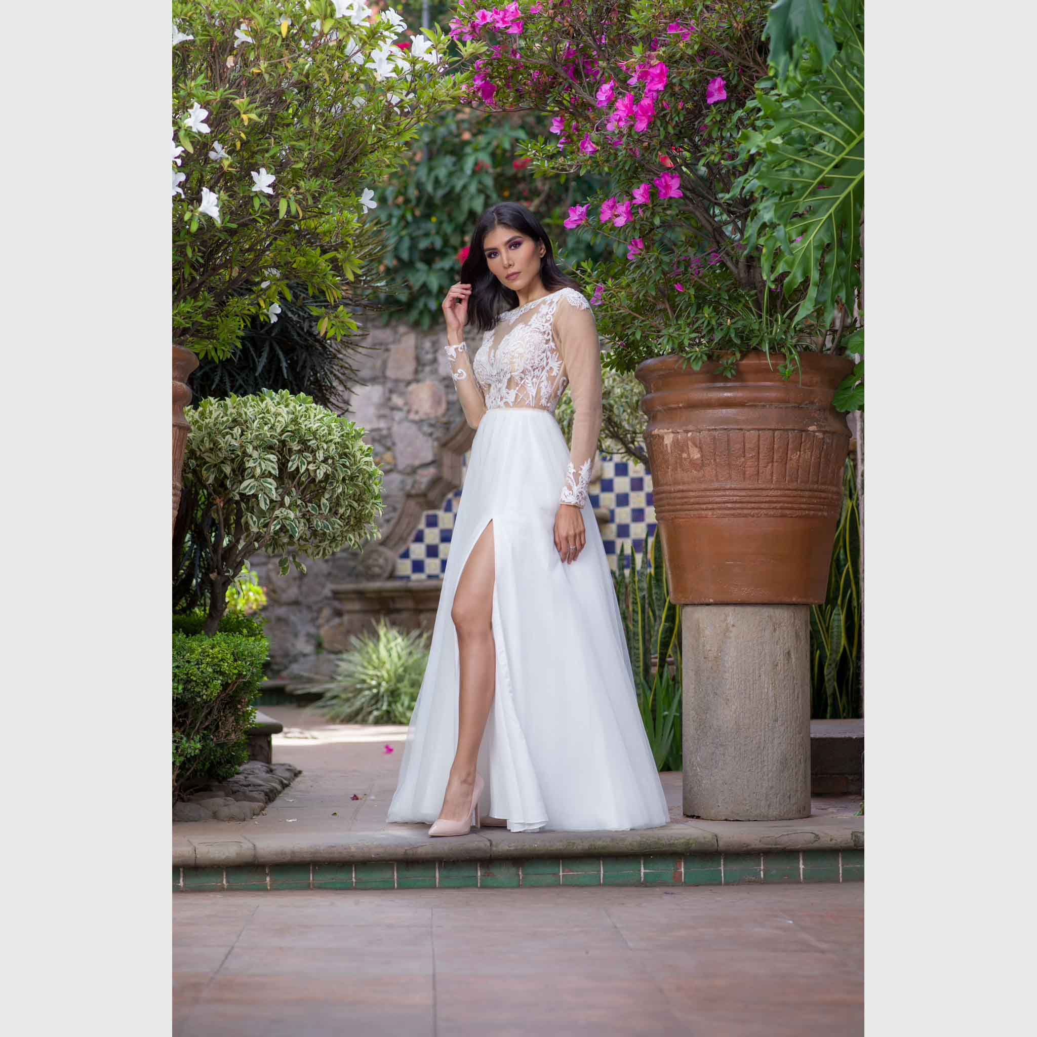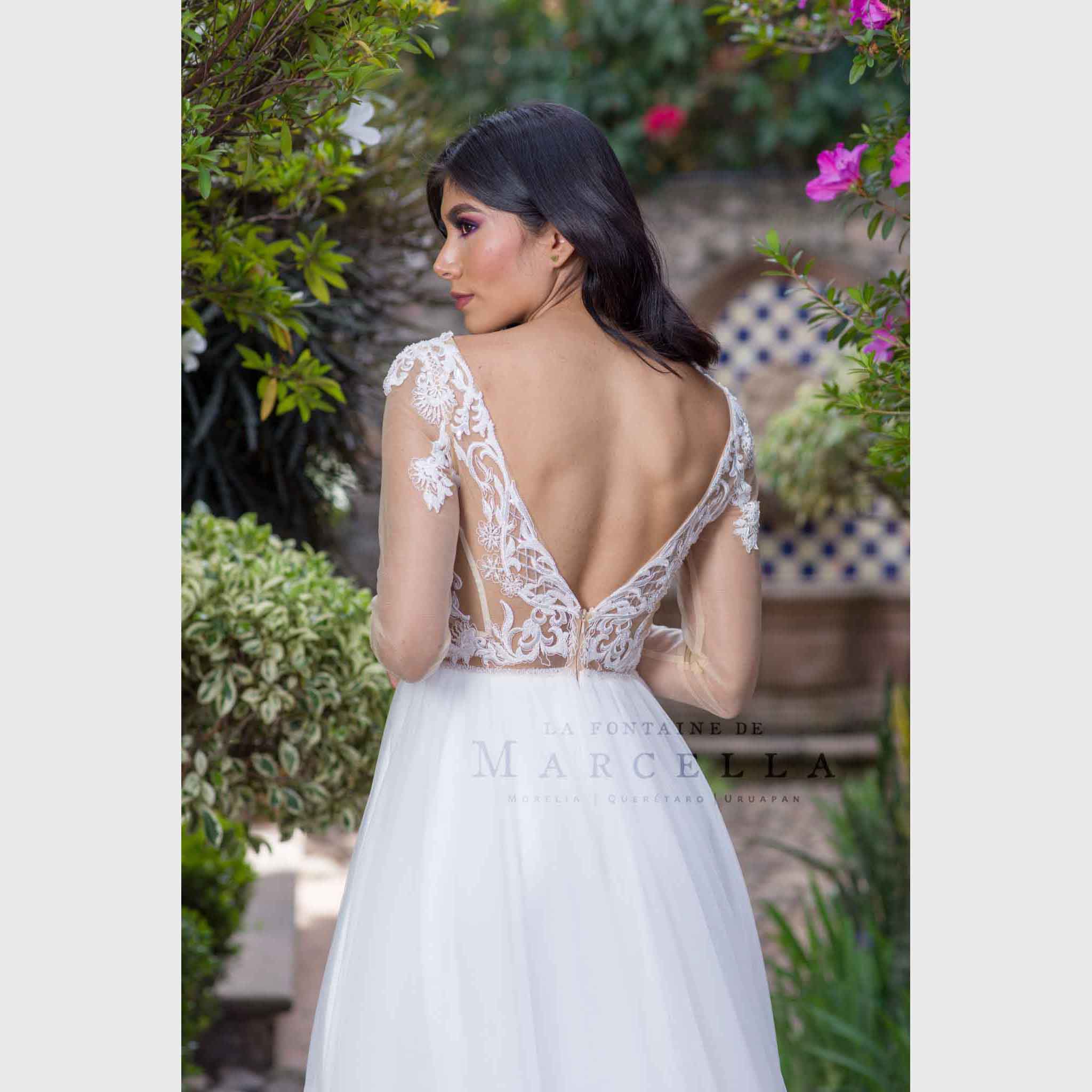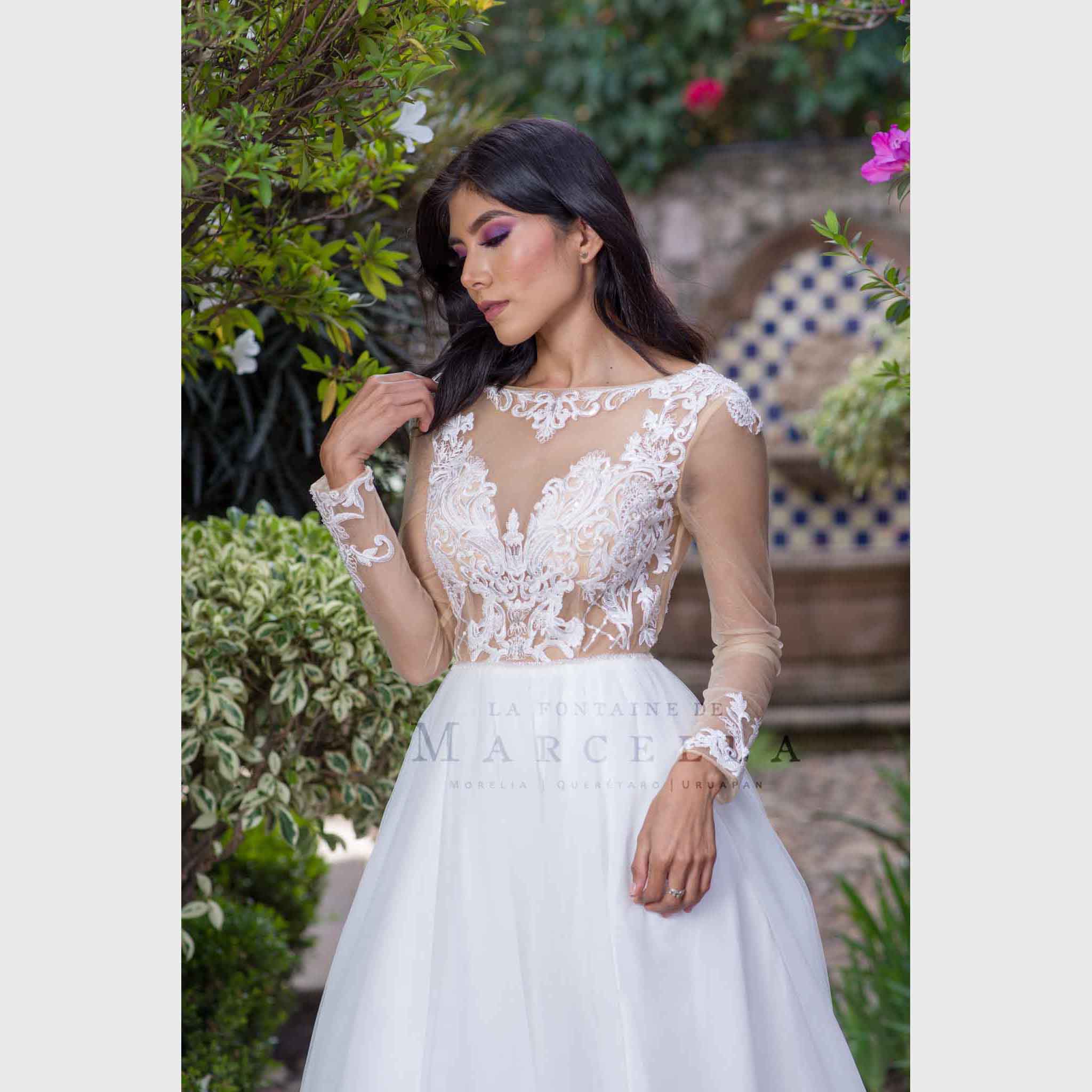 Vestido de Novia de Manga larga adornado con aplicación y transparencia, con espalda en V y transparencia, recomendado para cuerpos tipo Rectángulo y Reloj de Arena. No incluye mantilla*Leer más