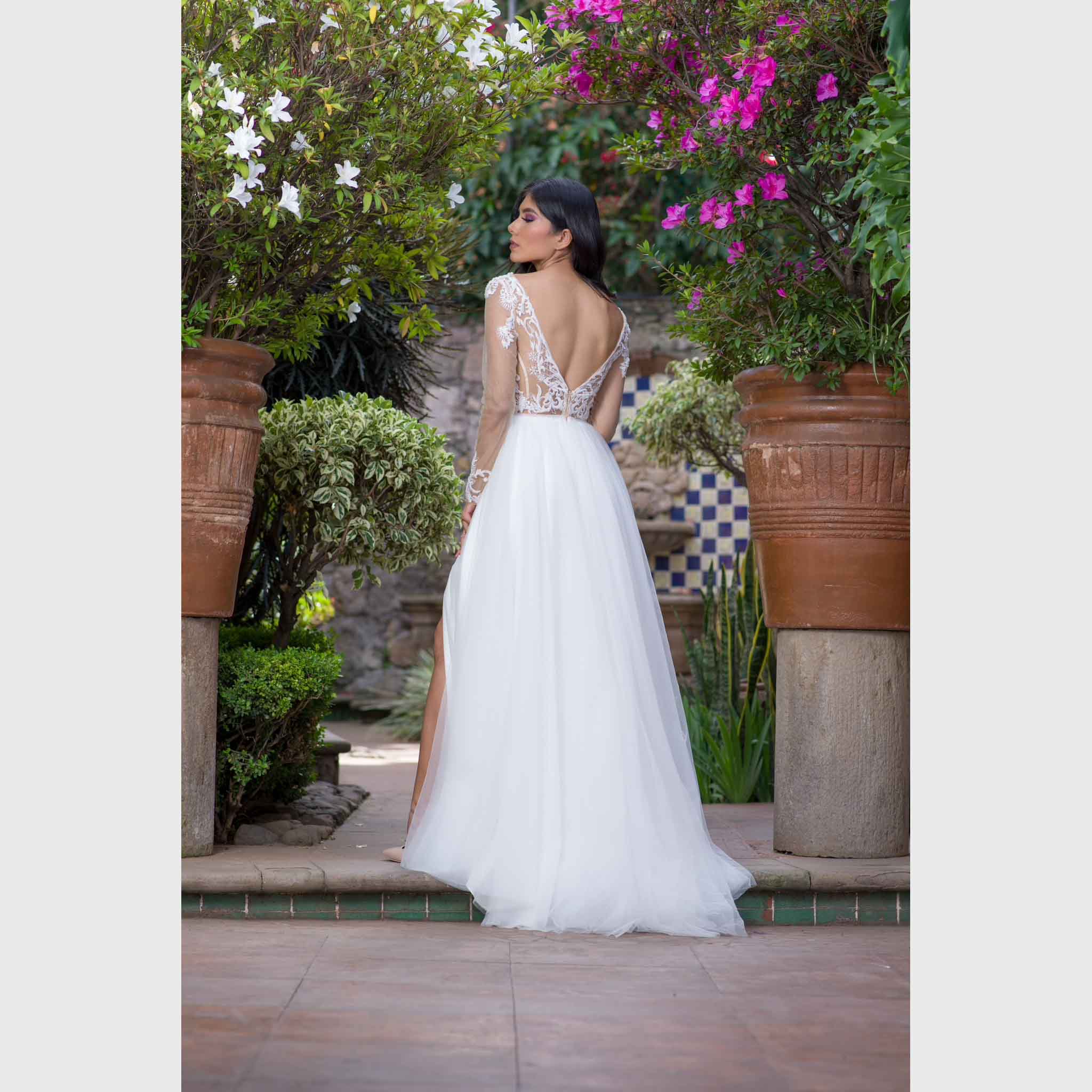 Vestido de Novia de Manga larga adornado con aplicación y transparencia, con espalda en V y transparencia, recomendado para cuerpos tipo Rectángulo y Reloj de Arena.