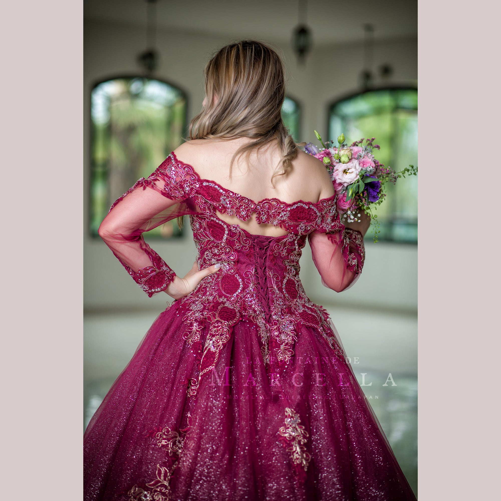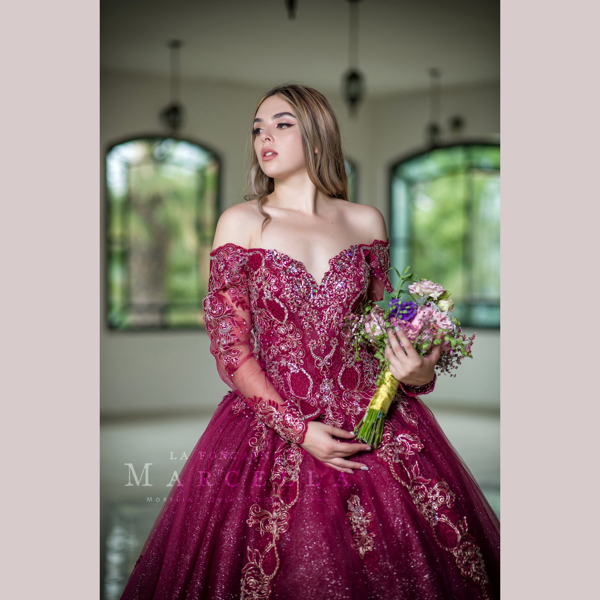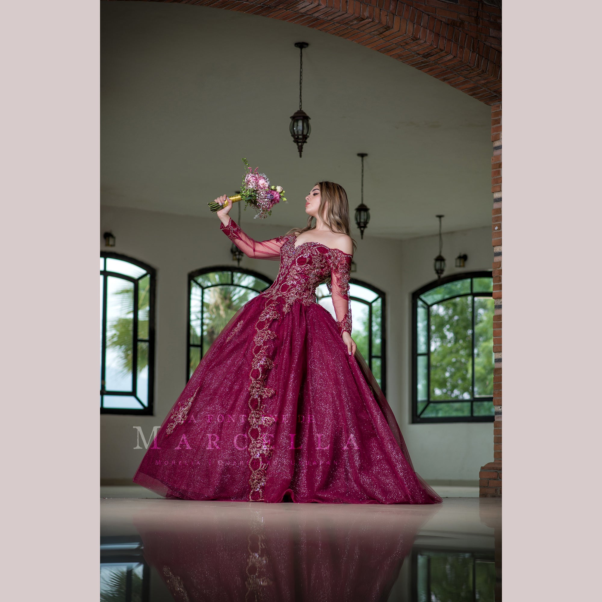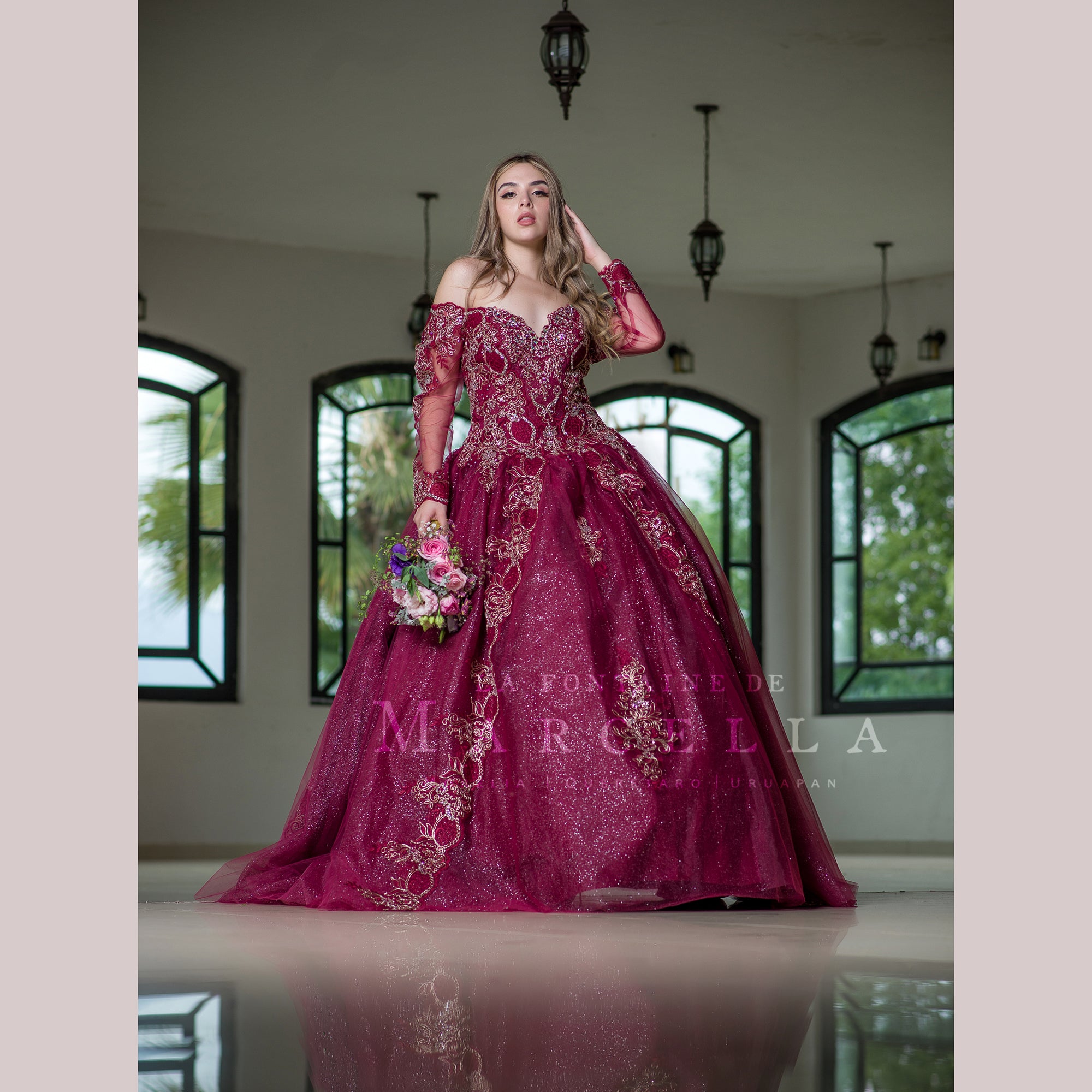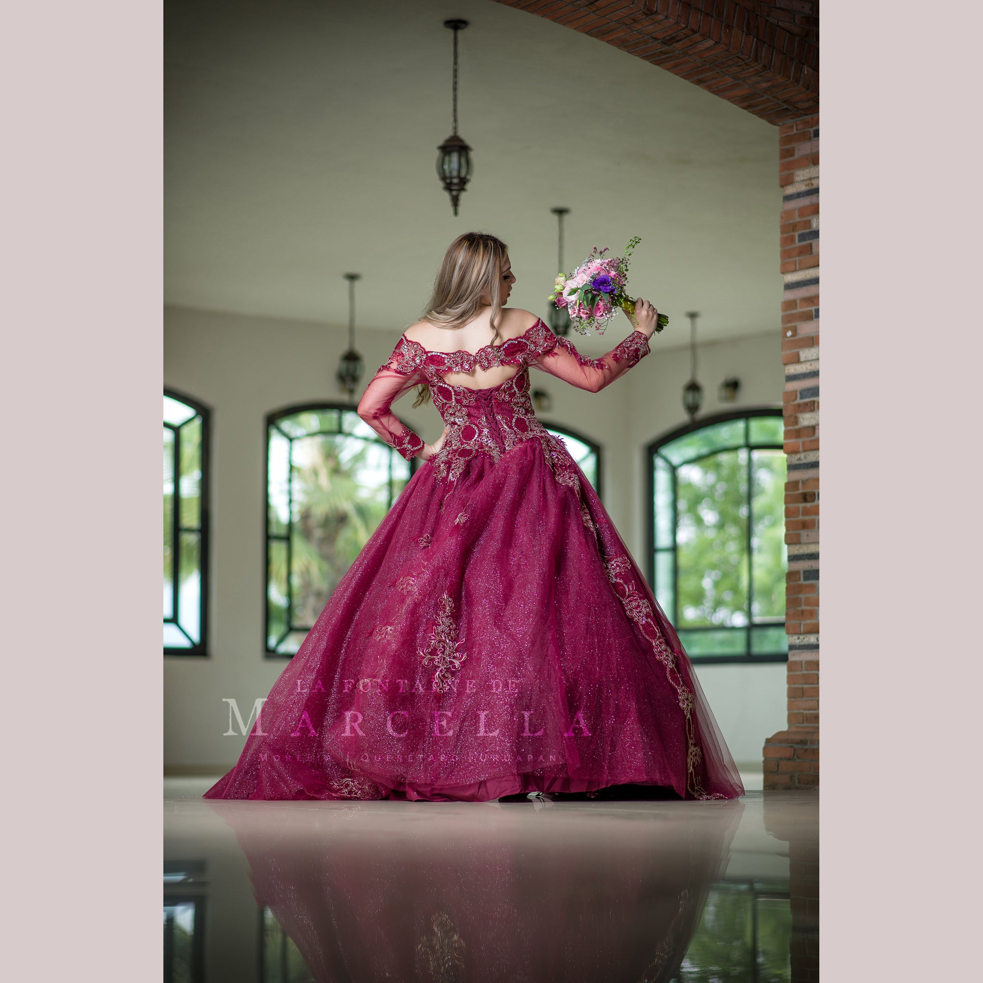 Vestido corte princesa con manga larga en semi transparencia, adornado con aplicación es recomendado para cuerpos tipo Reloj de Arena, Triangulo Invertido y Rectángulo.Leer más