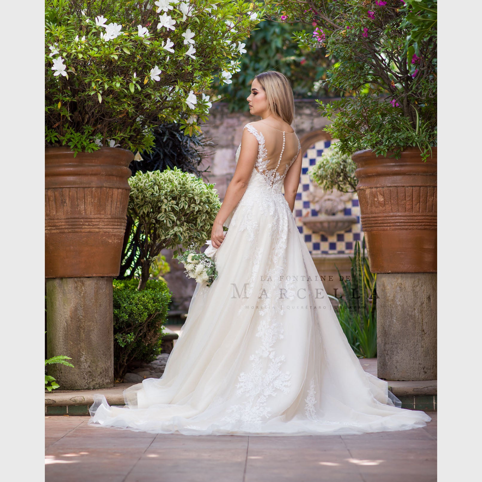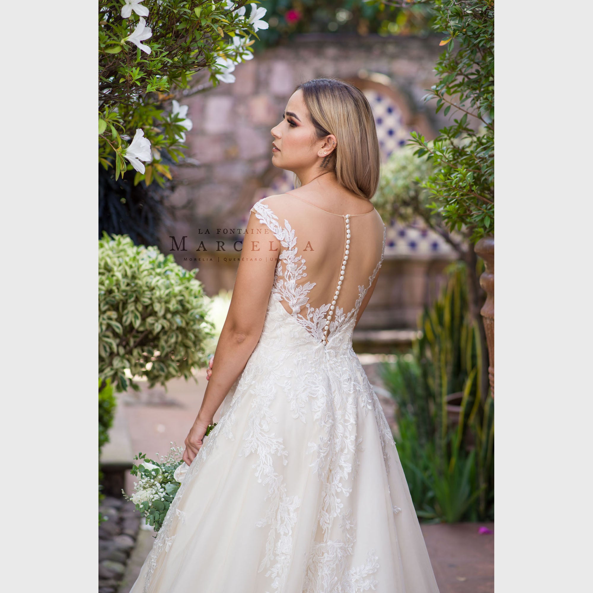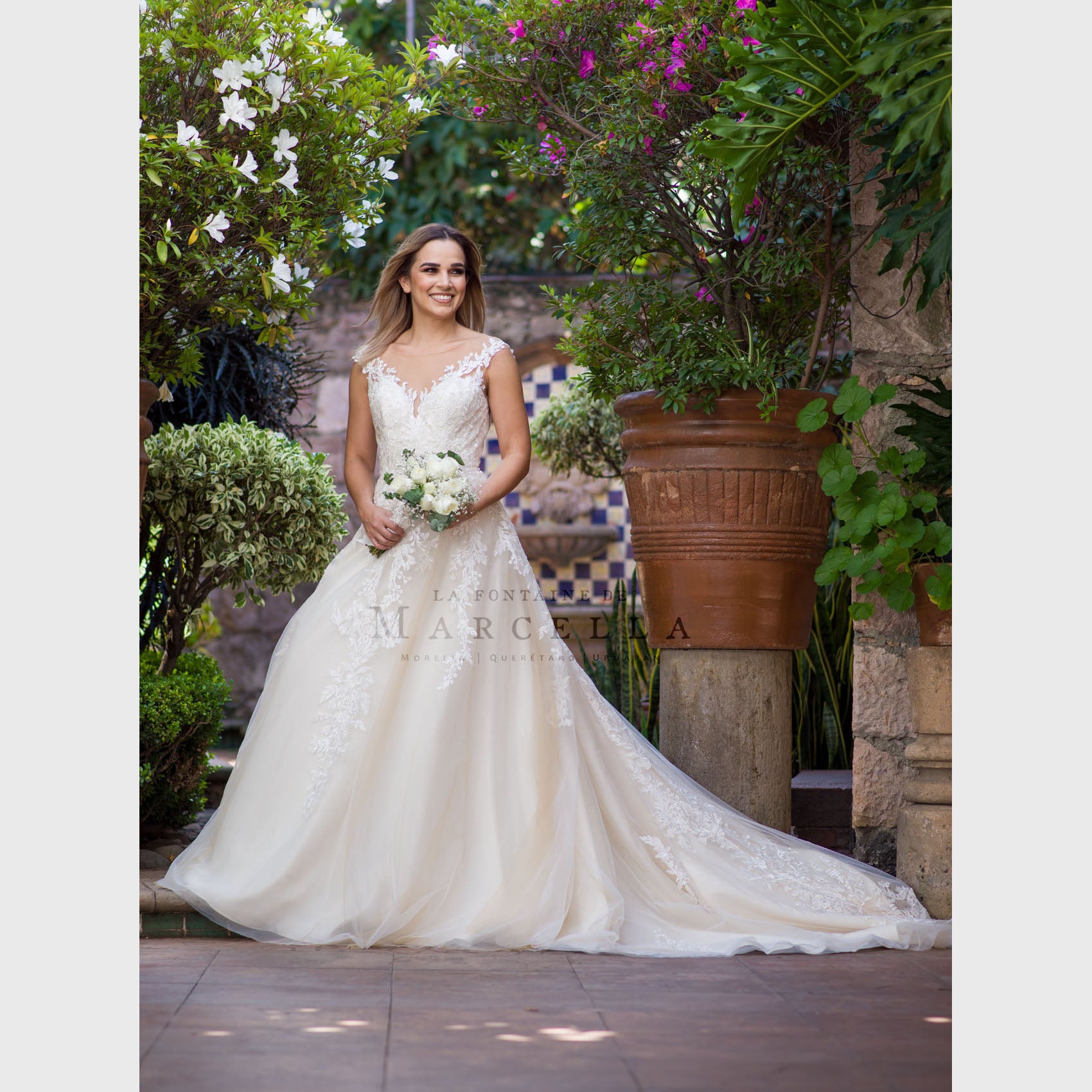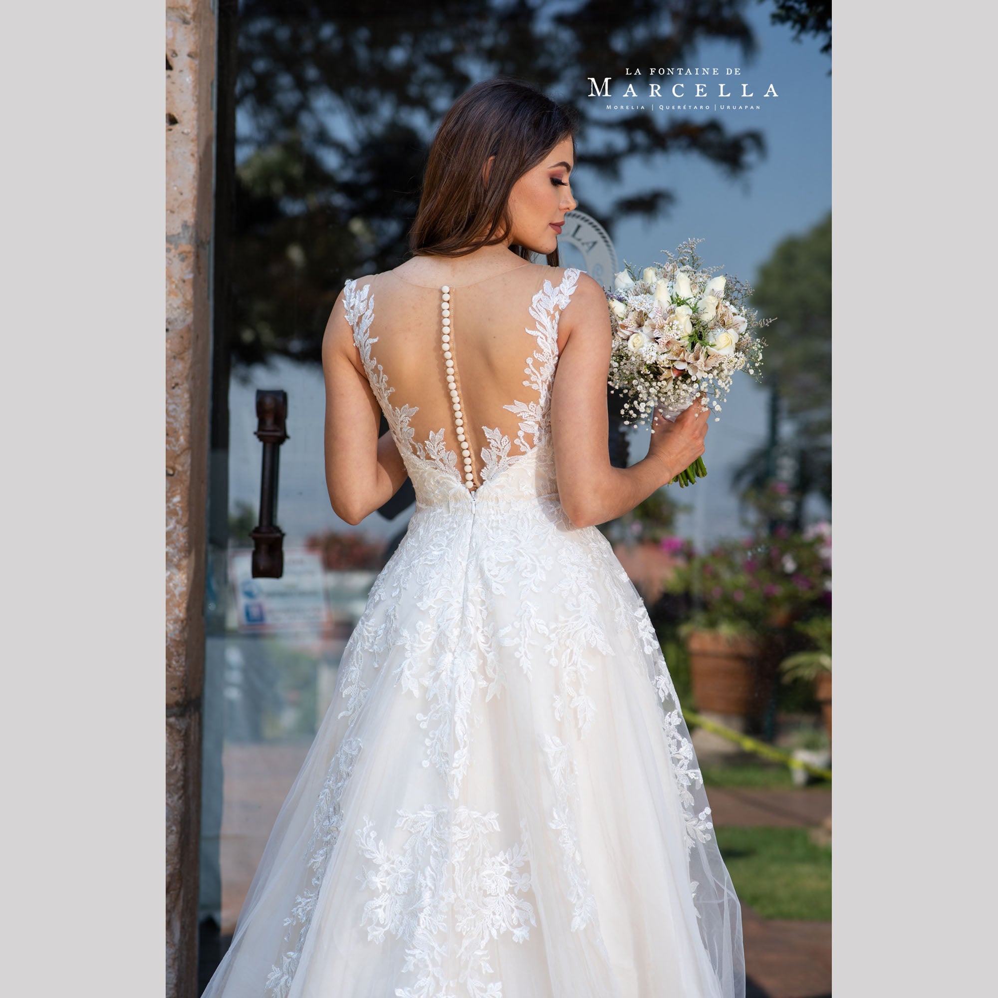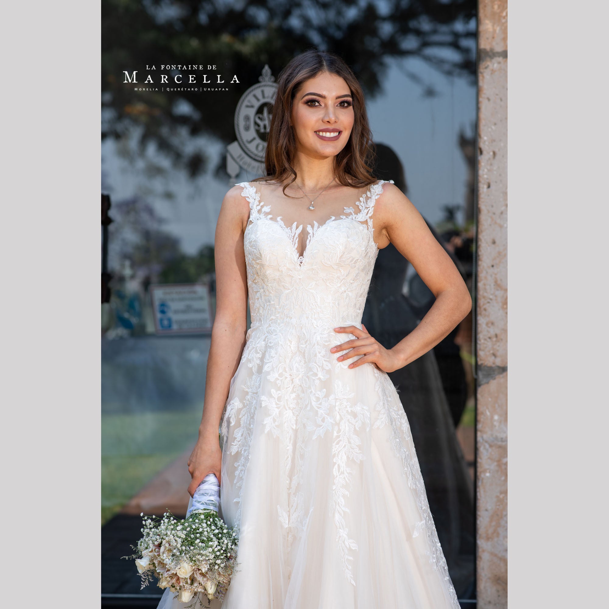 Vestido de Novia corte Imperio, cuenta con cuello y espalda con transparencia, adornado con aplicación. Recomendado para cuerpos tipo Triangulo Invertido y Reloj de Arena.Leer más