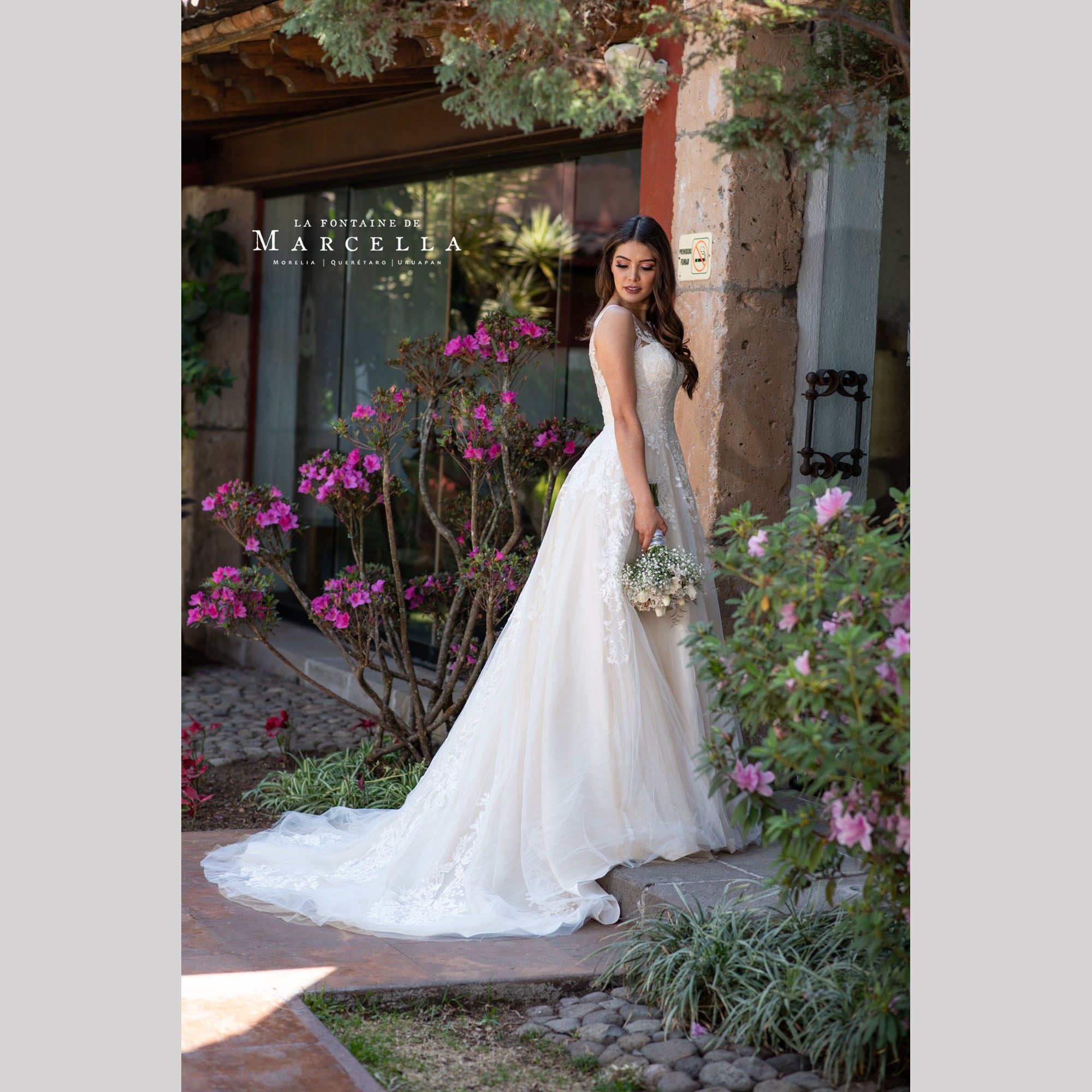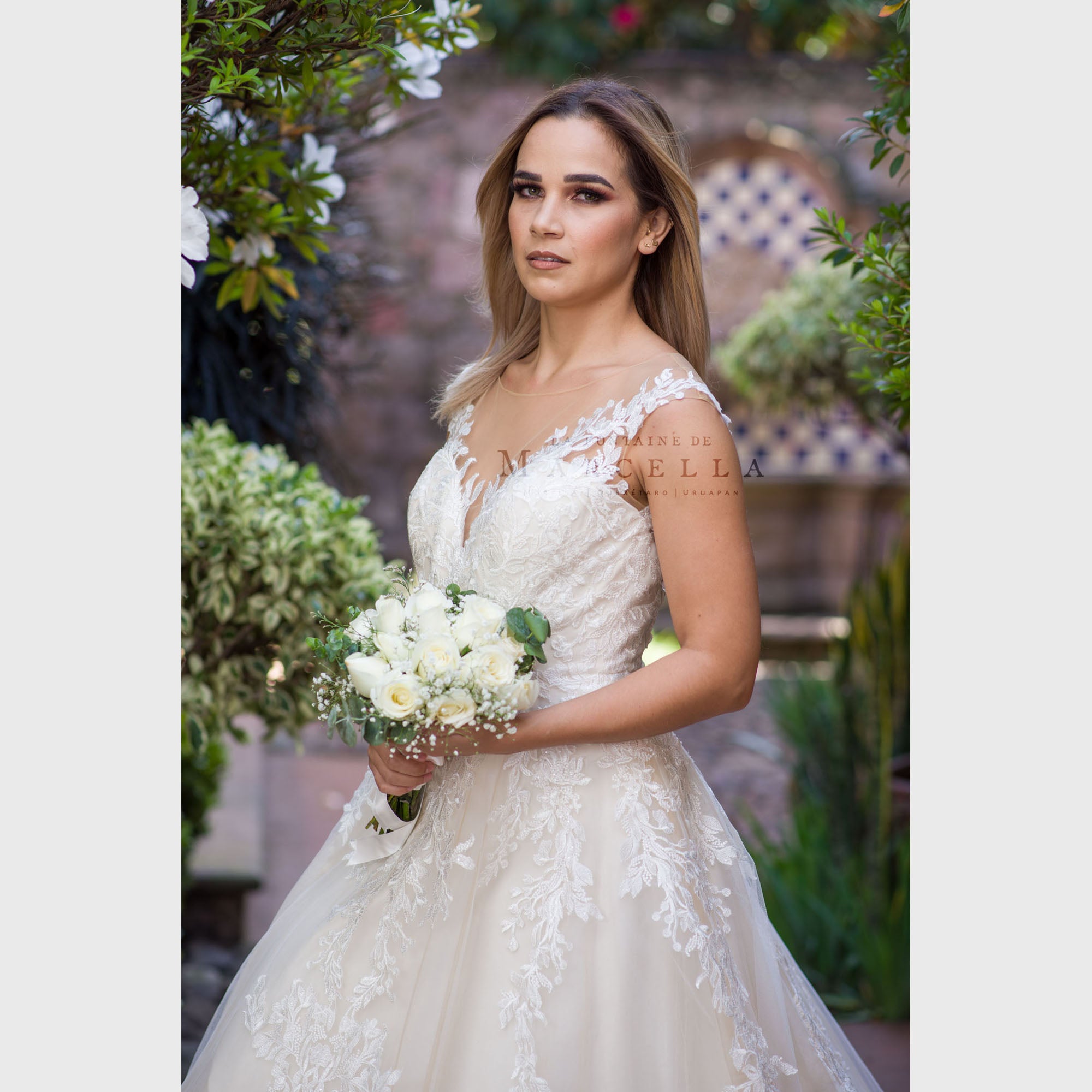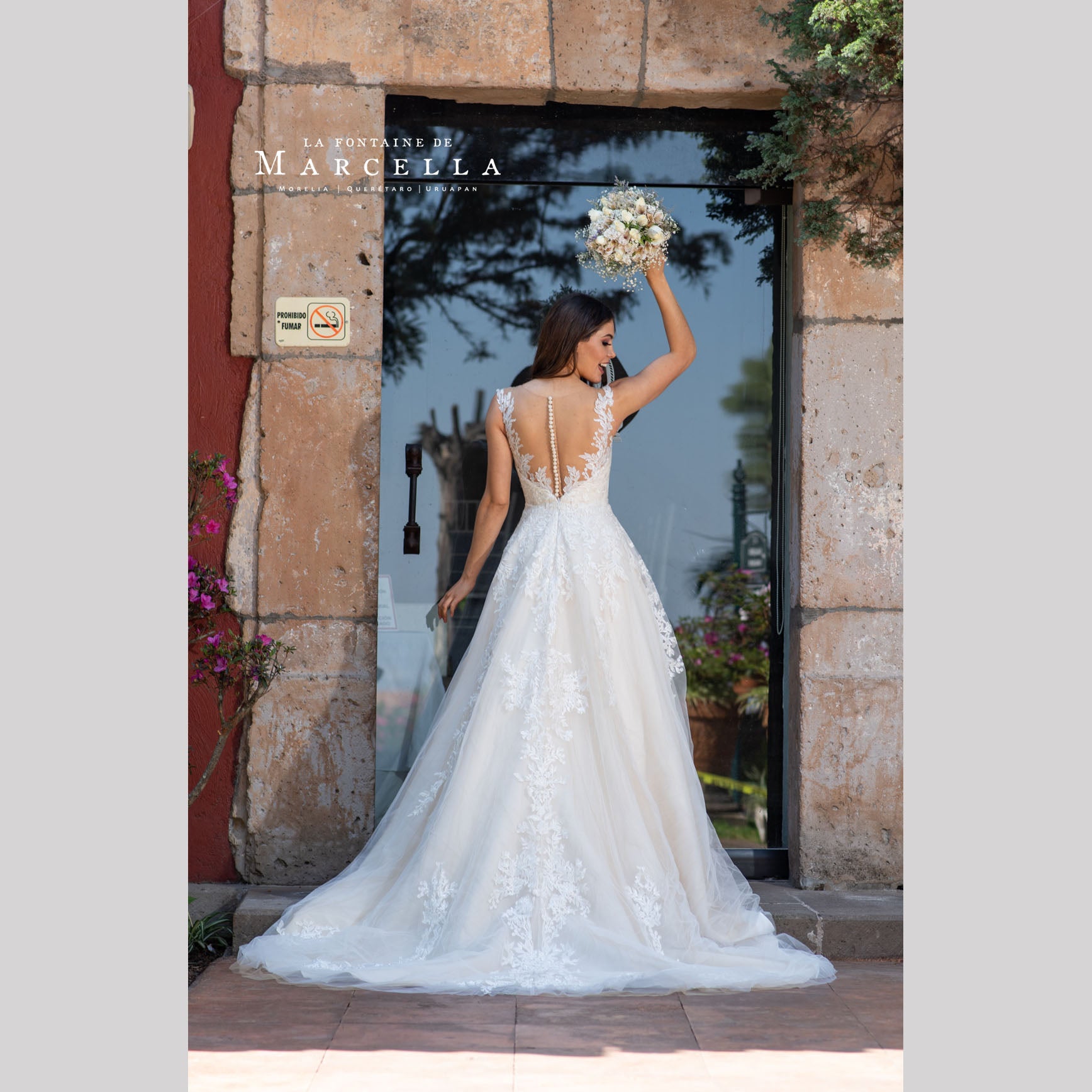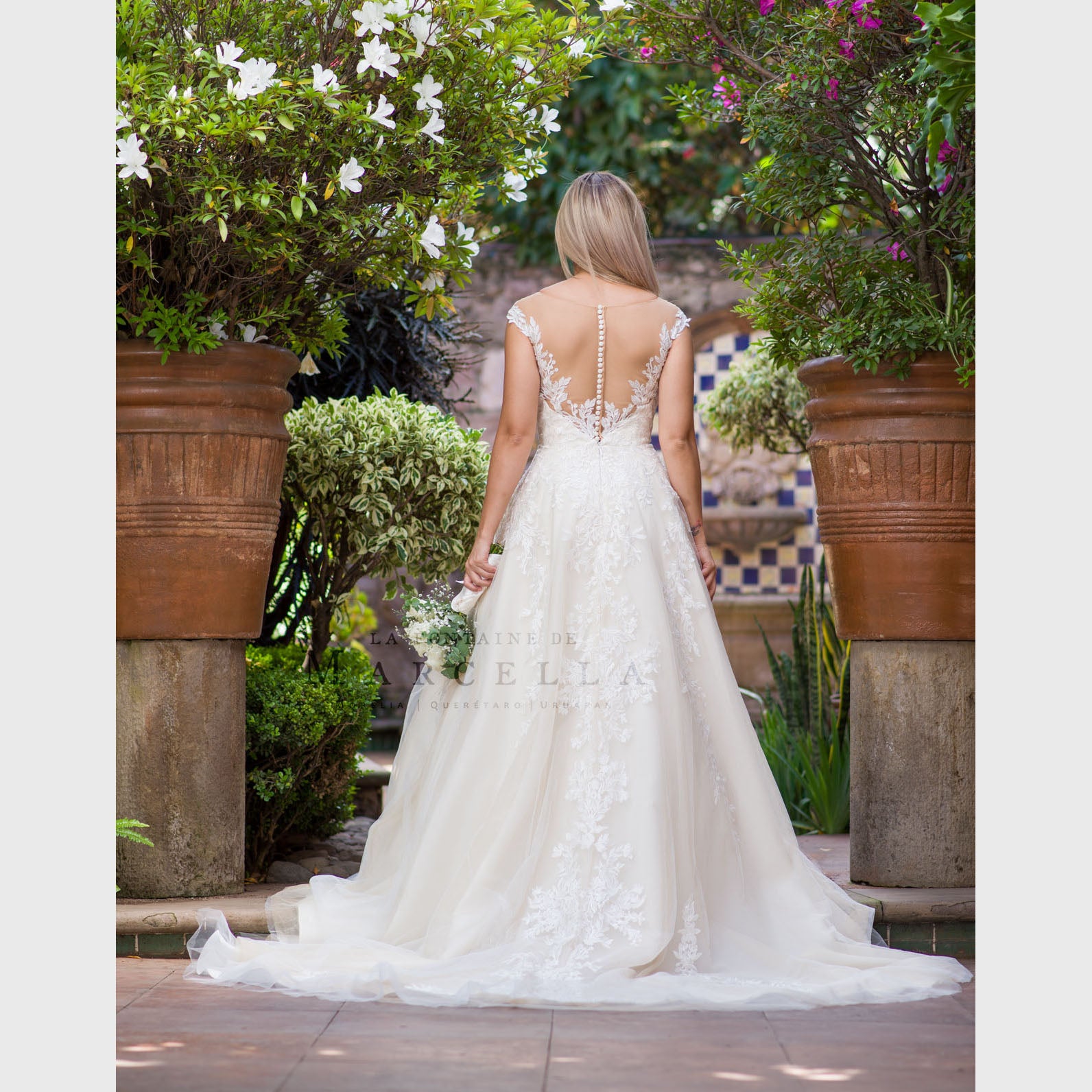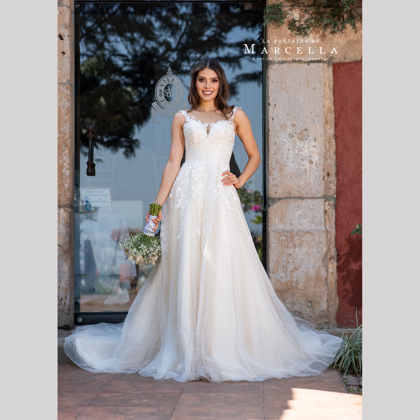 Vestido de Novia corte Imperio, cuenta con cuello y espalda con transparencia, adornado con aplicación. Recomendado para cuerpos tipo Triangulo Invertido y Reloj de Arena.Leer más