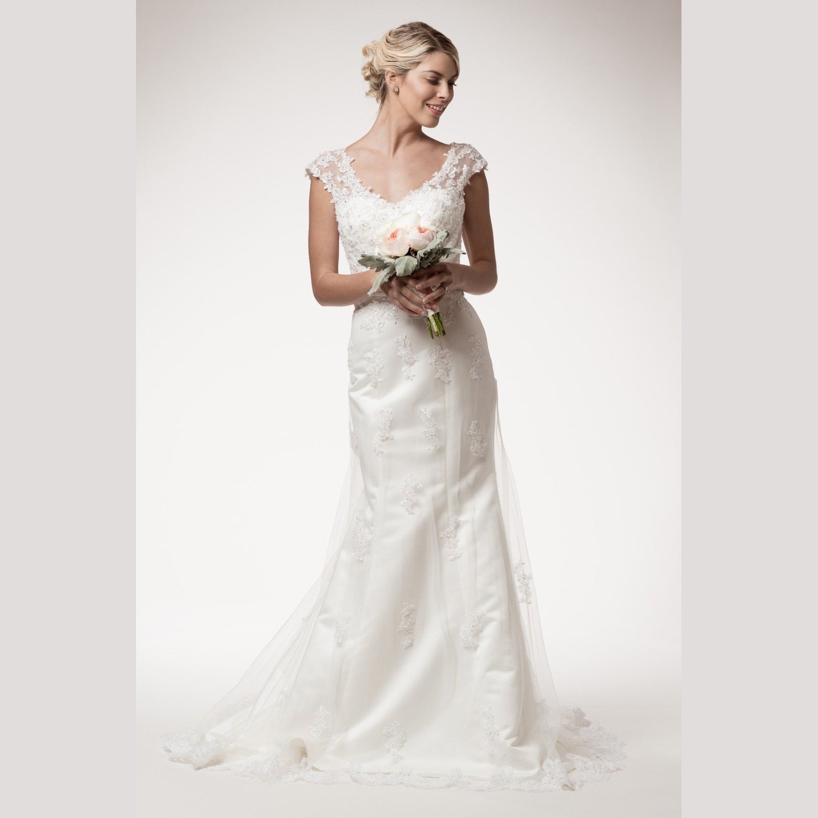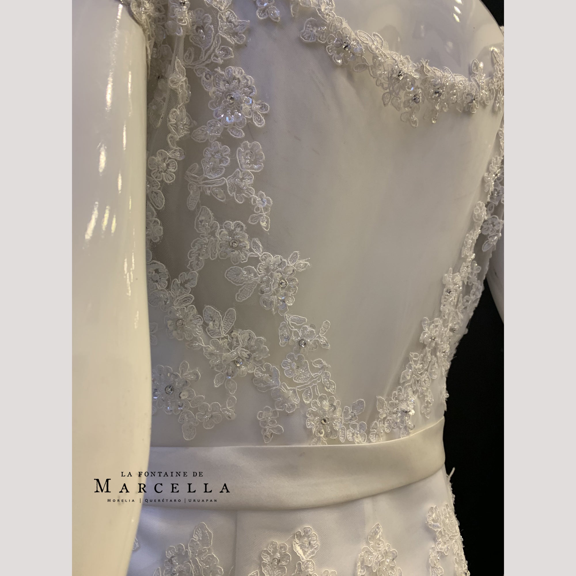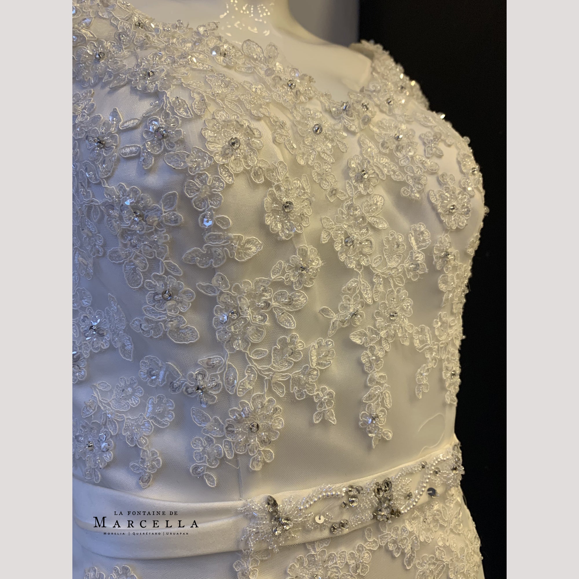 Vestido de novia, escote en V, con aplicaciones en pedrería y cristales, inserción de malla en espalda. Corte recto. Ideal para cuerpo con forma de pera, rectangular o reloj de arena.