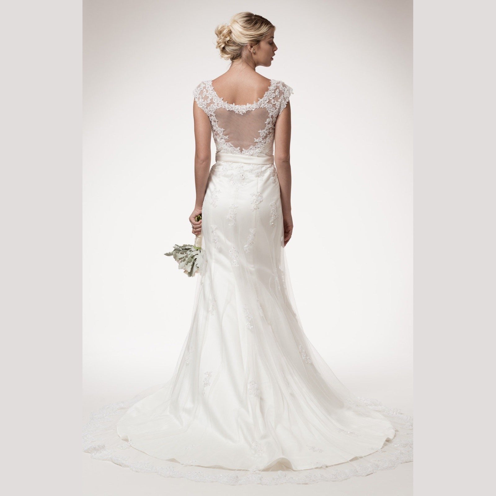 Vestido de novia, escote en V, con aplicaciones en pedrería y cristales, inserción de malla en espalda. Corte recto. Ideal para cuerpo con forma de pera, rectangular o reloj de arena. Leer más