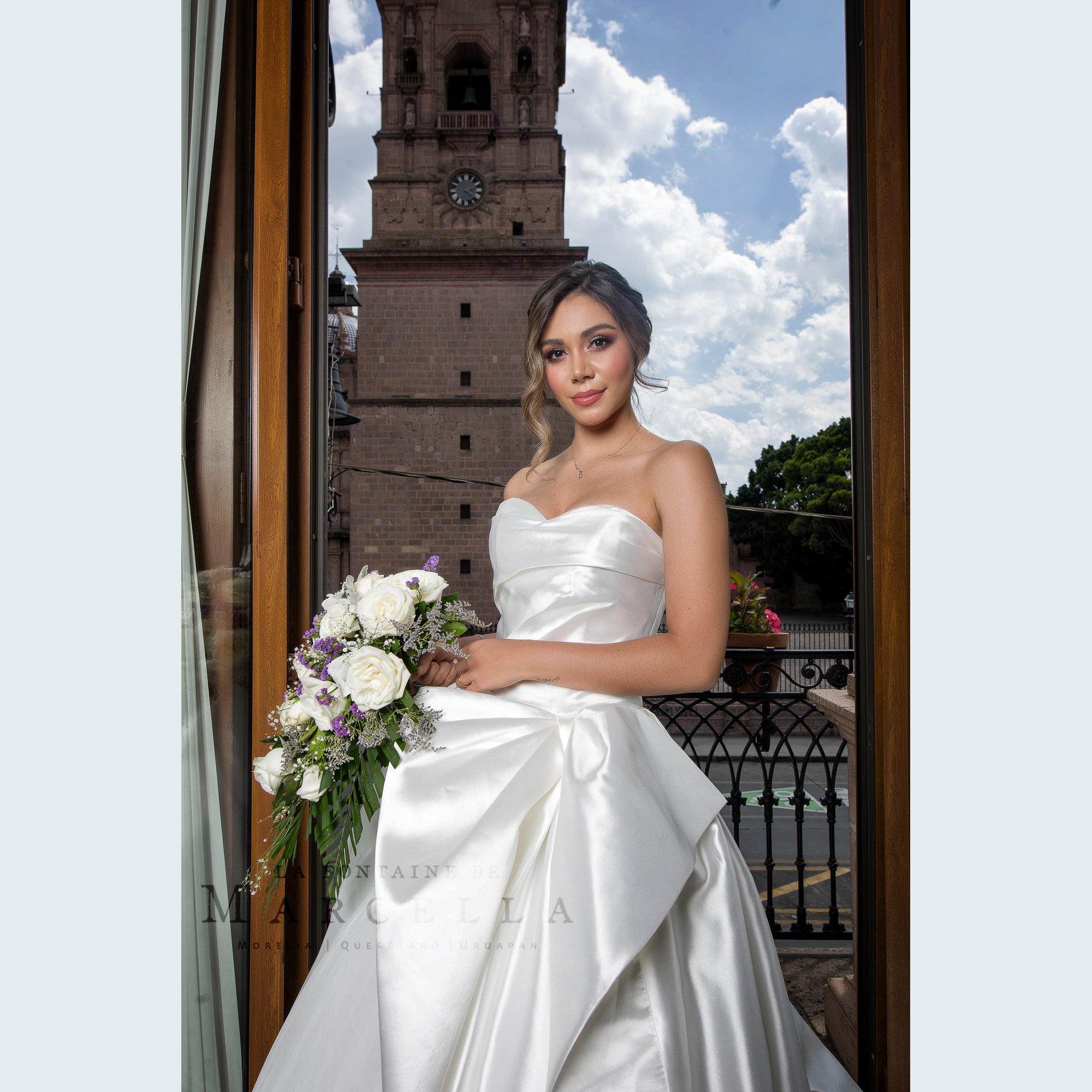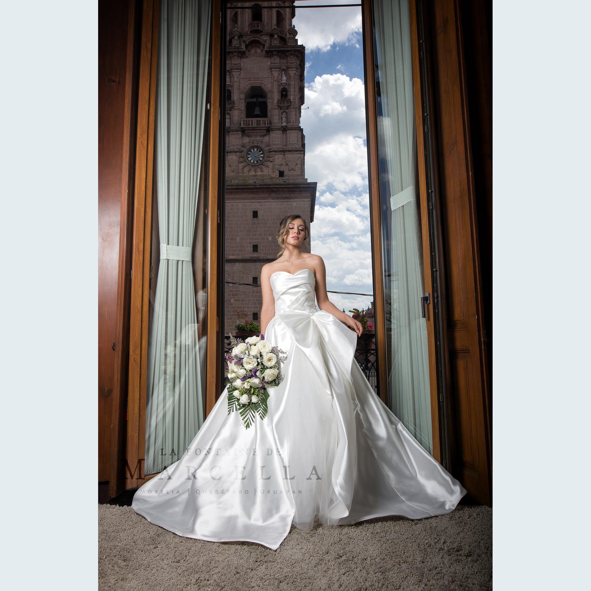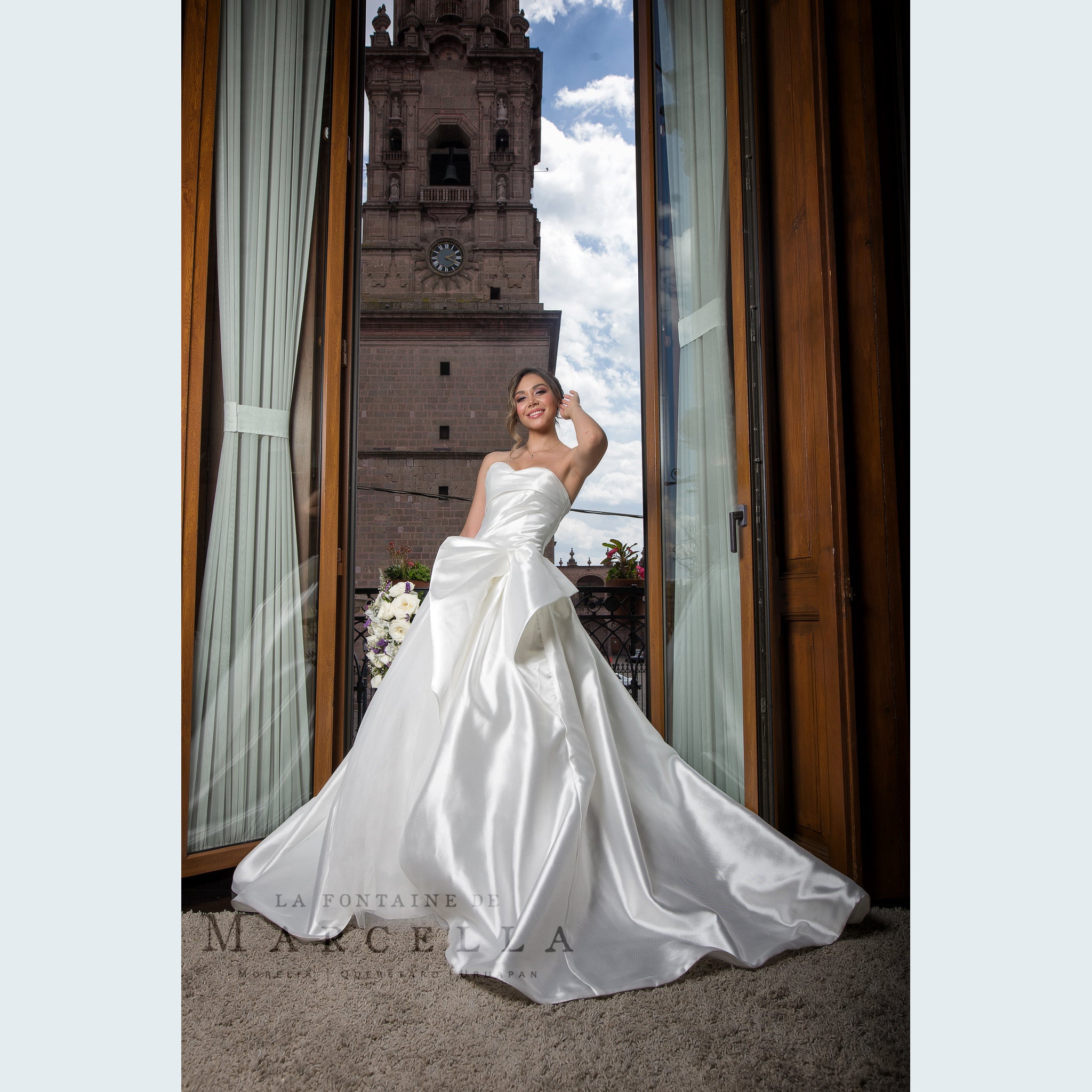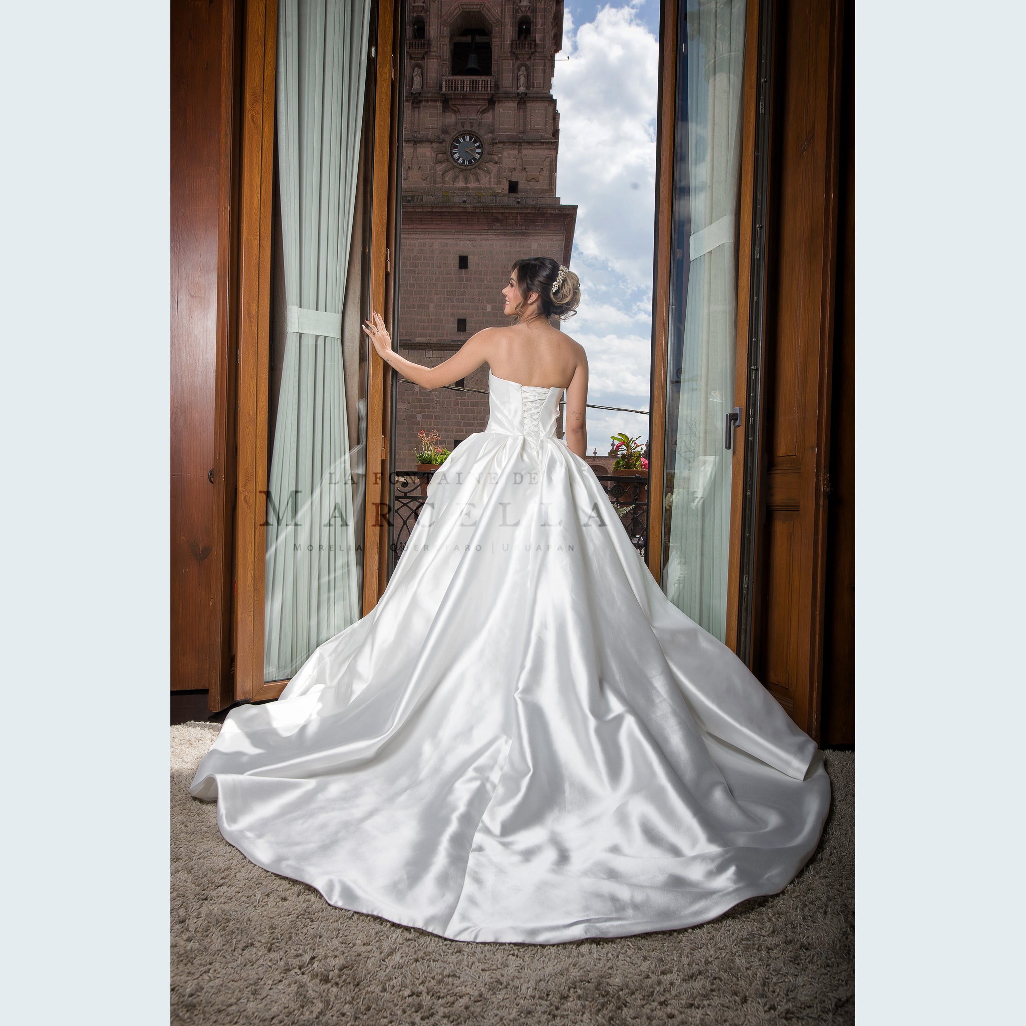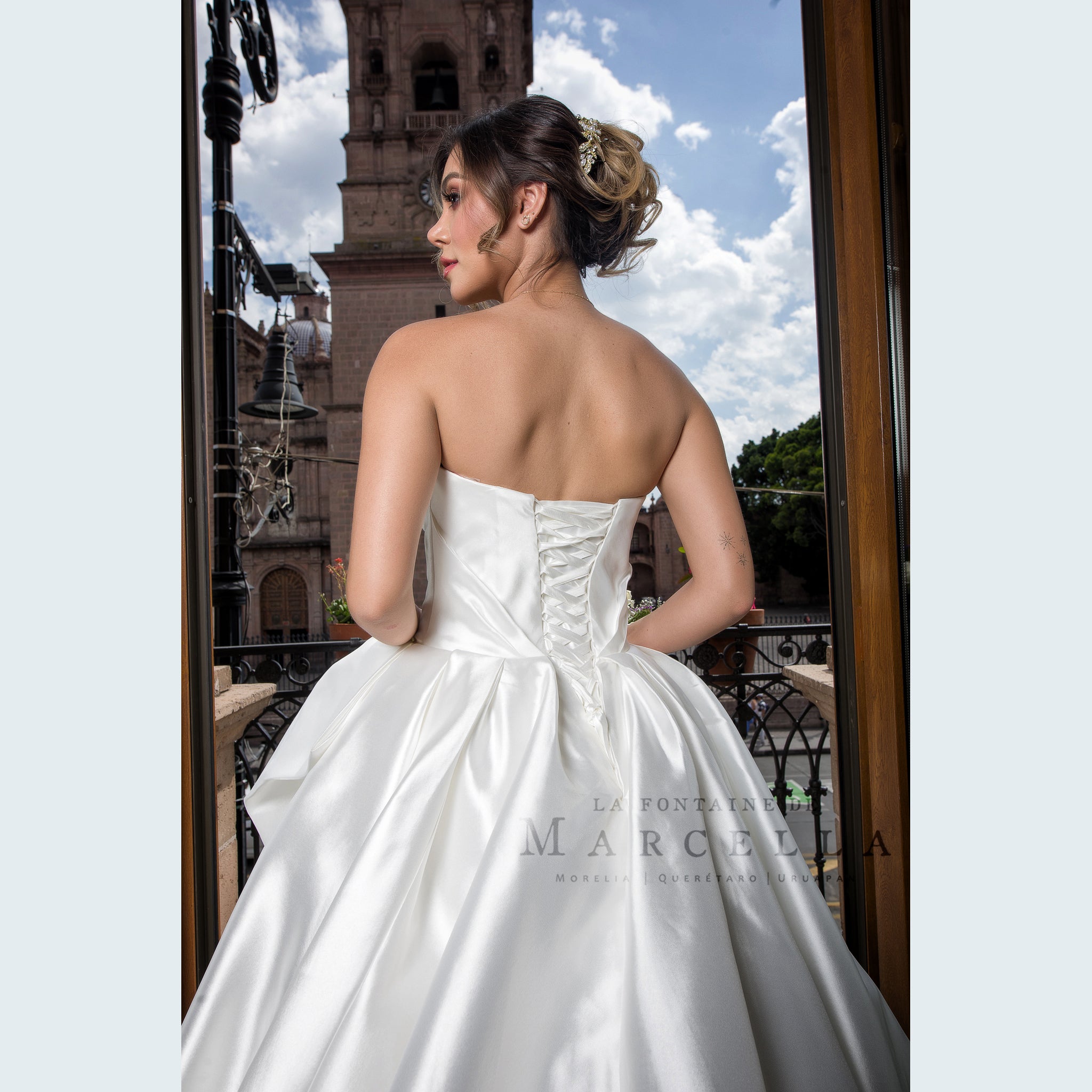 Vestido de Novia corte Princesa de tela semi rígida y brillante, de escote corazón y adorno de pliegue en la parte inferior, es recomendado para cuerpos tipo Triangulo Invertido y Rectángulo.Leer más