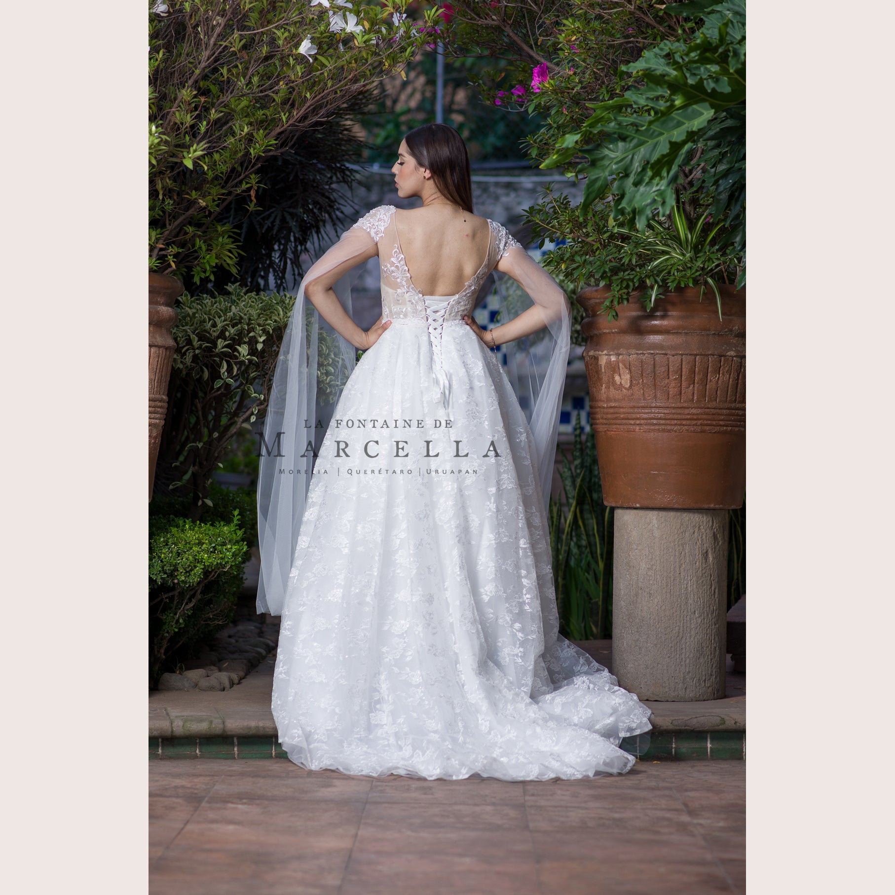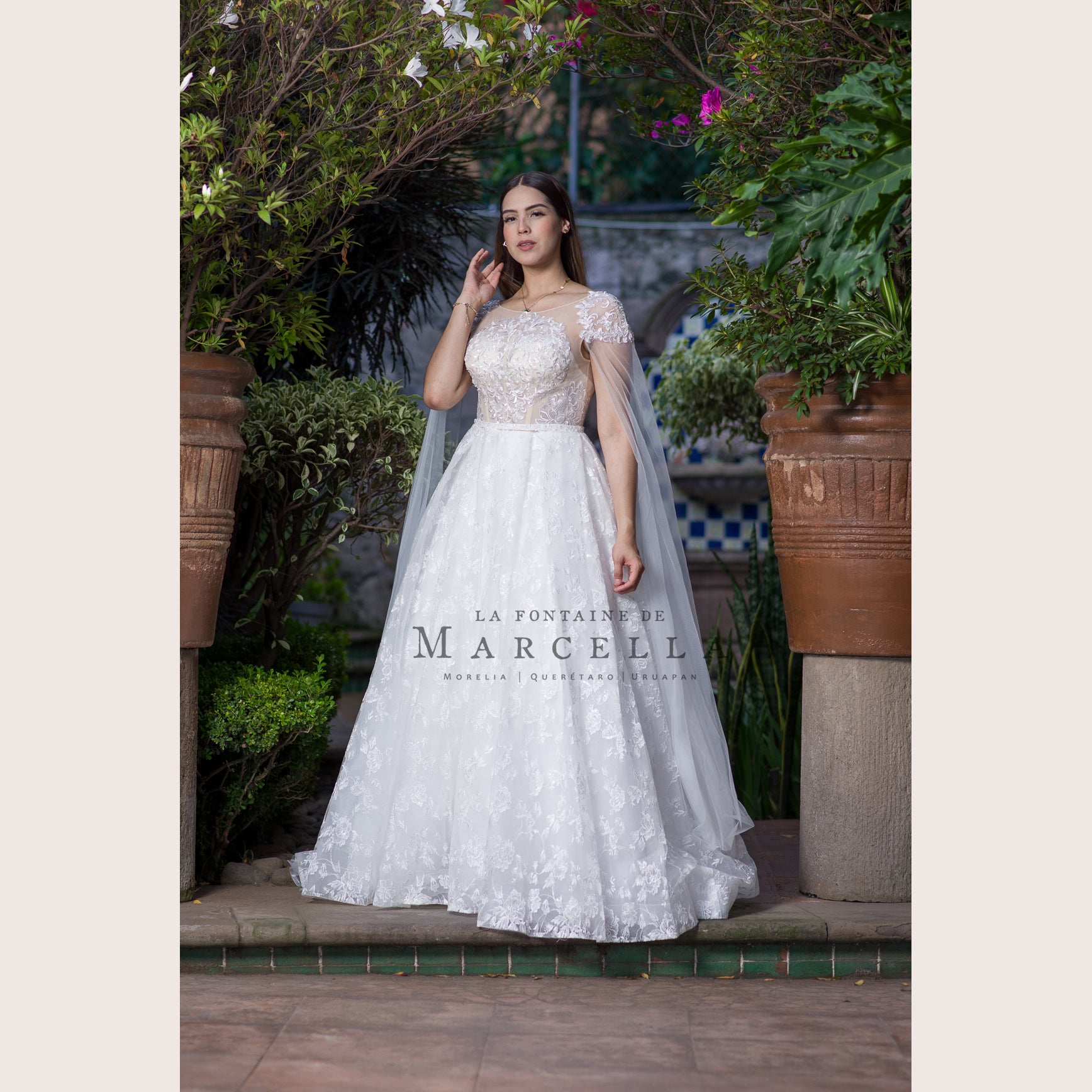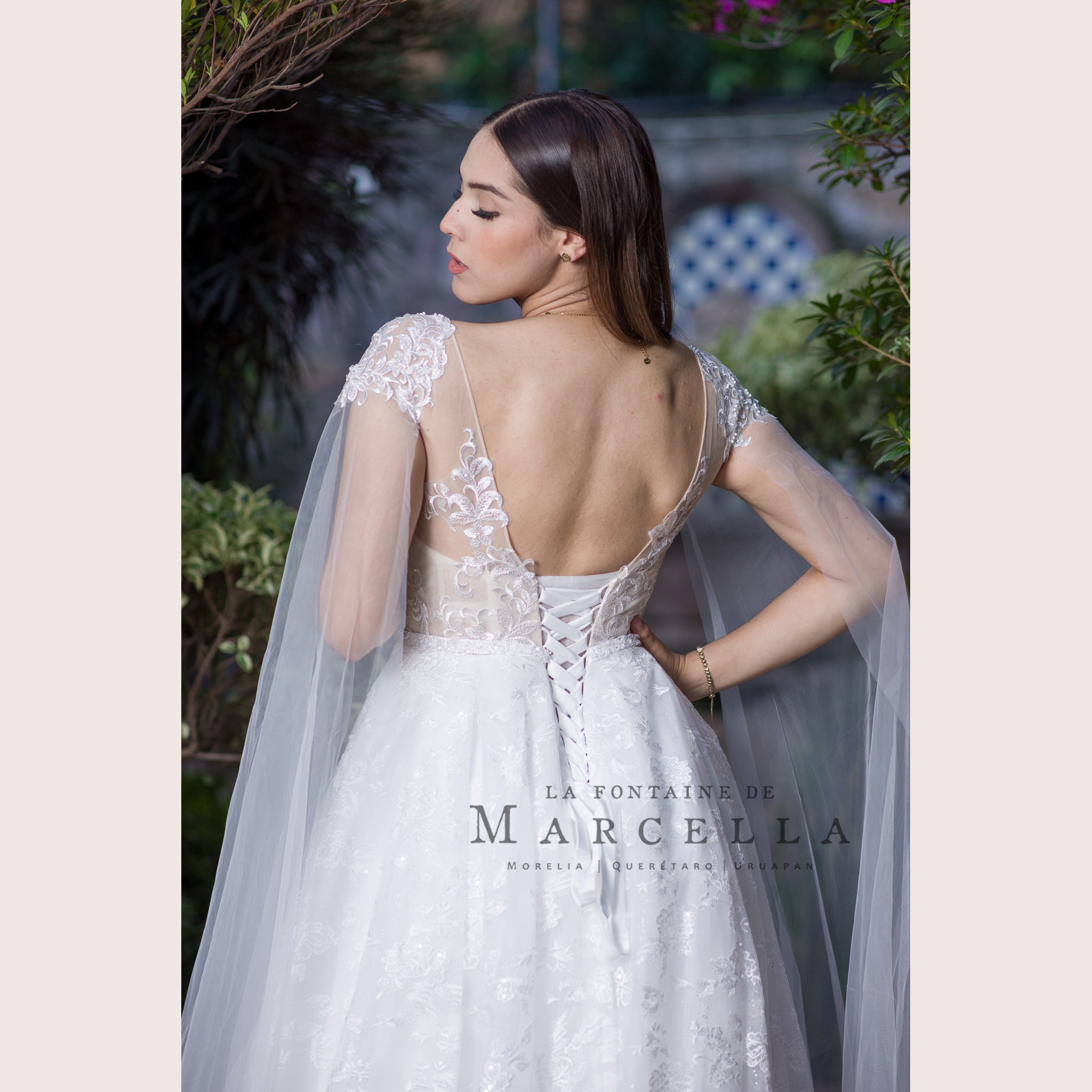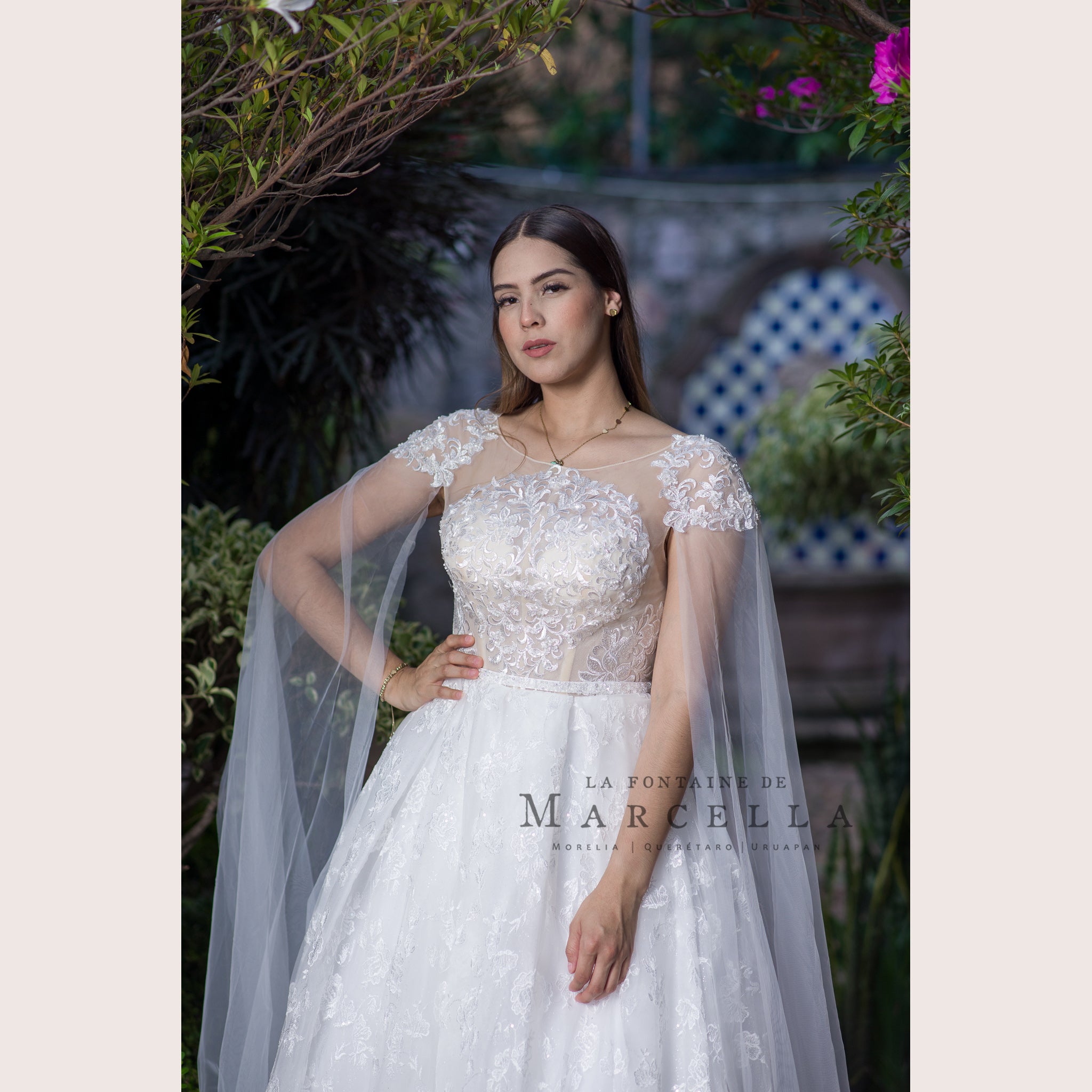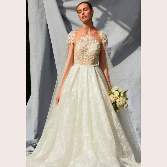 Vestido de novia corte princesa con transparencia, aplicación y adorno de tul a los hombros, es recomendado para cuerpos tipo Rectángulo y Pera.Leer más