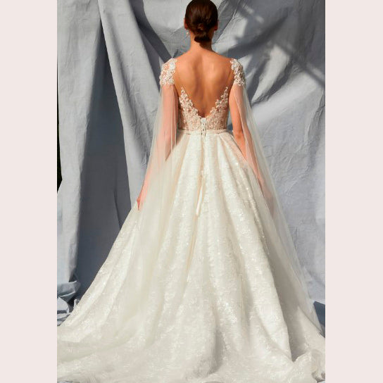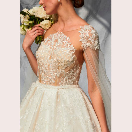 Vestido de novia corte princesa con transparencia, aplicación y adorno de tul a los hombros, es recomendado para cuerpos tipo Rectángulo y Pera.