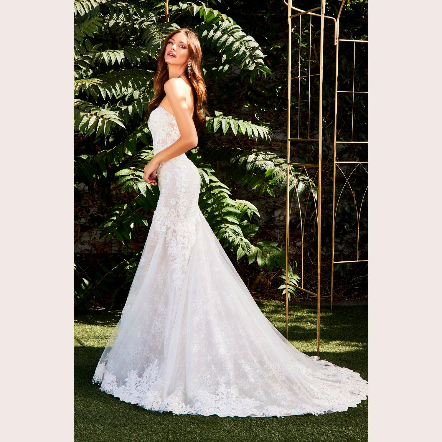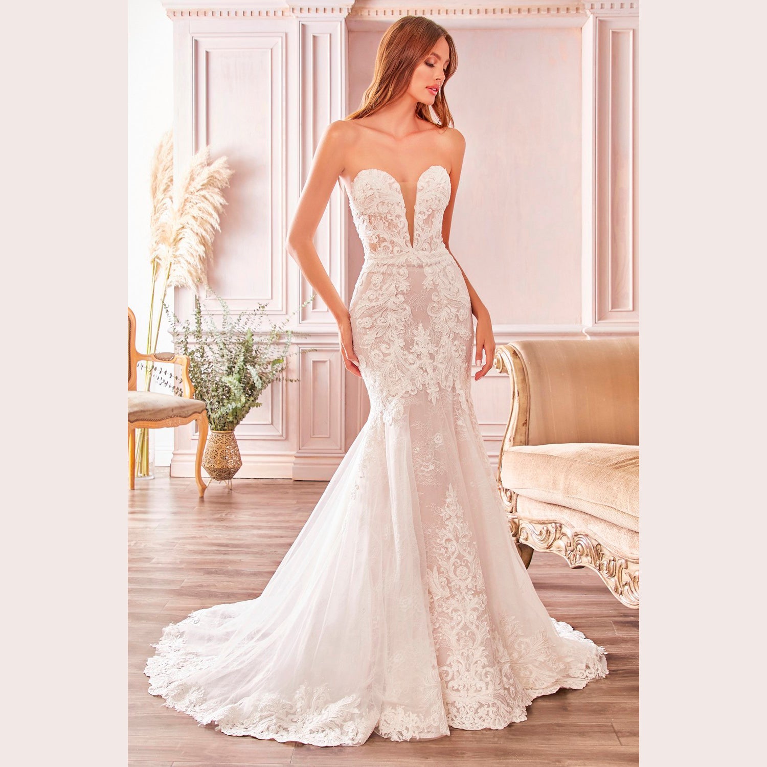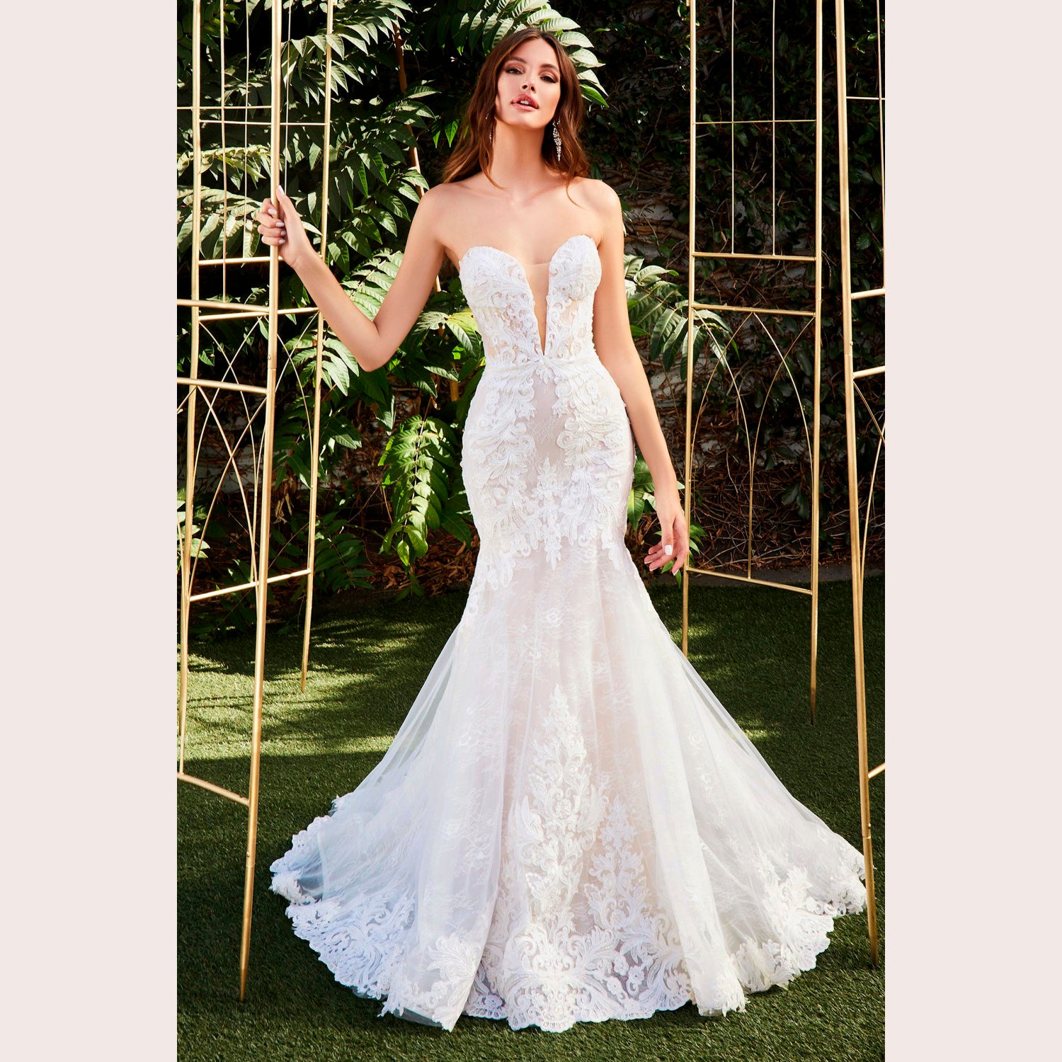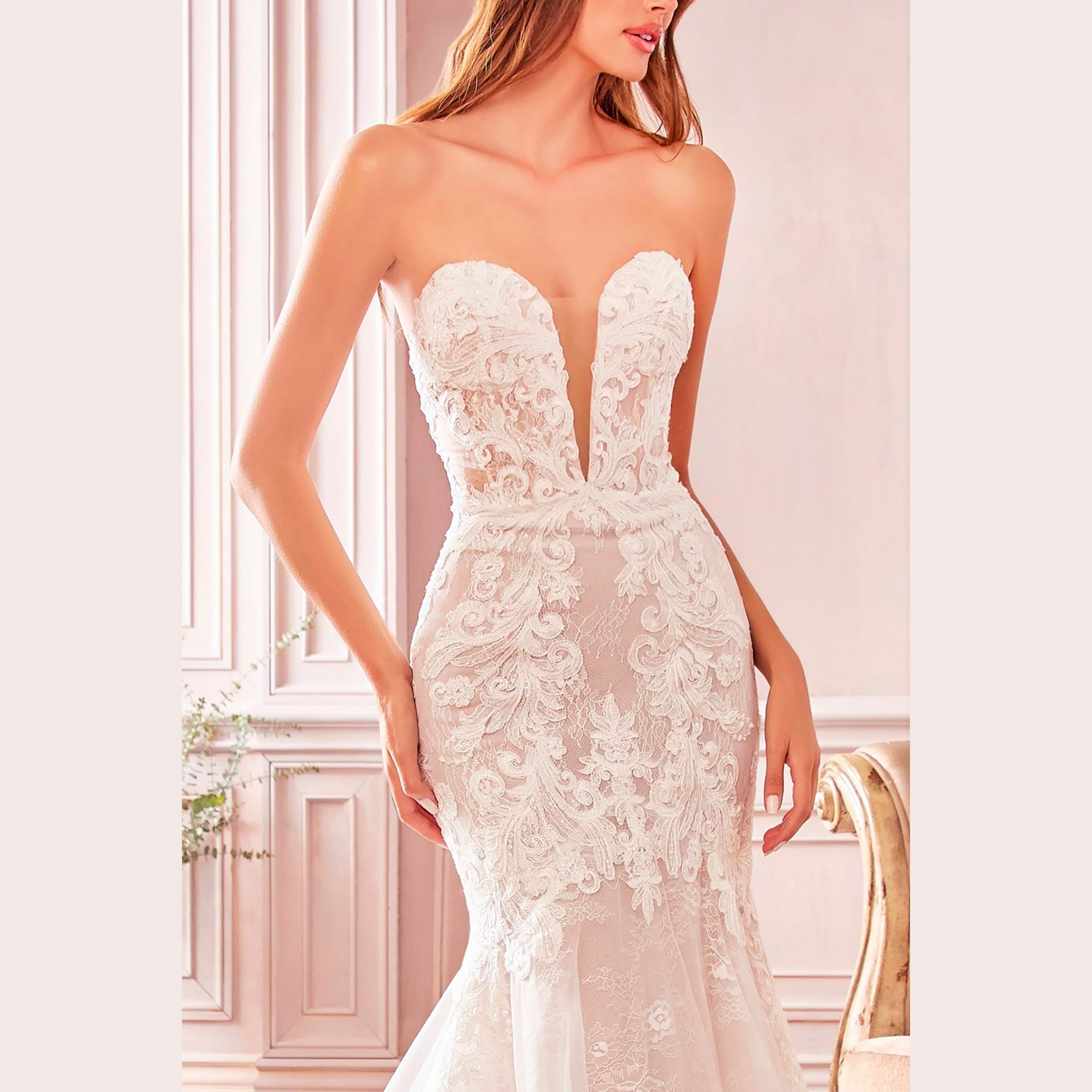 Vestido largo de corte sirena con escote corazón, adornado hermosamente con aplicación, de cauda larga es recomendado para cuerpos tipo Reloj de Arena y Pera.