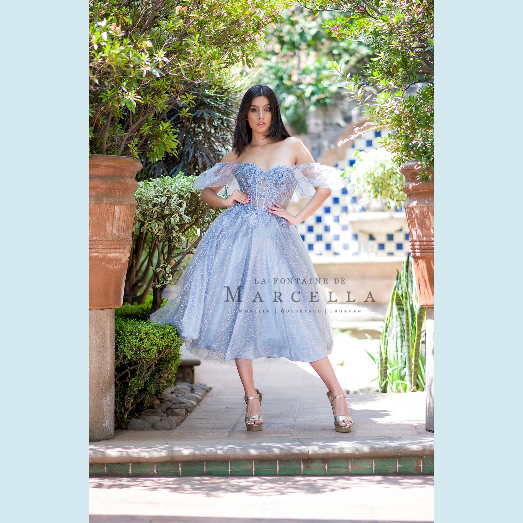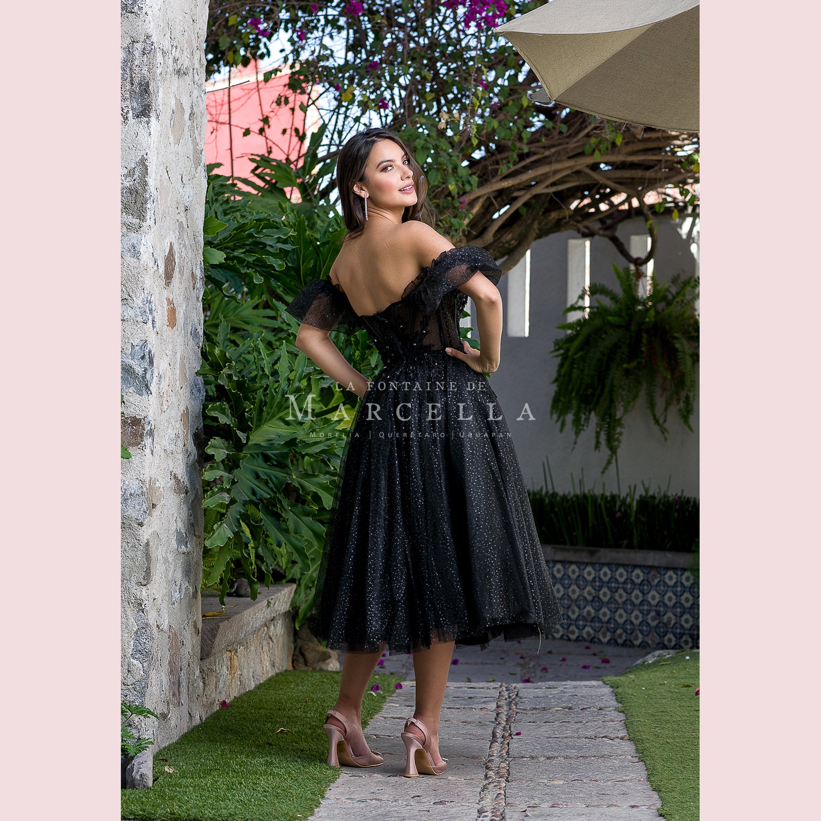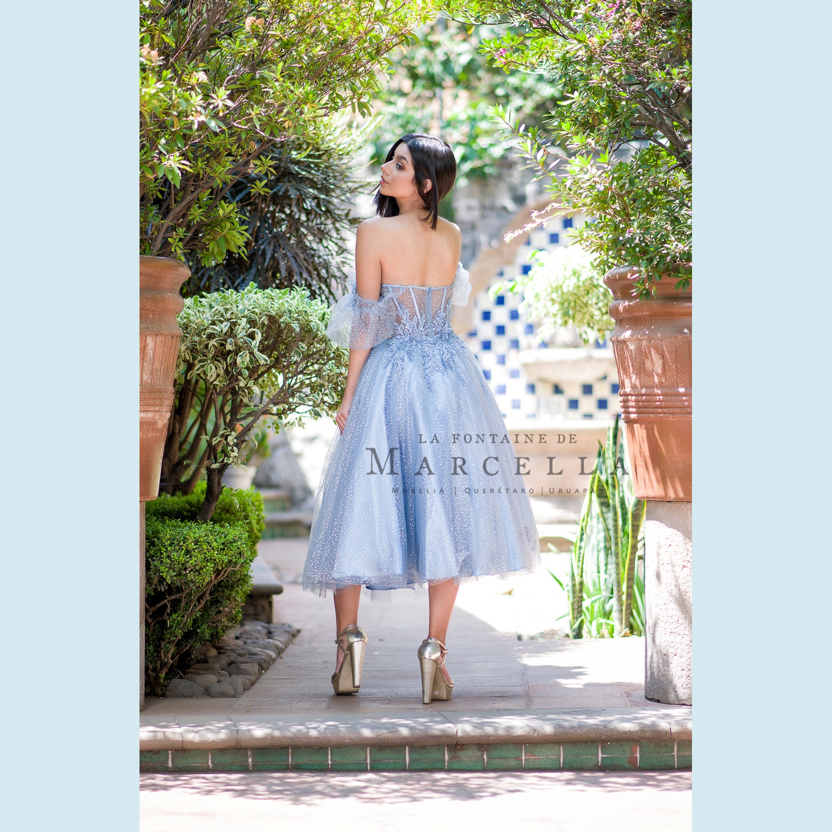 Vestido Midi de corte Princesa, con hermoso tul brillante y manga abullonada es recomendado para cuerpos tipo Pera y Triangulo Invertido.