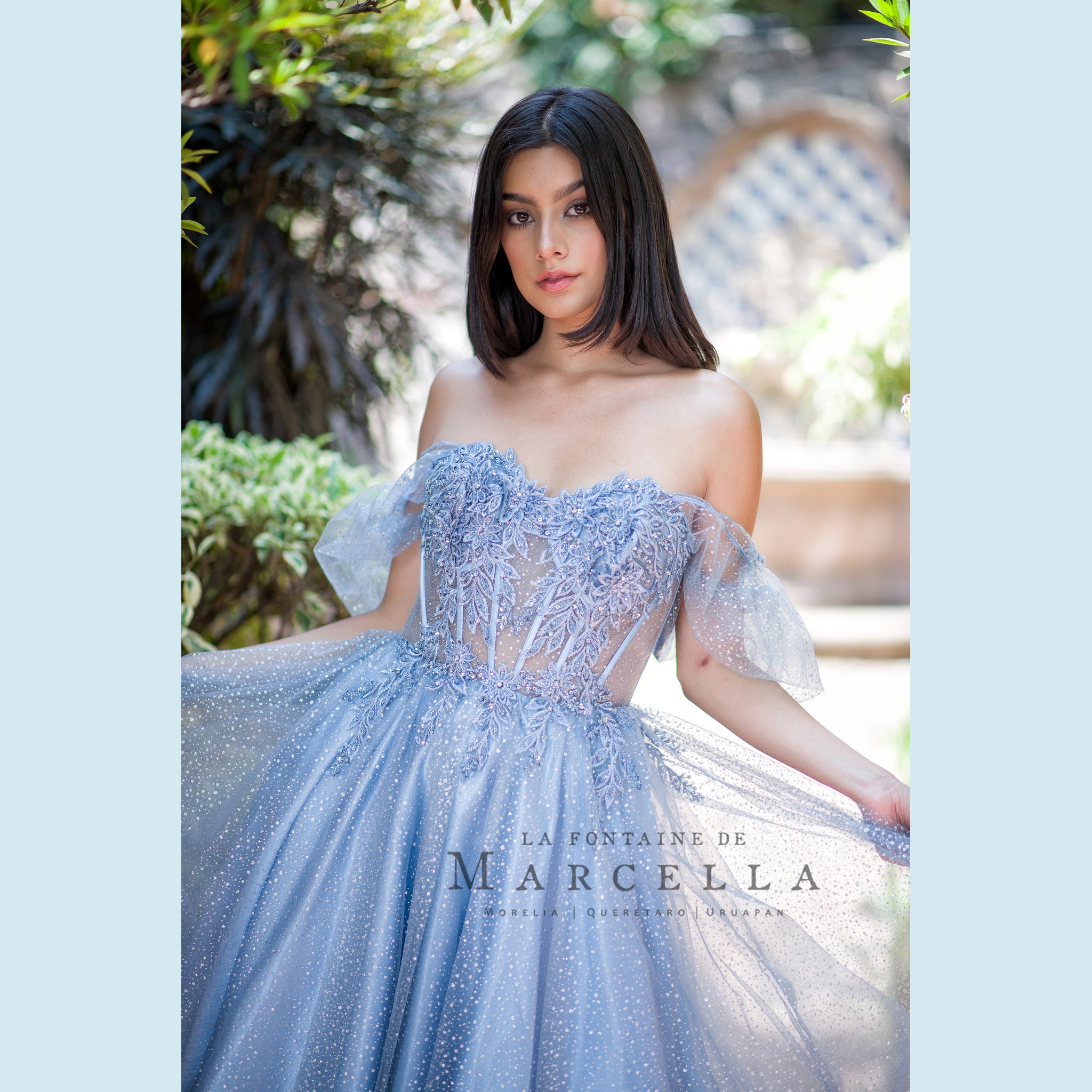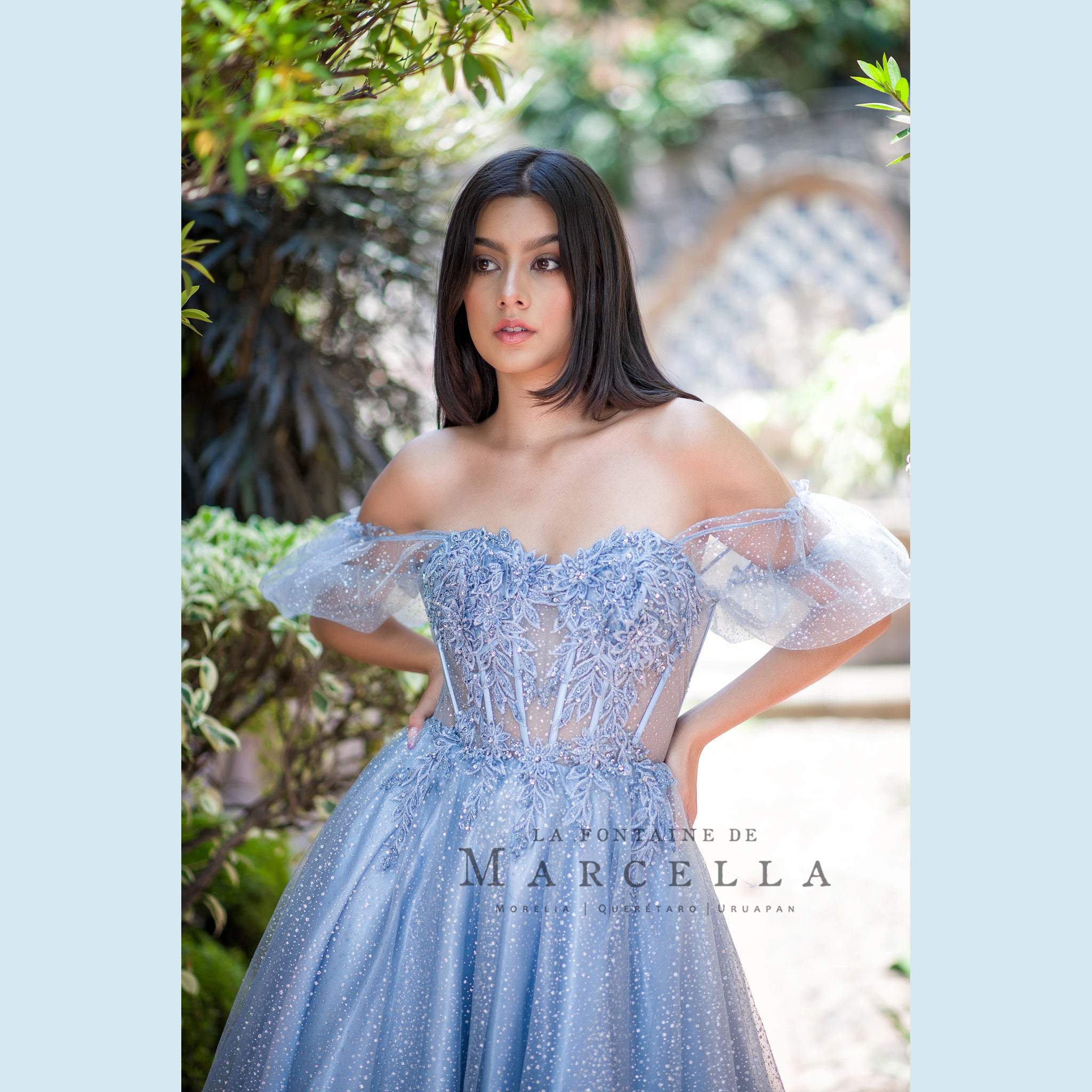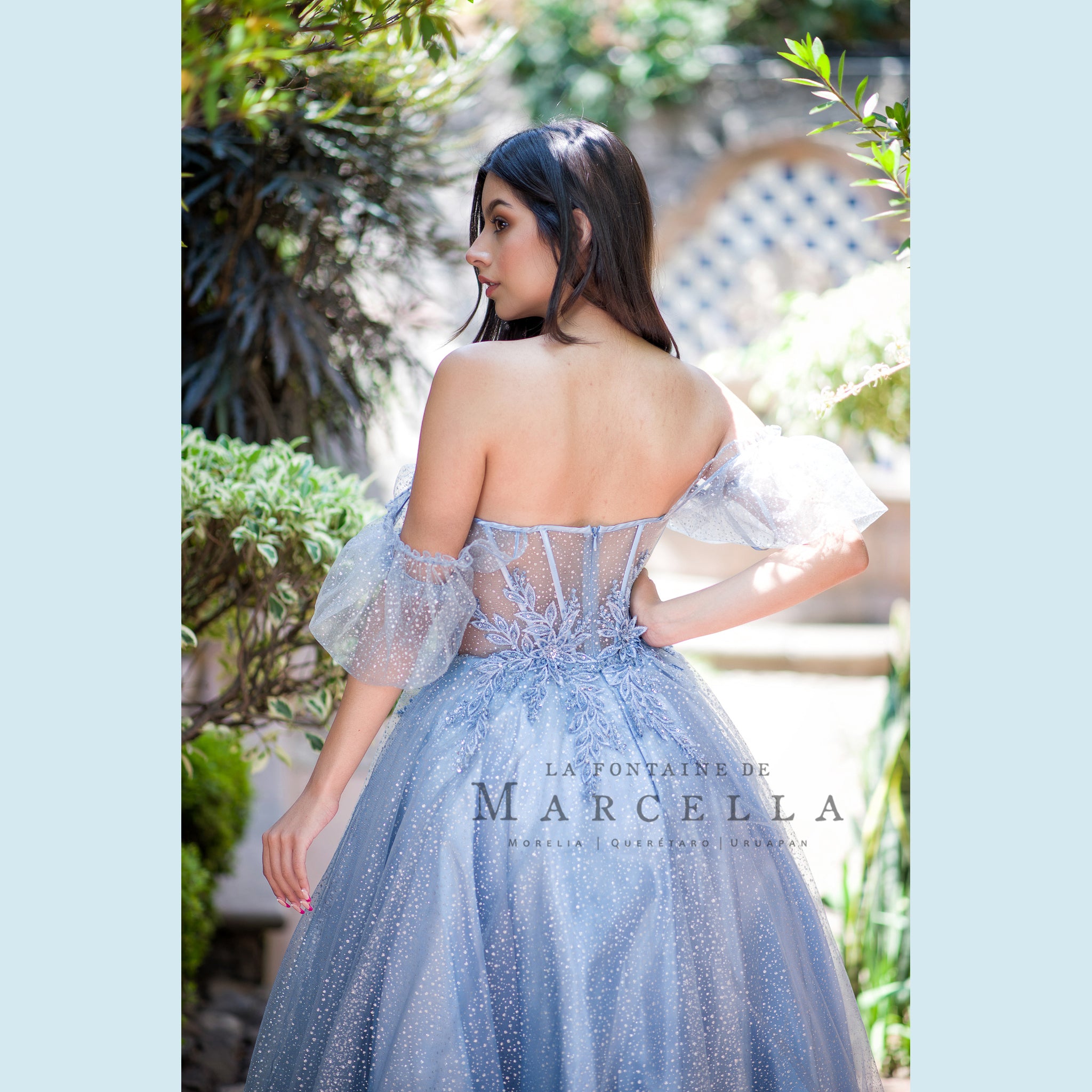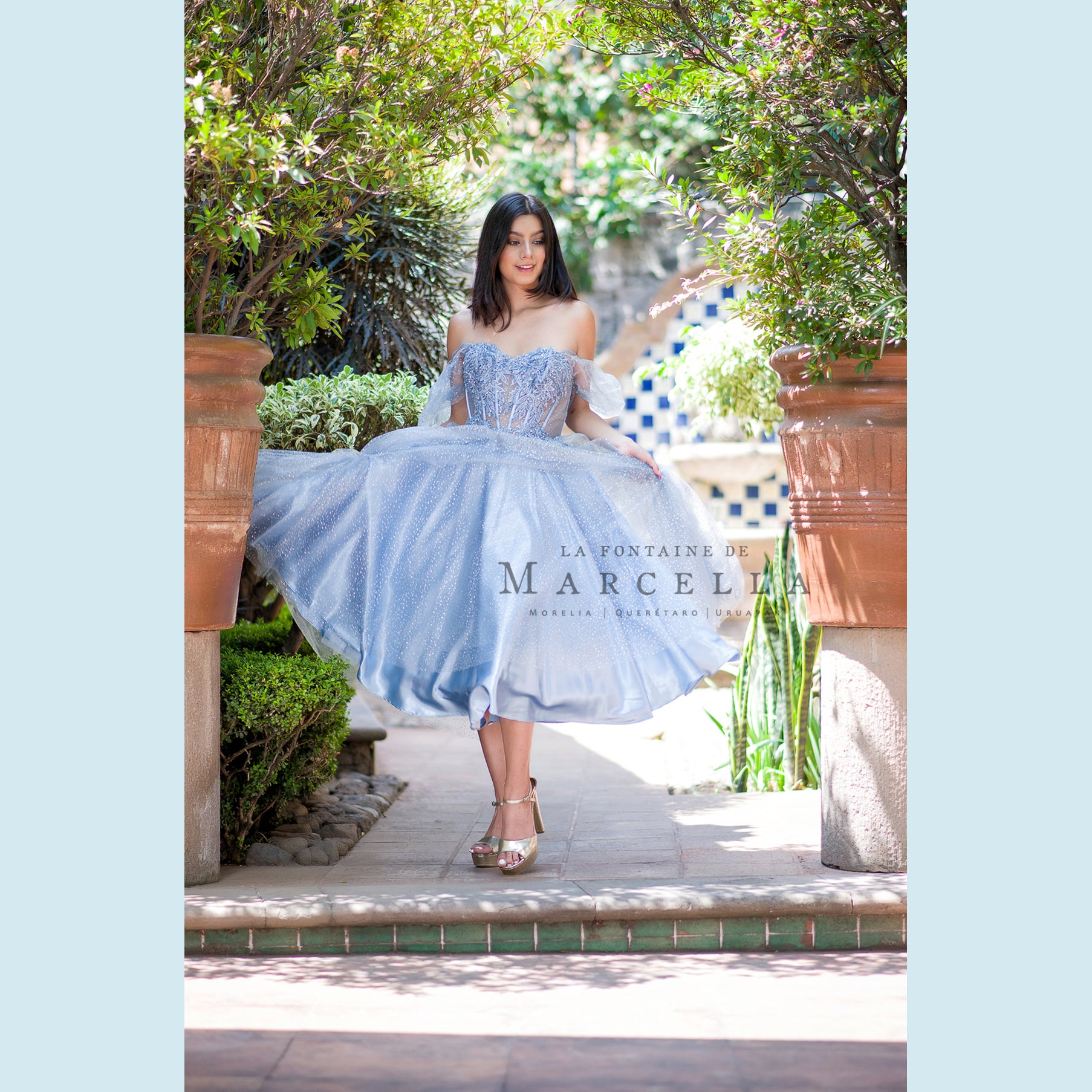 Vestido Midi de corte Princesa, con hermoso tul brillante y manga abullonada es recomendado para cuerpos tipo Pera y Triangulo Invertido.