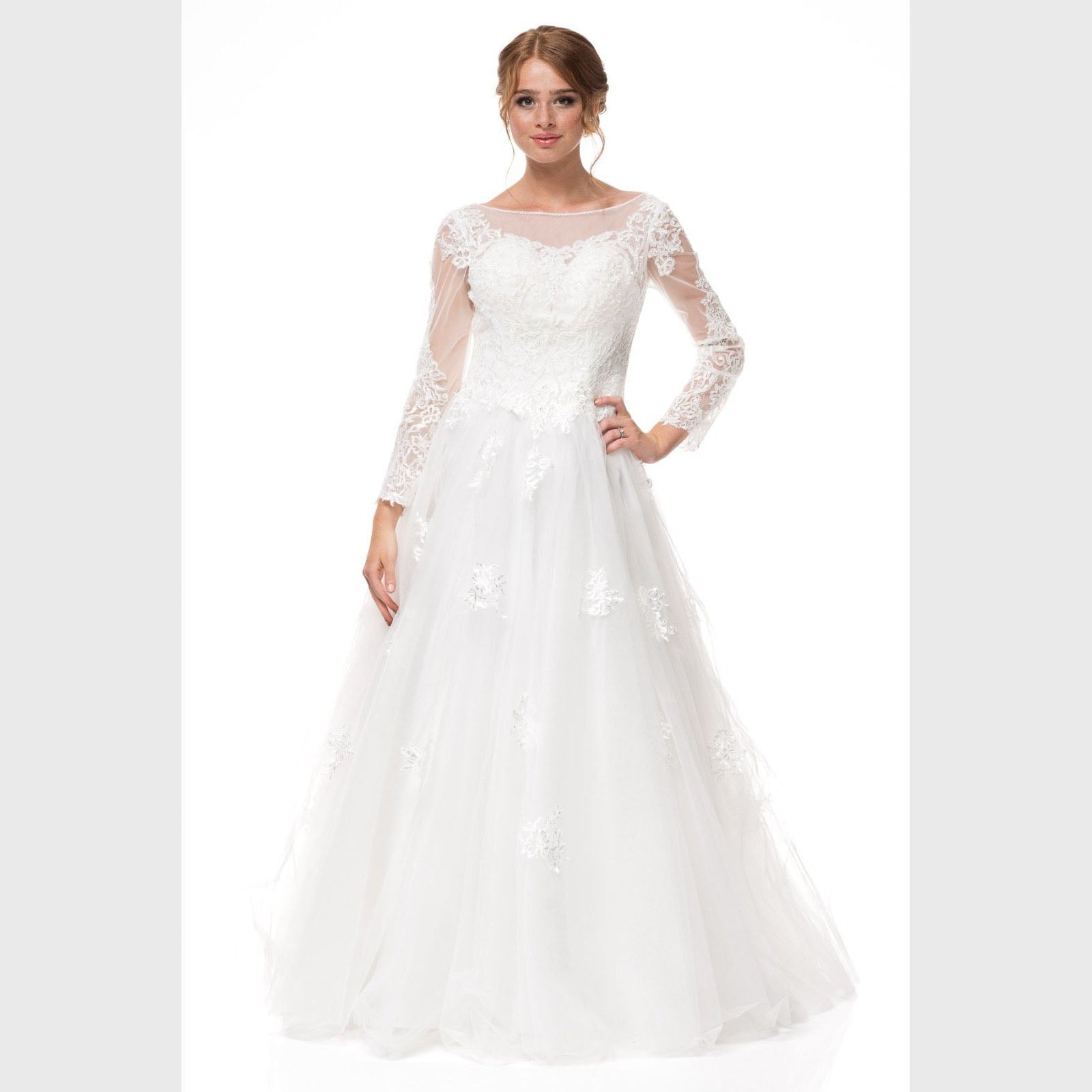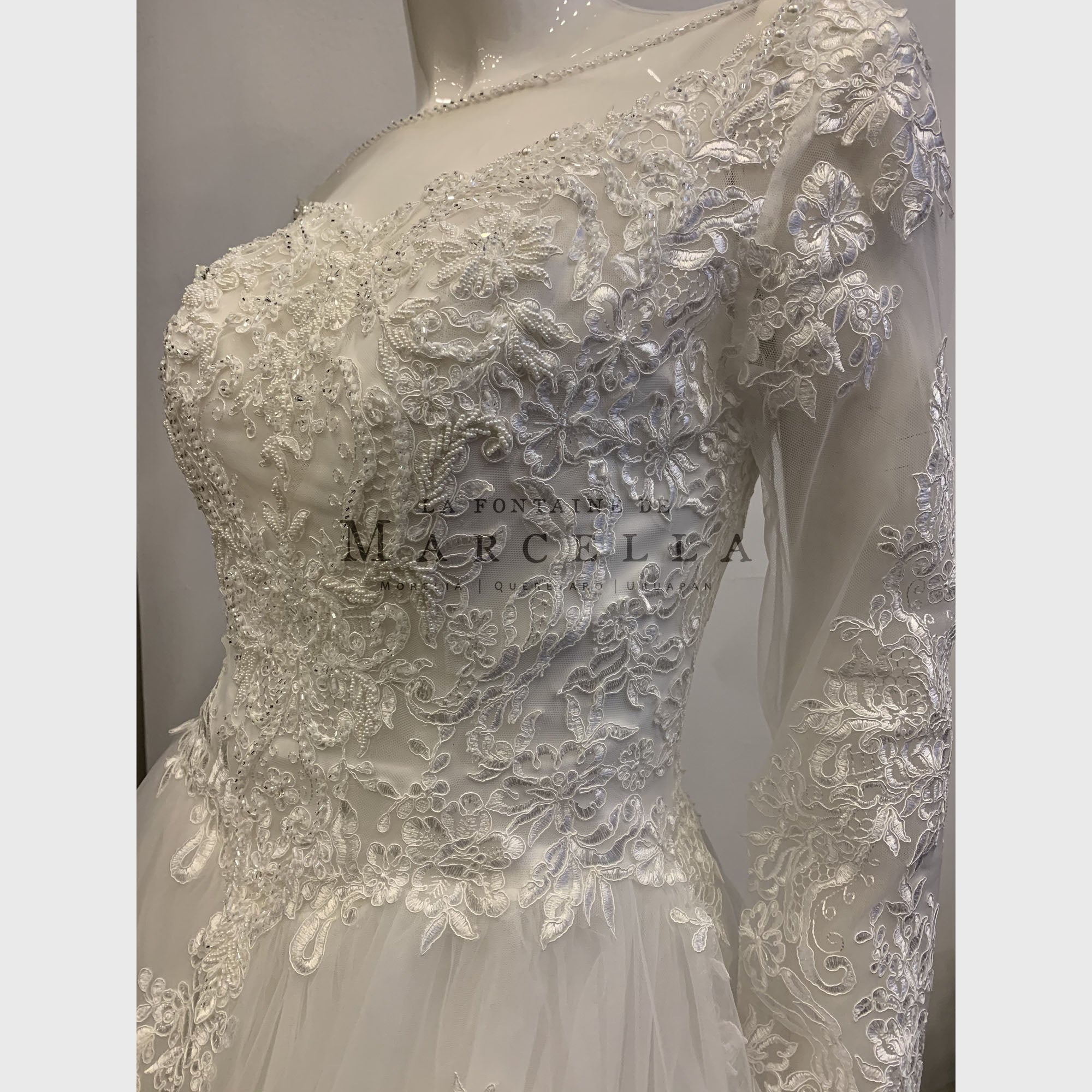 Vestido de Novia manga larga, con aplicaciones en encaje e inserción tipo malla en escote y mangas. Corte tipo A. Ideal para todo tipo de cuerpo.