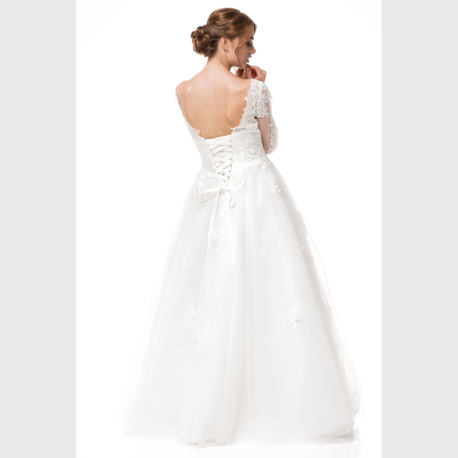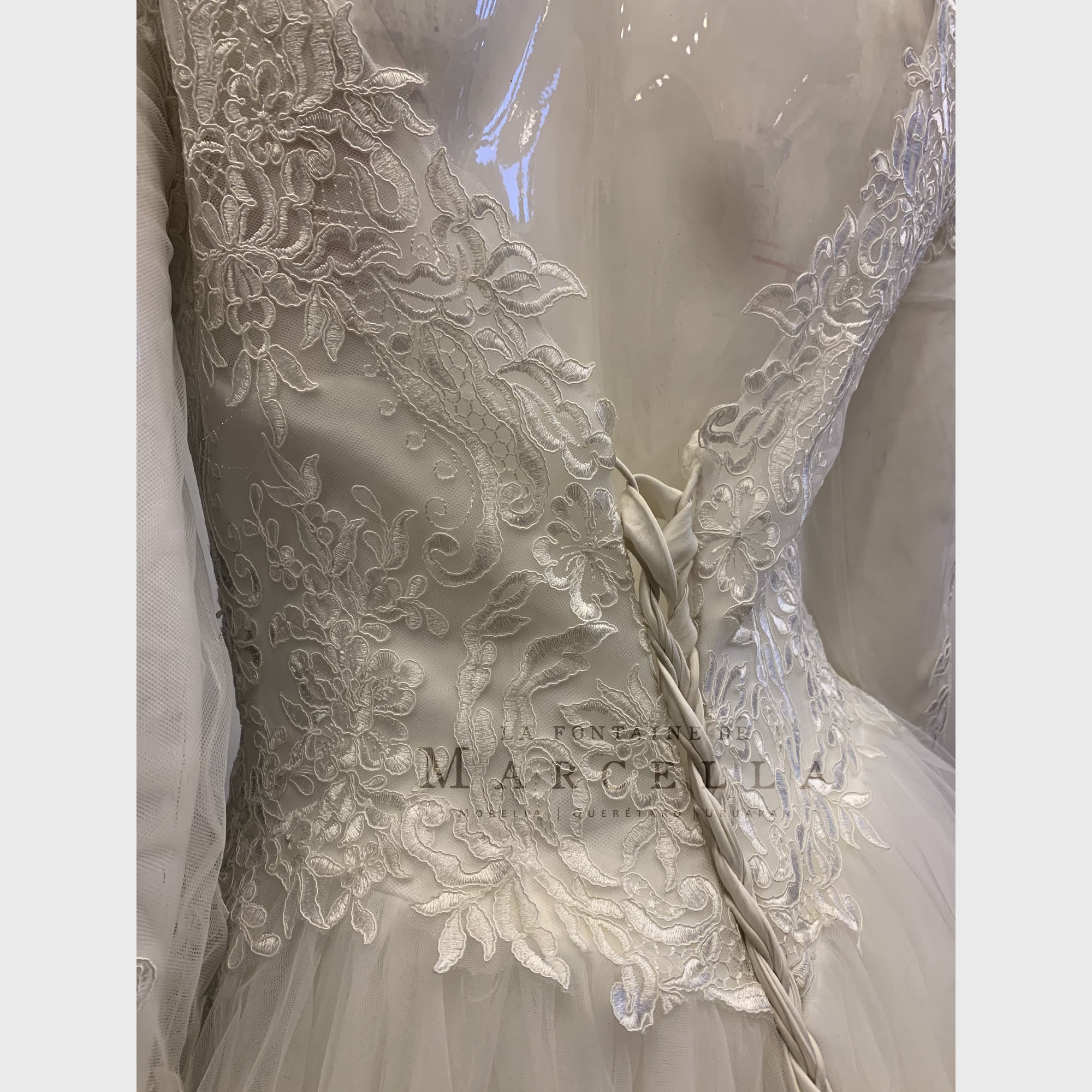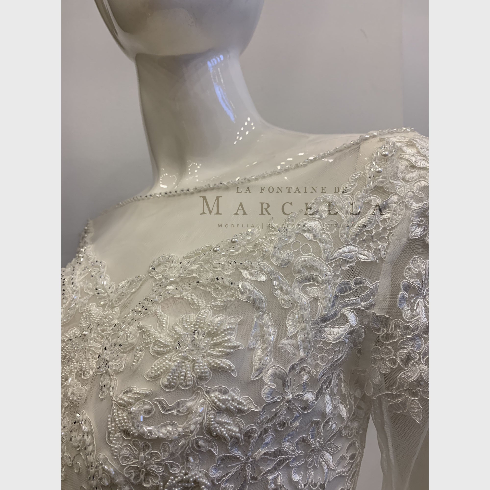 Vestido de Novia manga larga, con aplicaciones en encaje e inserción tipo malla en escote y mangas. Corte tipo A. Ideal para todo tipo de cuerpo.Leer más