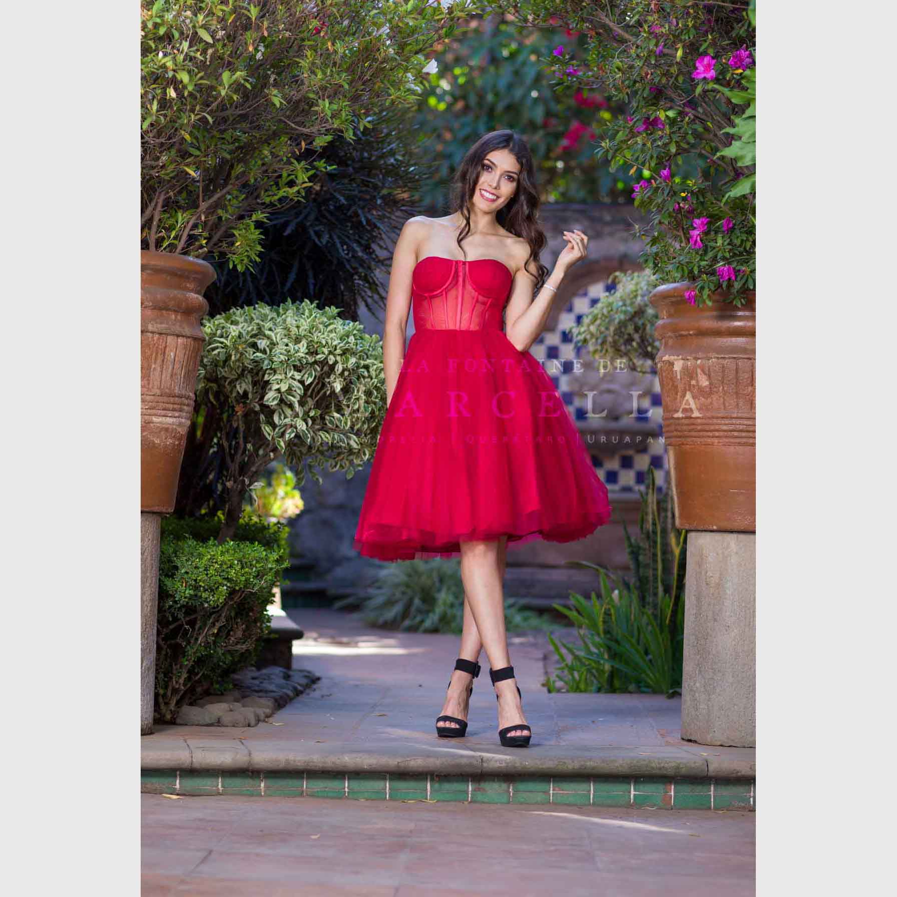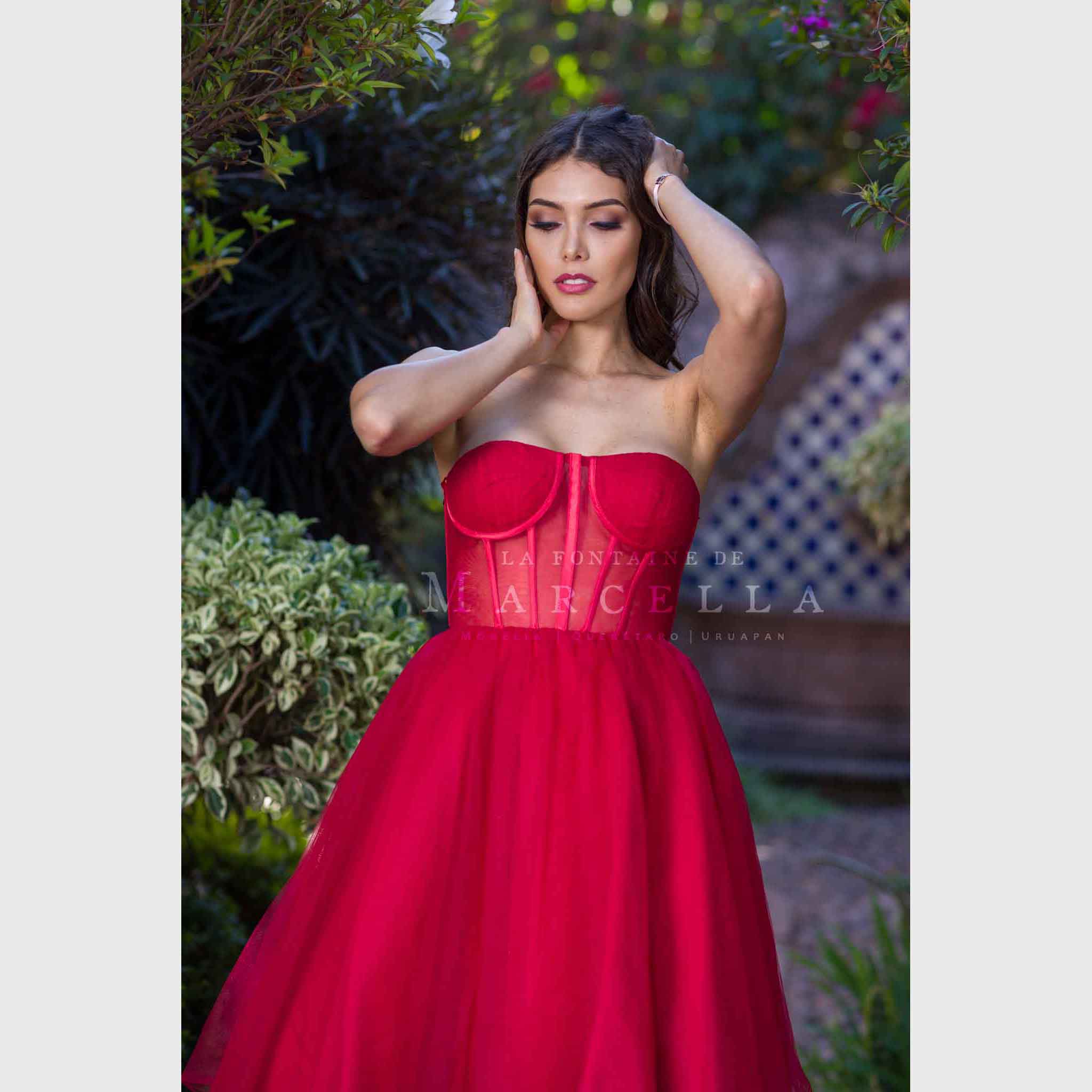 Vestido corto de tul con varilla y transparencia en la parte superior, recoemndado para cuerpos tipo Rectangulo y Triangulo Invertido.