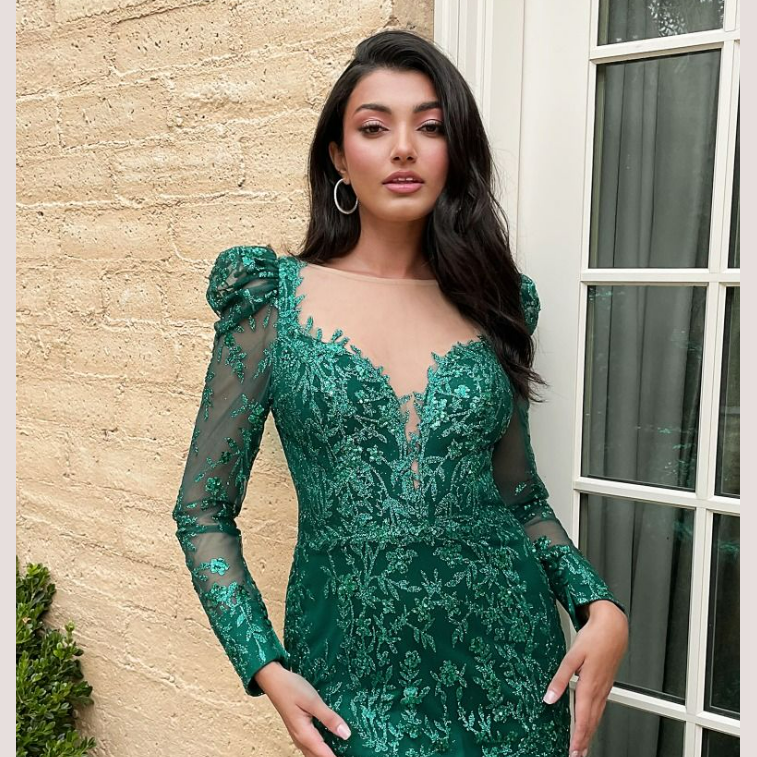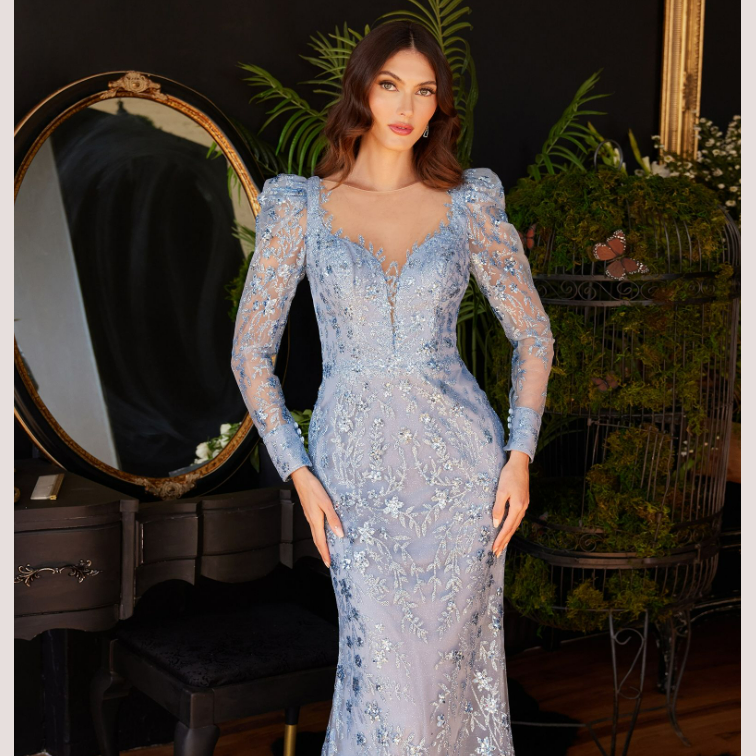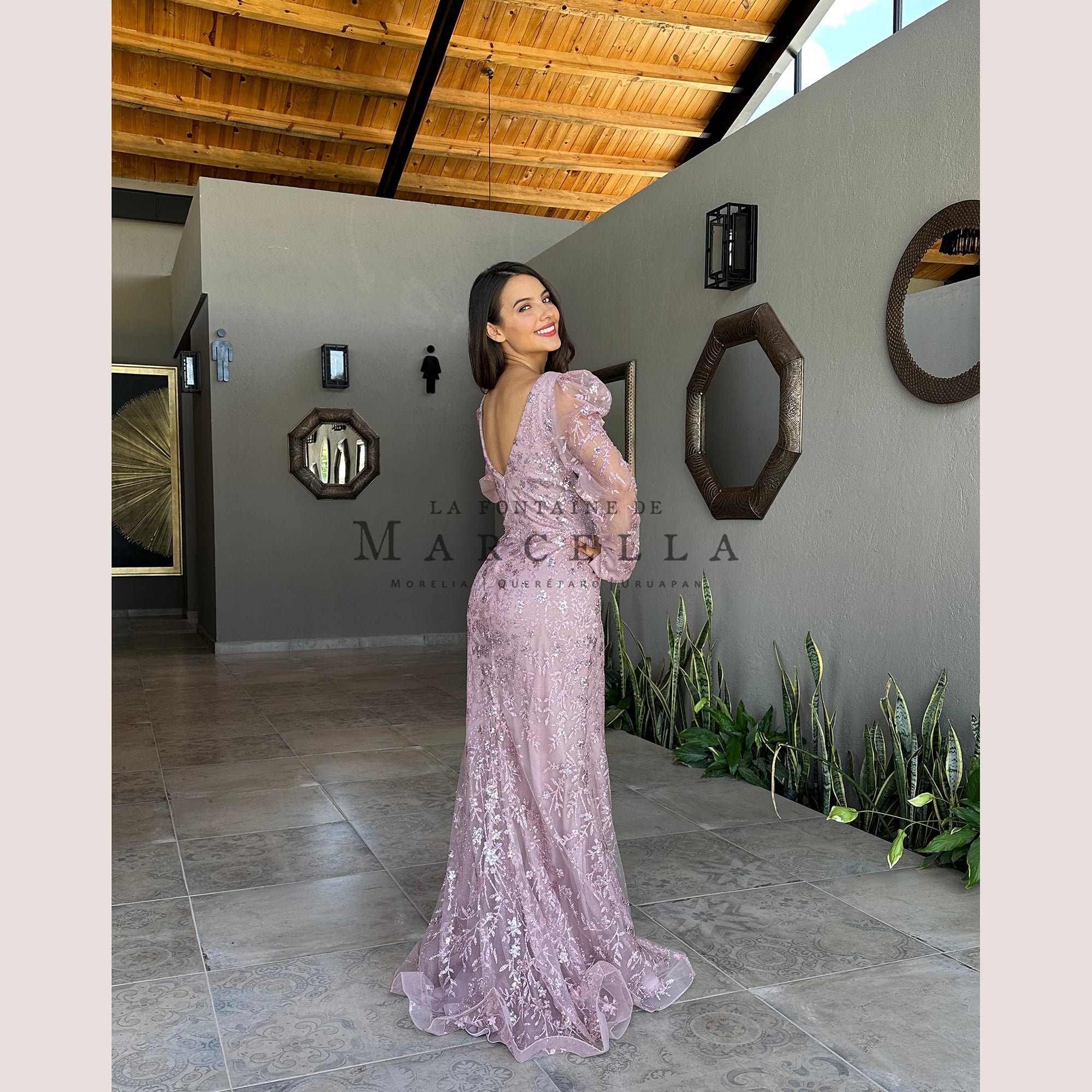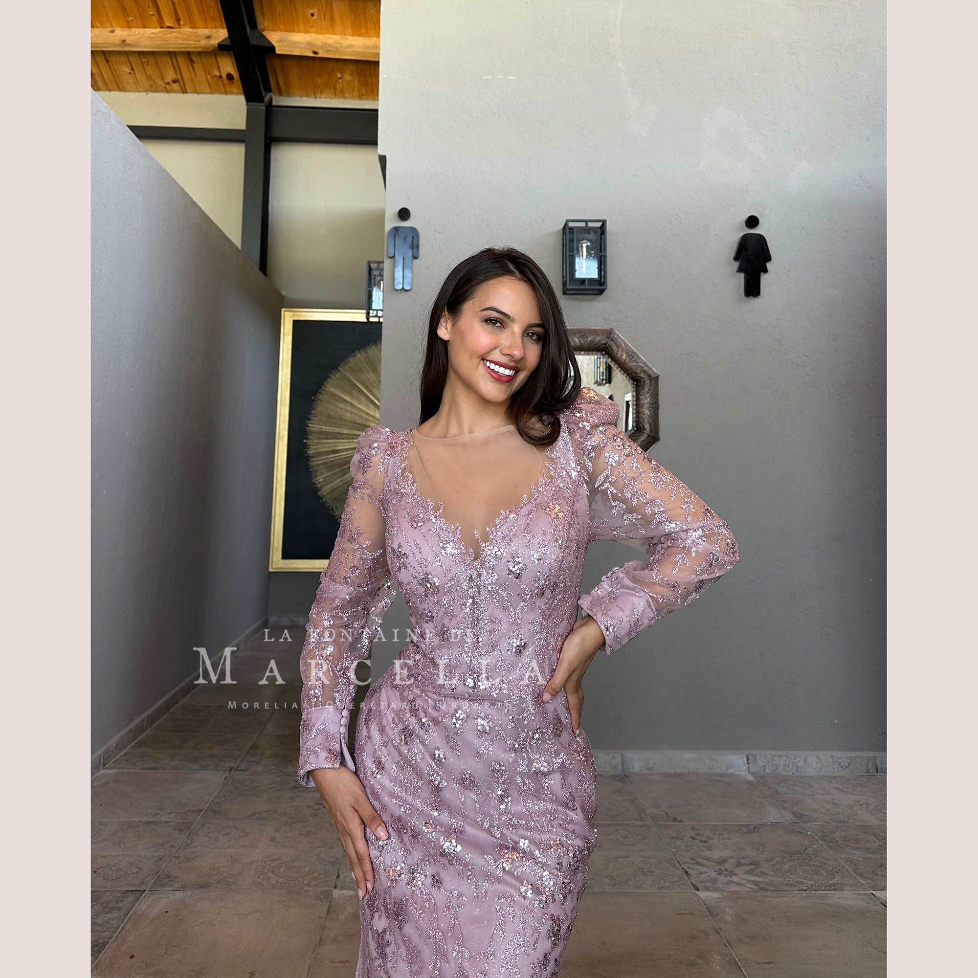Vestido corte sirena de manga larga adornado hermosamente con aplicación floral brillante es recomendado para cuerpos tipo Reloj de Arena y Pera.