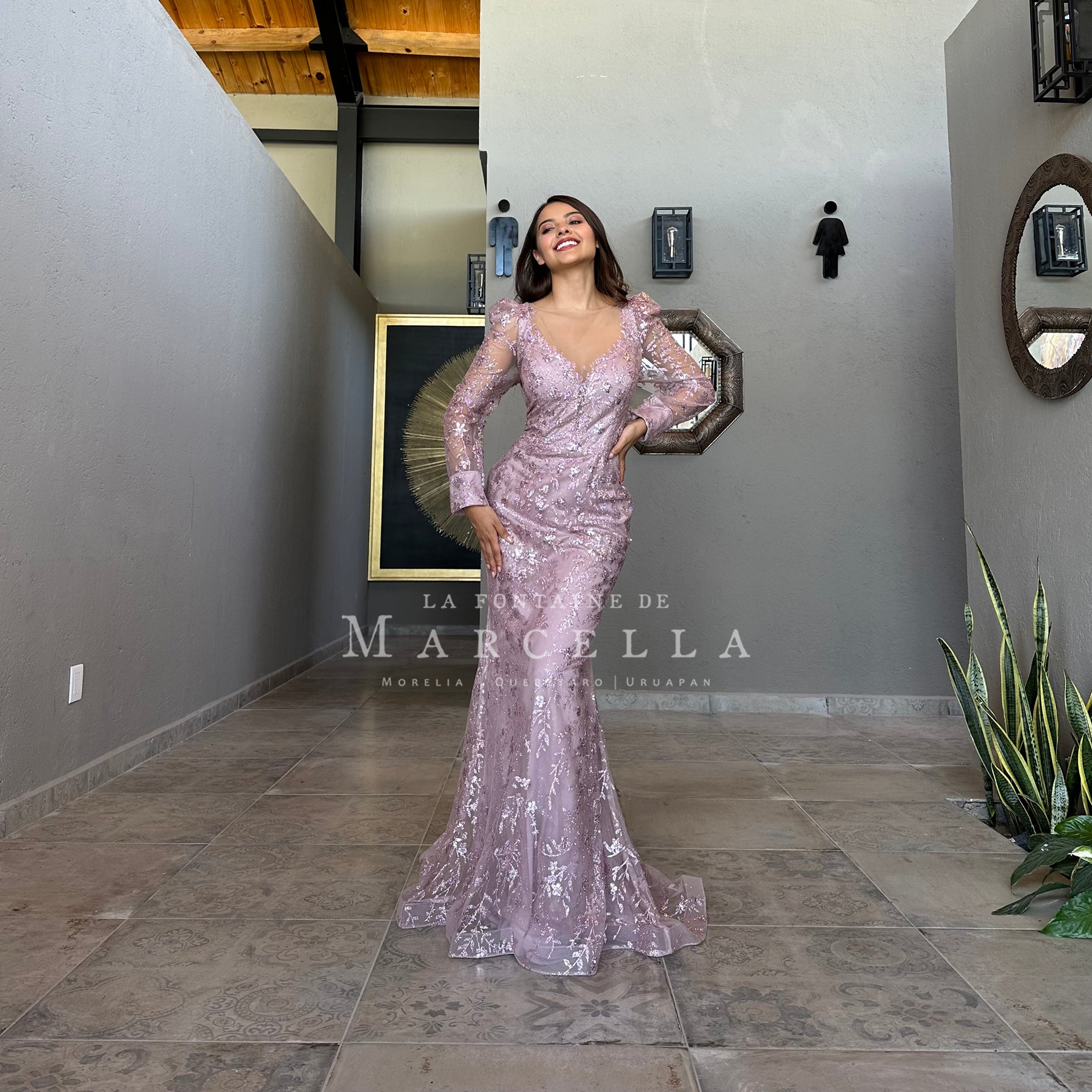 Vestido corte sirena de manga larga adornado hermosamente con aplicación floral brillante es recomendado para cuerpos tipo Reloj de Arena y Pera.Leer más